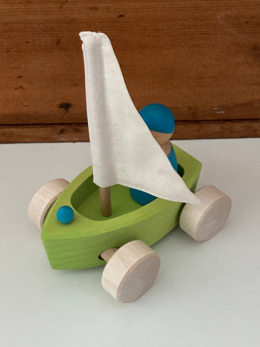 Wooden Toy - Grimm's SAILBOAT in GREEN, and SKIPPER in BLUE… on wheels!