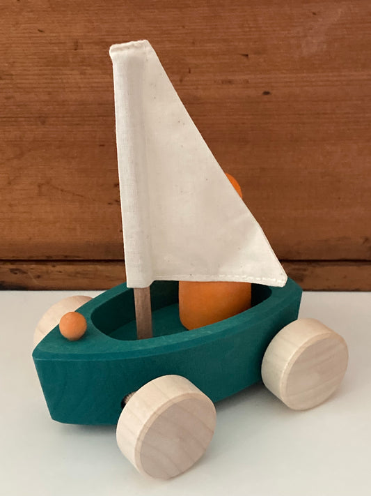Wooden Toy - Grimm's SAILBOAT in EVERGREEN and SKIPPER in ORANGE… on wheels!