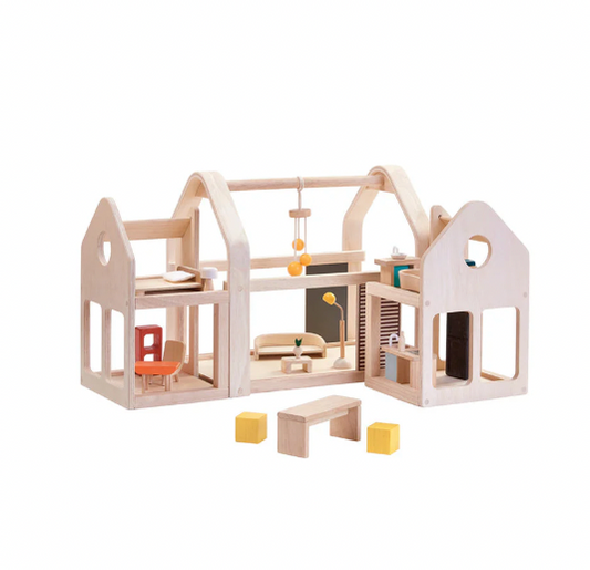 Wooden DOLLHOUSE, Compact SLIDE-&-GO with ALL FURNITURE, 20 pieces!