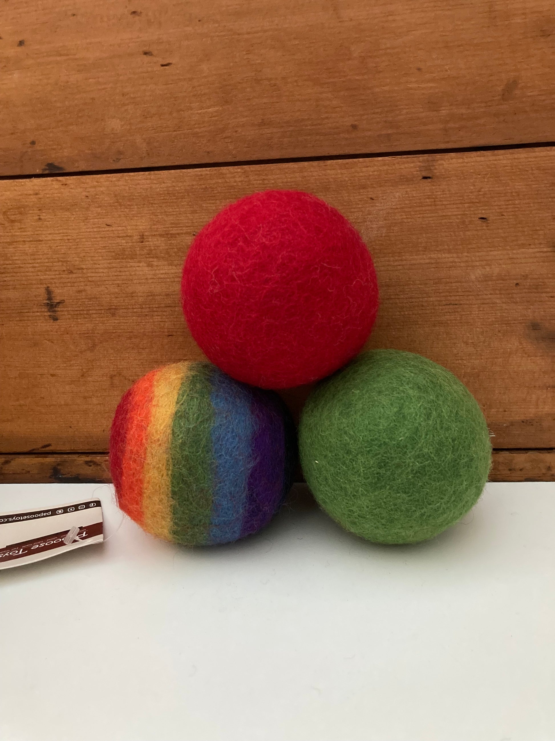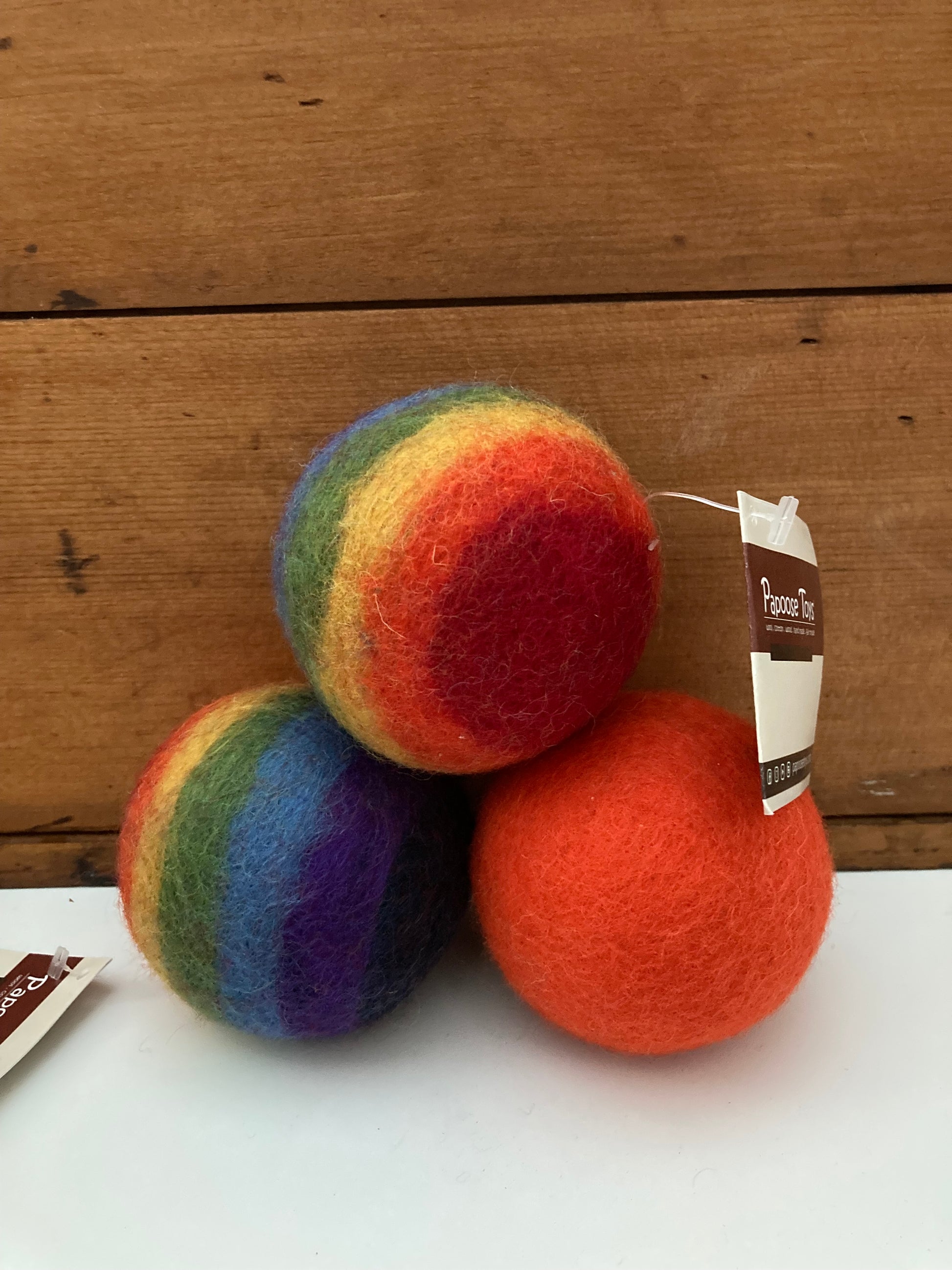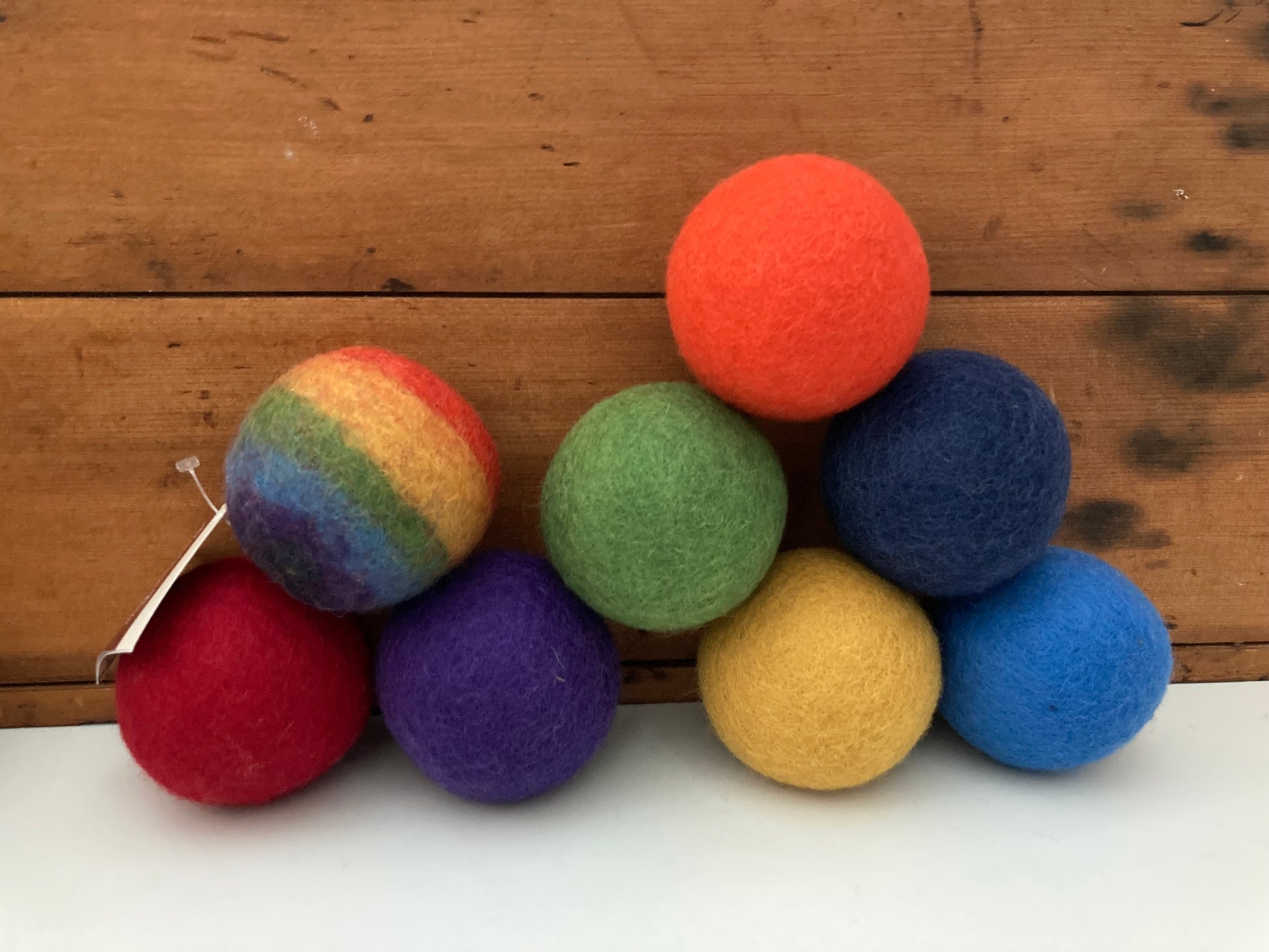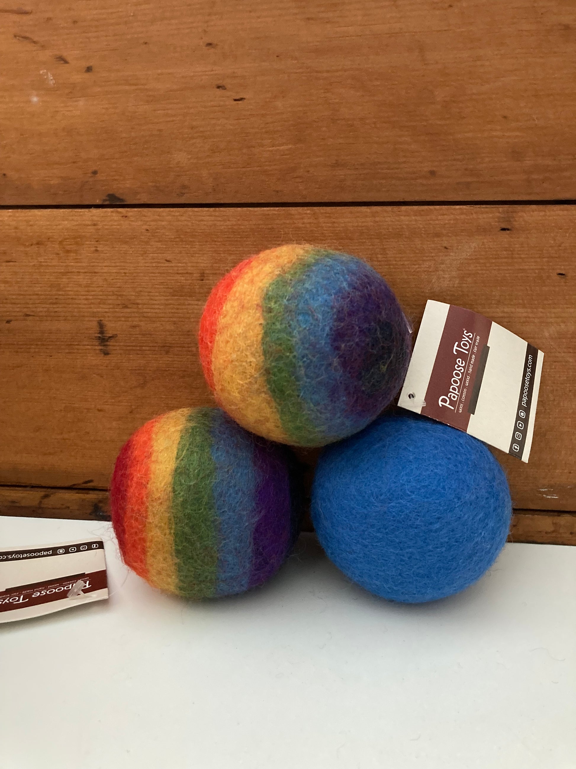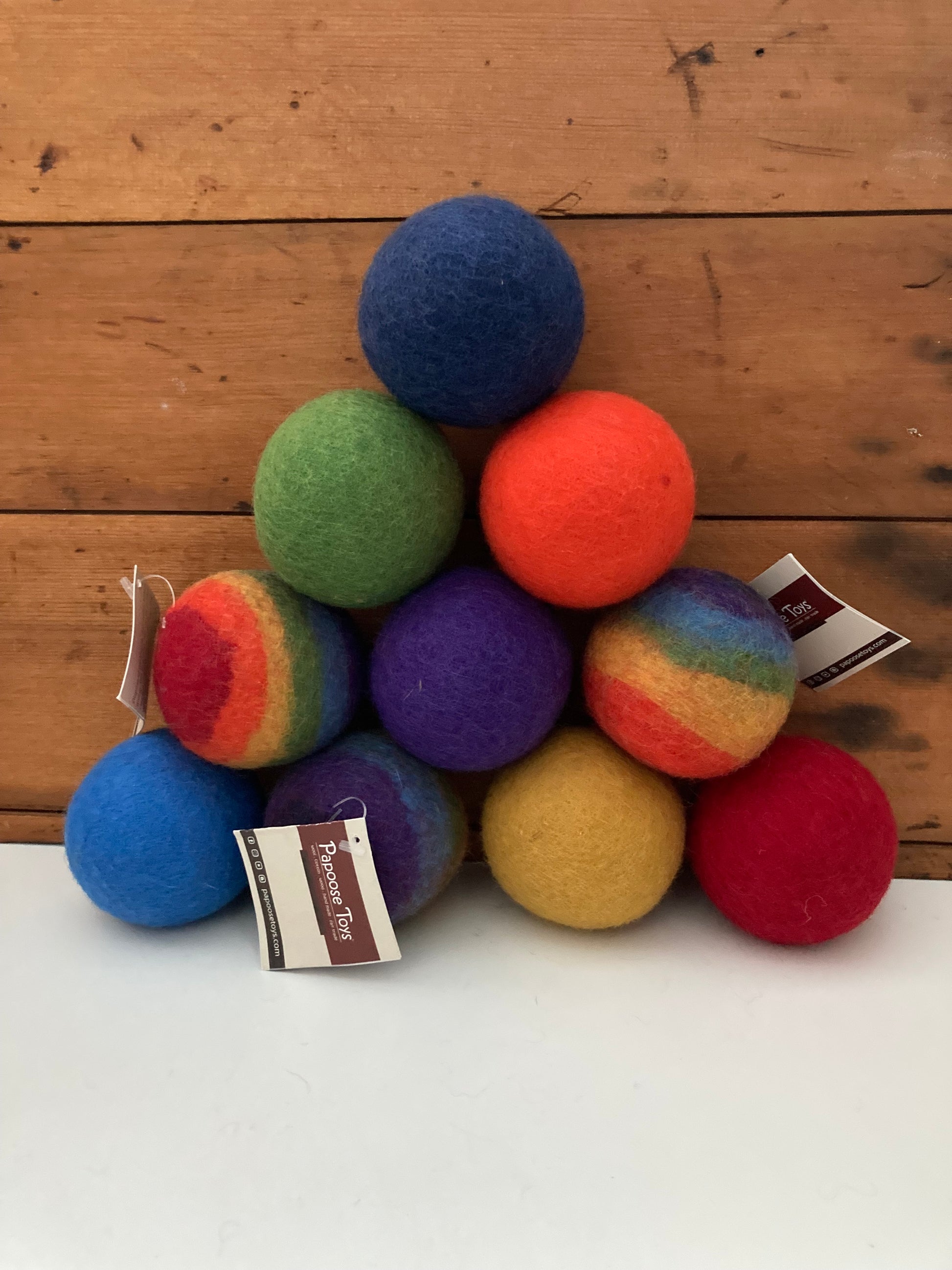 De Papoose Toys, fabriqué à la main par leur coopérative de femmes au Népal à partir de laine de mouton propre et équitable. Teint dans des couleurs RAINBOW et feutré à la main en boules solides de 7,5 cm (3 pouces).