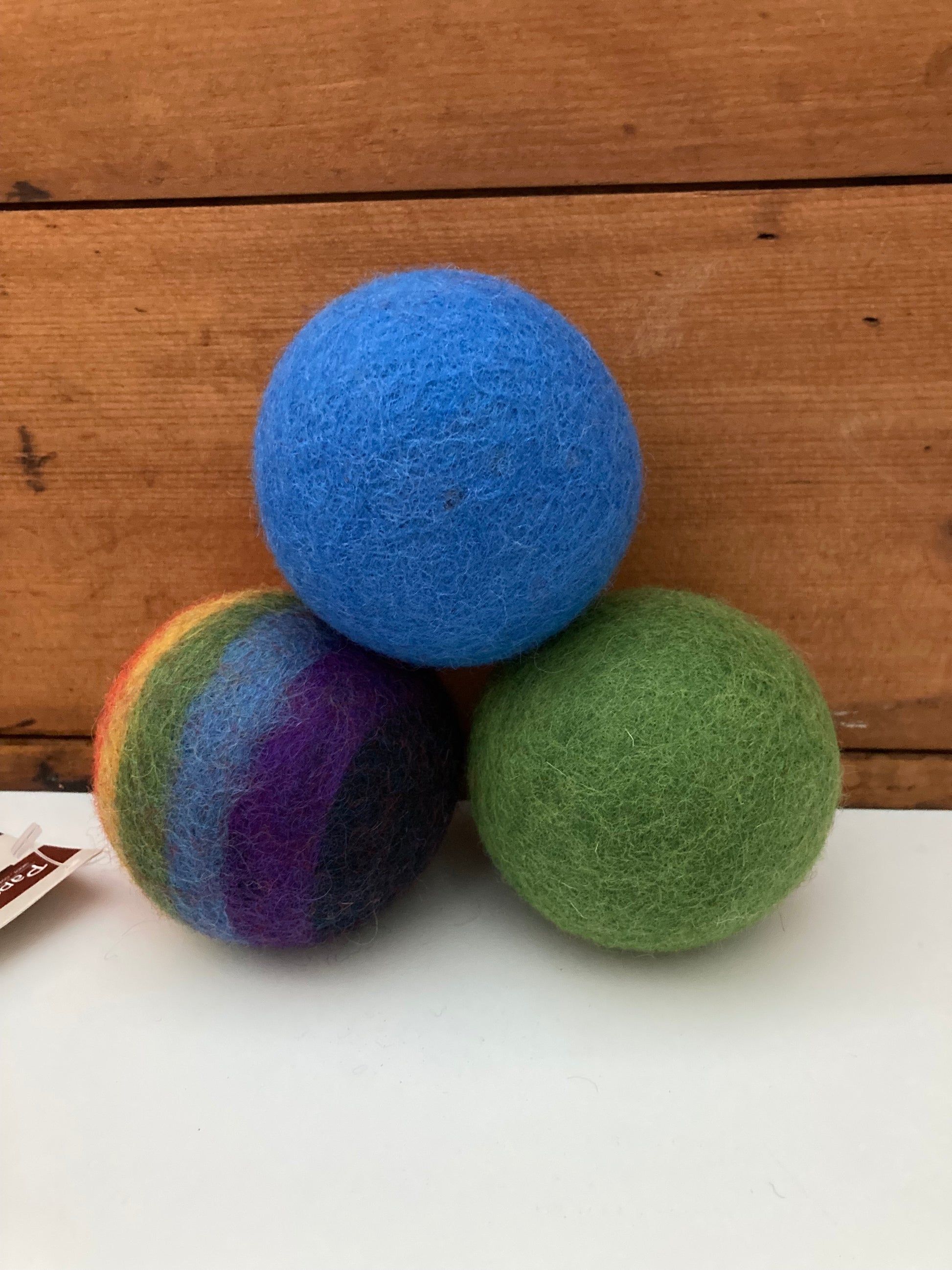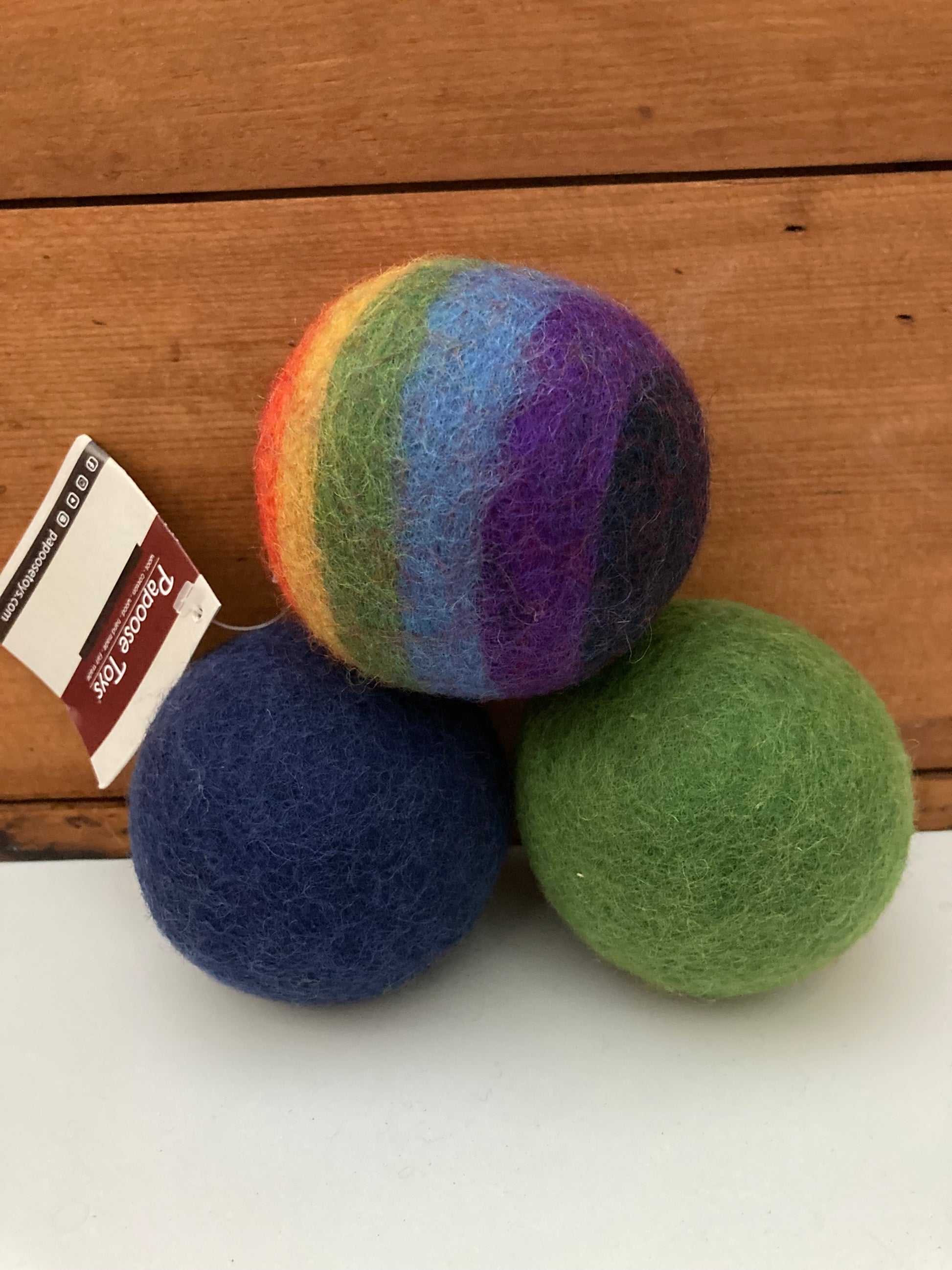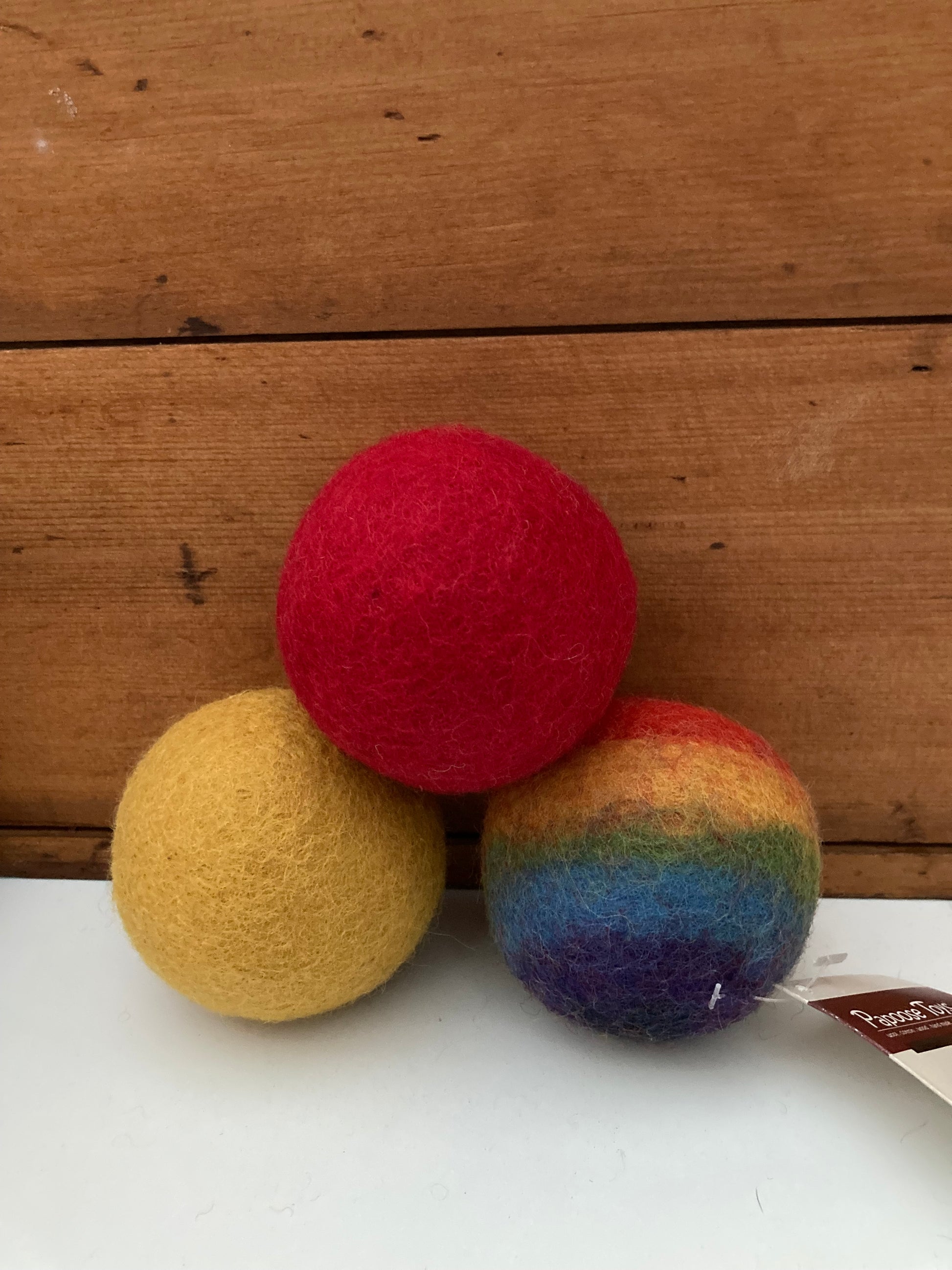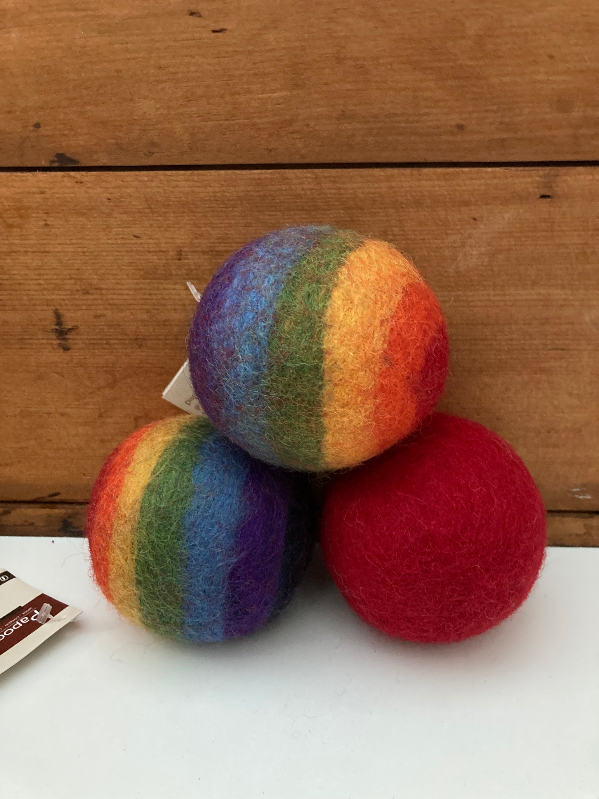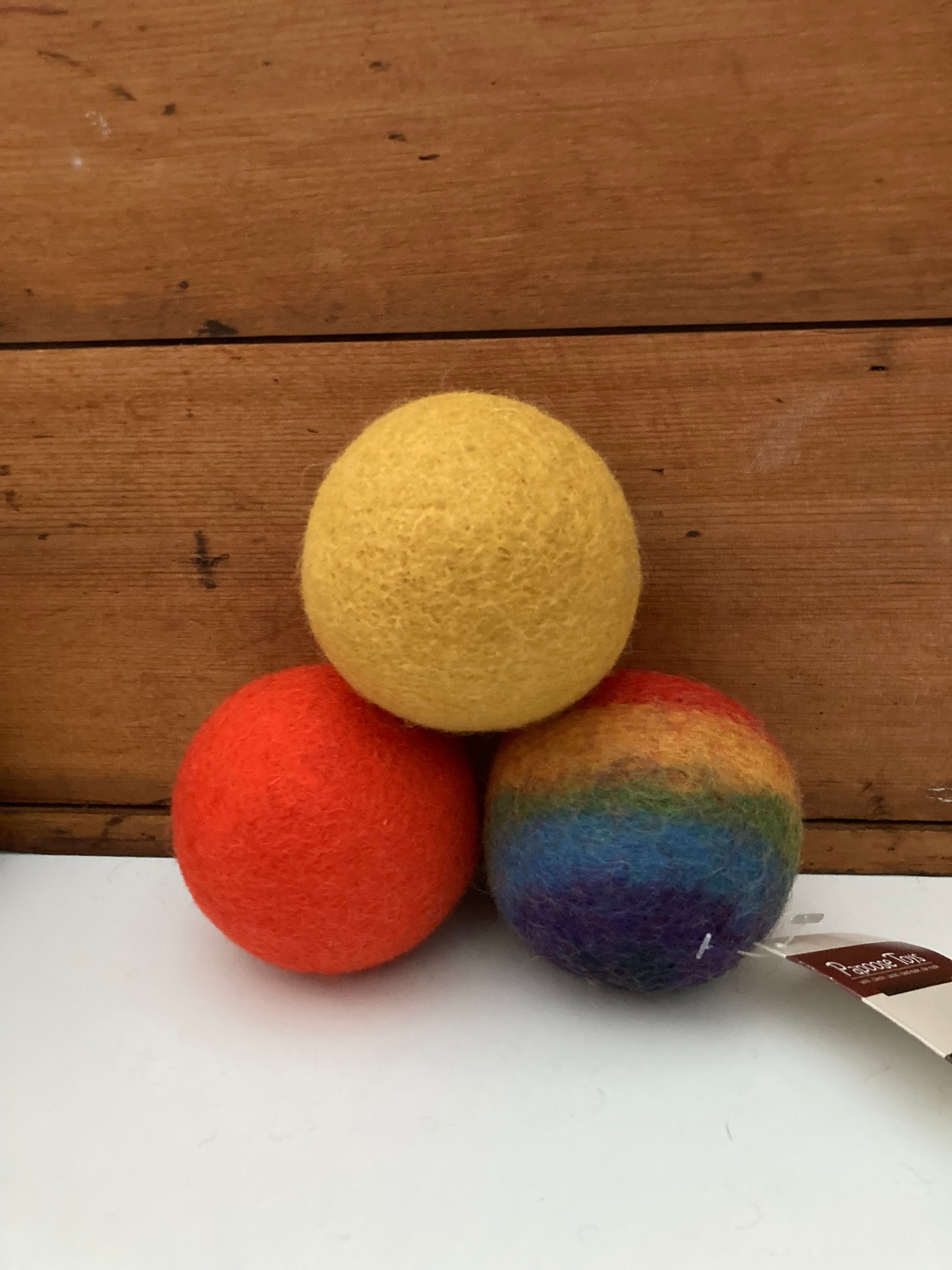 De Papoose Toys, fabriqué à la main par leur coopérative de femmes au Népal à partir de laine de mouton propre et équitable. Teint dans des couleurs RAINBOW et feutré à la main en boules solides de 7,5 cm (3 pouces).