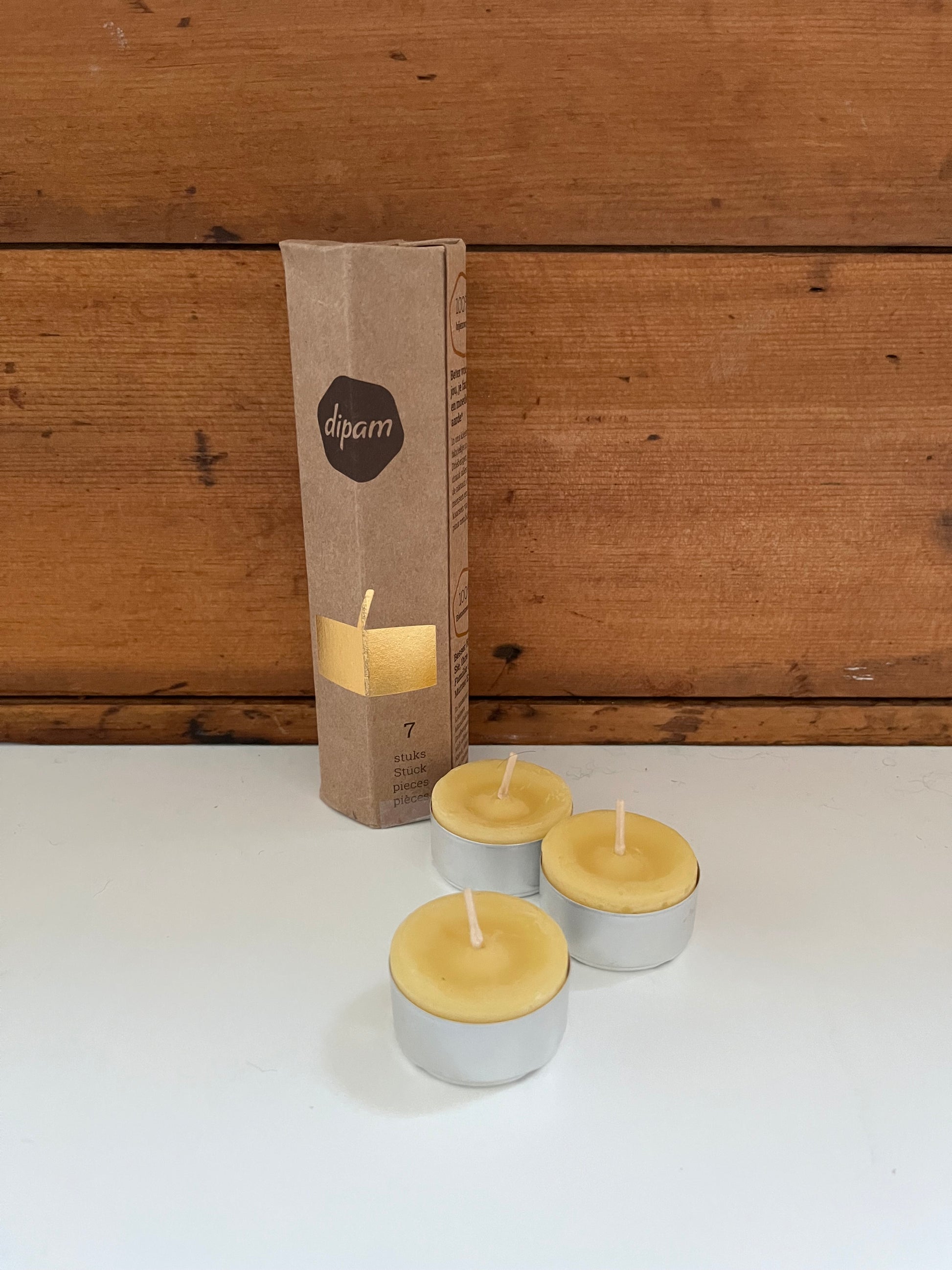 7 bougies chauffe-plat dans une pochette en carton. Consultez notre collection de bougies en cire d'abeille pour d'autres choix de bougies.