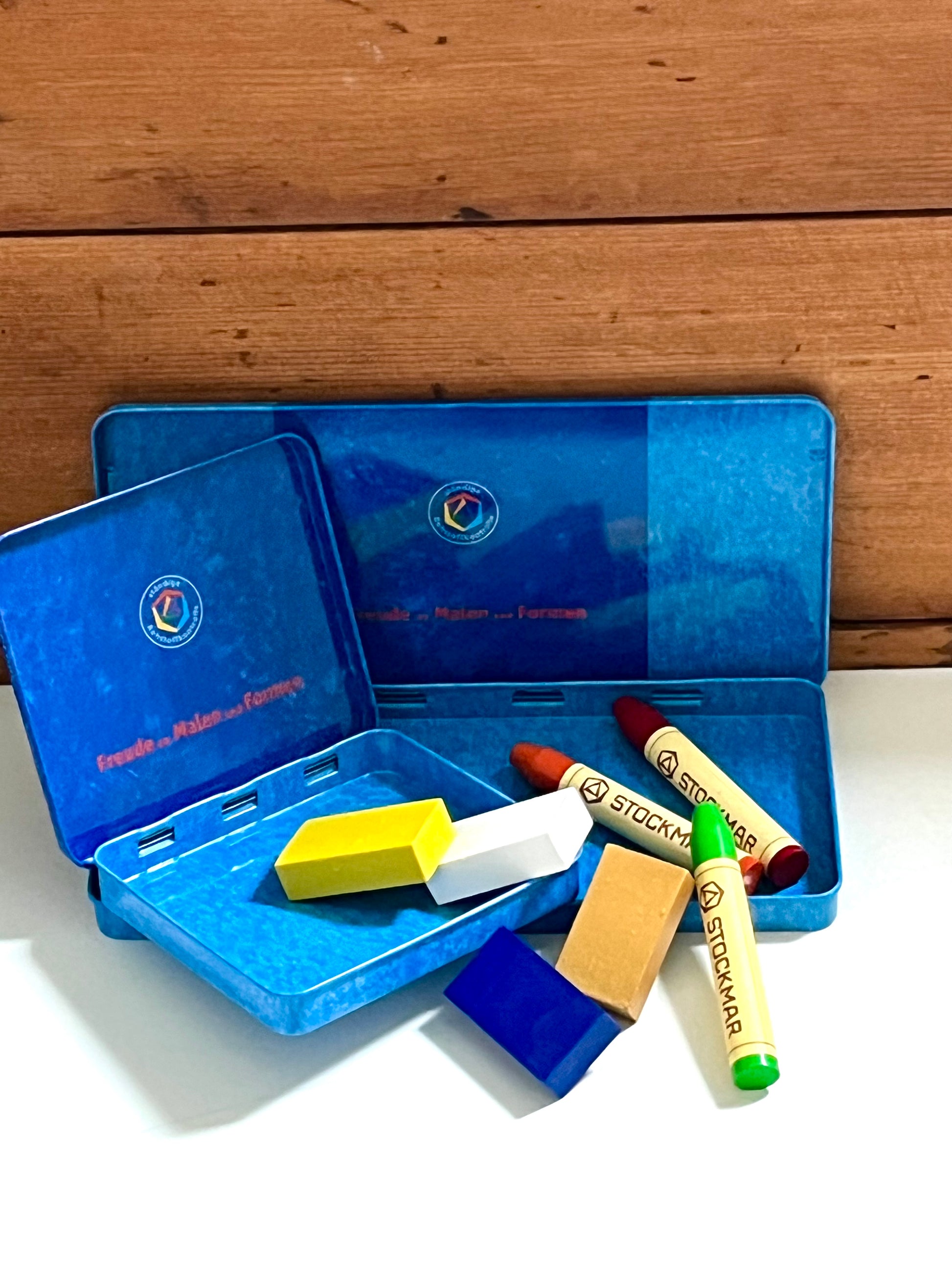 Une boîte souvenir vide pour votre choix de 8 ou 16 couleurs de crayons en bloc de cire d'abeille Stockmar ou de crayons en bâton Stockmar.