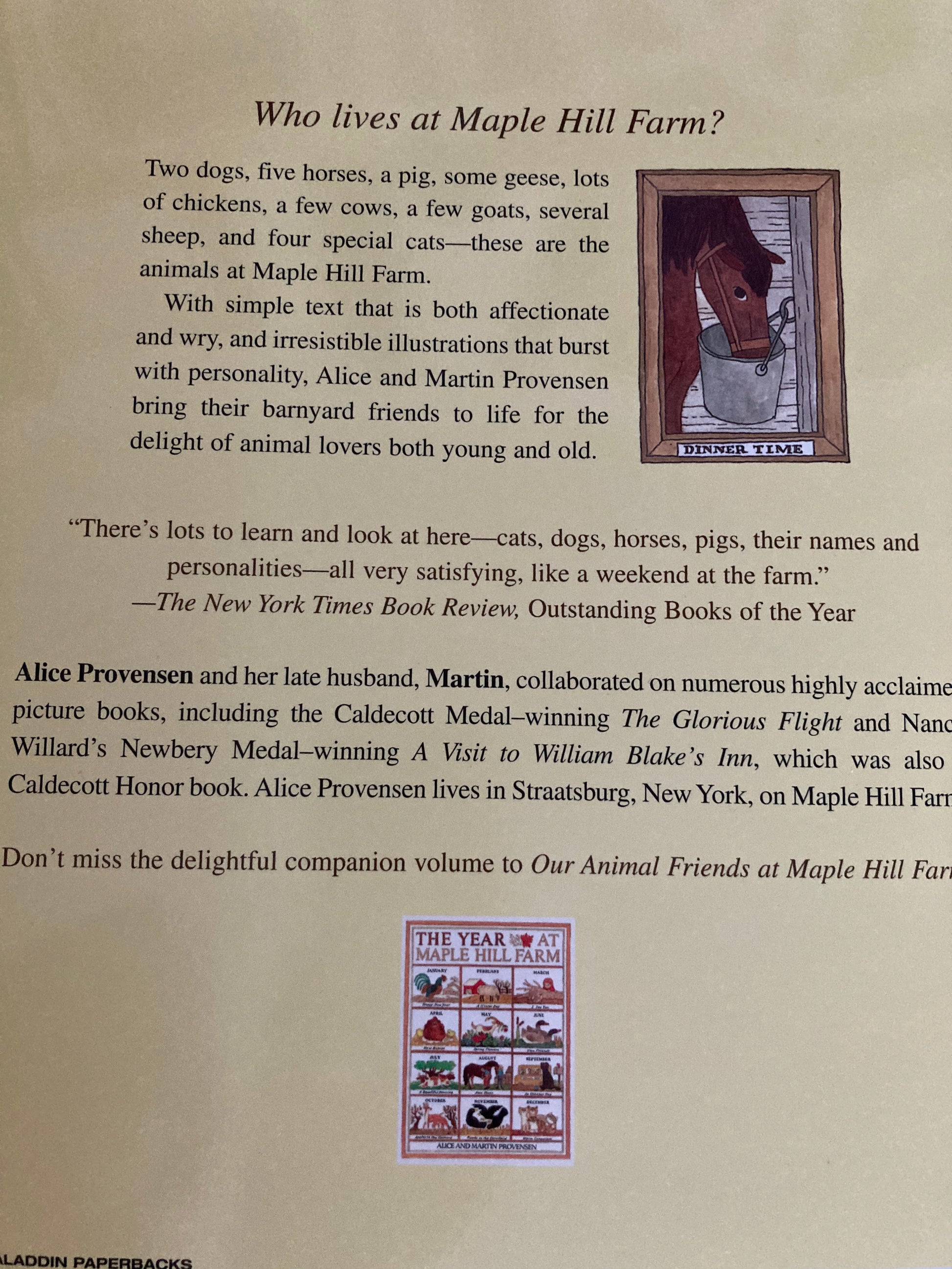 Alice et Martin Provensen ont écrit sur leur propre ferme, Maple Hill Farm, et sur leurs amis animaux bien-aimés qui vivent avec eux. Les enfants adoreront découvrir la vie à la ferme, et peut-être plus encore, ils adoreront les différentes personnalités animales ! Texte doux et humoristique et illustrations irrésistibles. Et des noms d'animaux rigolos !