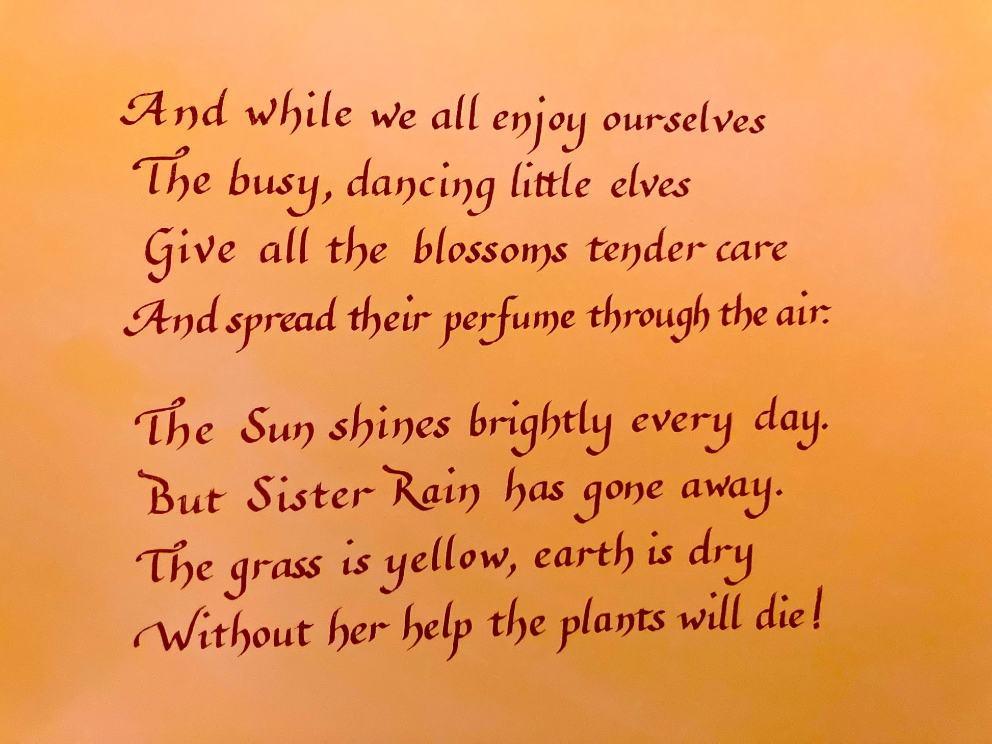 "Et pendant que nous nous amusons tous, les petits elfes occupés à danser prennent soin de toutes les fleurs et répandent leur parfum dans l'air."