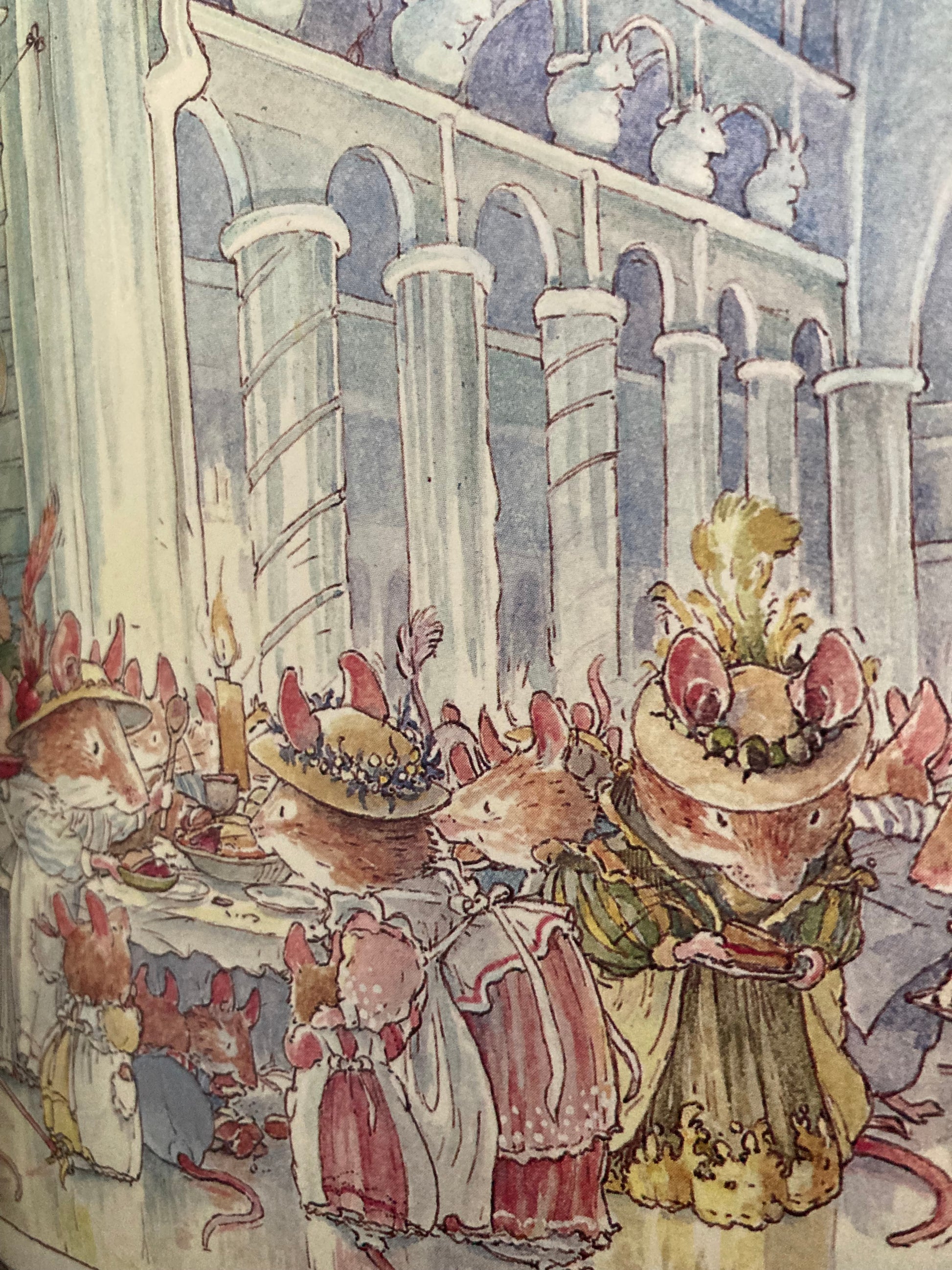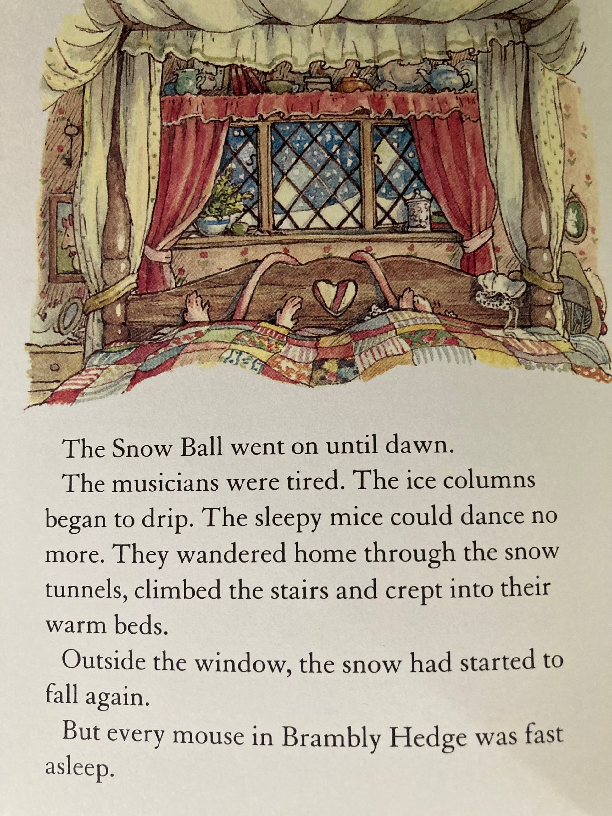 L'HISTOIRE D'HIVER à BRAMBLY HEDGE commence en plein hiver et il faisait très, très froid. Les souris de Brambly Hedge avaient prévu de la neige, et elles avaient raison. Au matin, ils se réveillèrent et trouvèrent leurs portes et fenêtres cachées derrière de profondes congères. Il n'y avait pas eu de neige pareille depuis des années. "Il y en a assez pour une boule de neige !" » crièrent les souris avec joie, et se mirent au travail, de la manière habituelle, pour construire une salle de glace pour les festivités. Les petites souris regardaient avec de grands yeux pendant que tous les préparatifs étaient faits. Alors, tout fut enfin prêt et le bal put commencer.