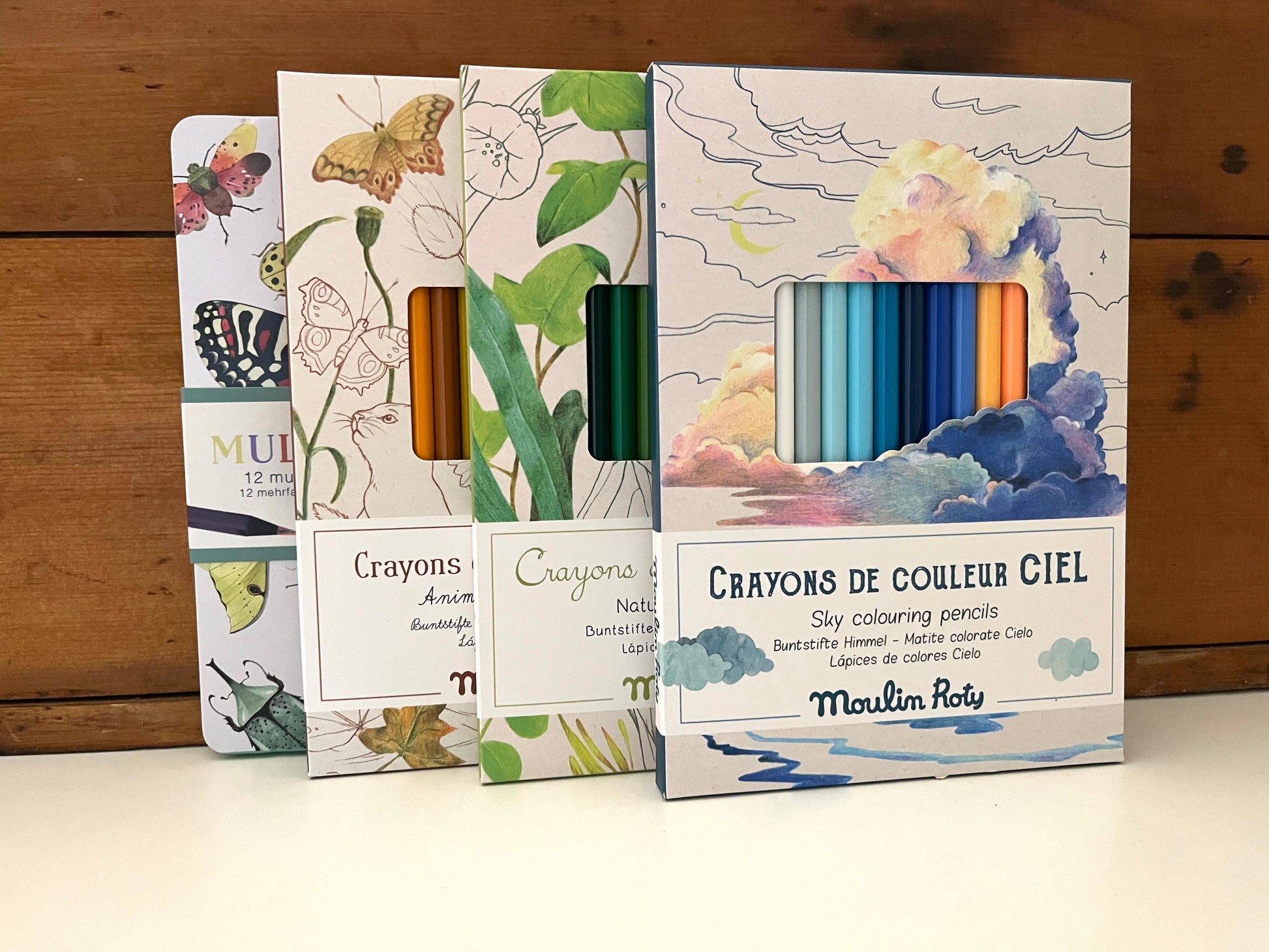 12 beautiful wood ANIMAL themed colours COLOURING PENCILS from the Botanist line of products from Moulin Roty, Educational Toys. Will work perfectly to colour the large floor posters, sold separately, of their FOREST SCENE and their EXPLORATION SCENE.