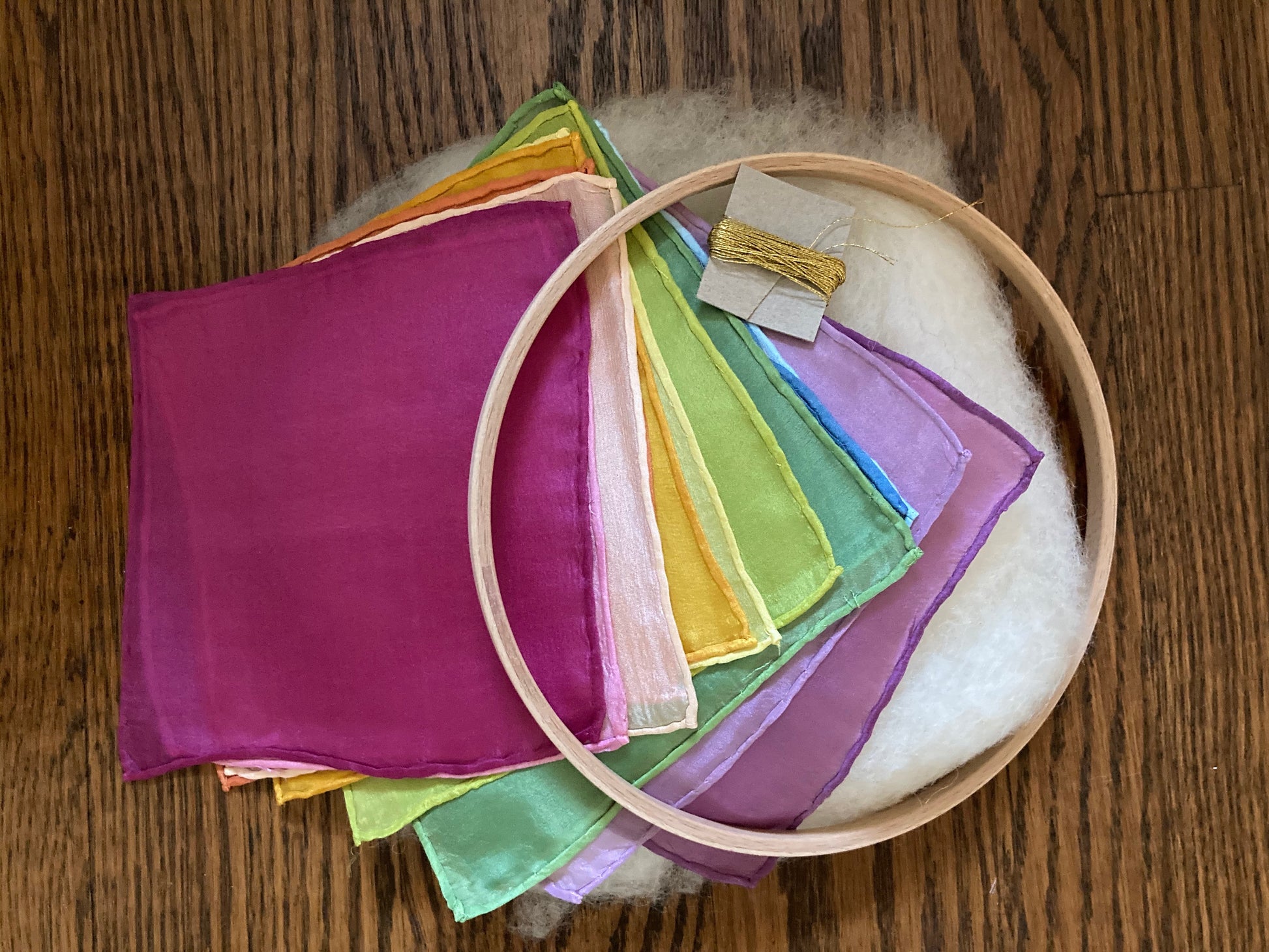Un projet d'artisanat simple de Filges Woll Manukaktur en Allemagne, connu pour ses kits d'artisanat en laine et en soie de qualité. Aucun outil nécessaire. Tout inclus : fil d'or. 12 belles pièces en soie, toutes joliment ourlées, 100% SOIE en DOUZE COULEURS. Toison de mouton 100% propre pour rembourrer les têtes de fées. Un cerceau en bois pour accrocher vos fées terminées.