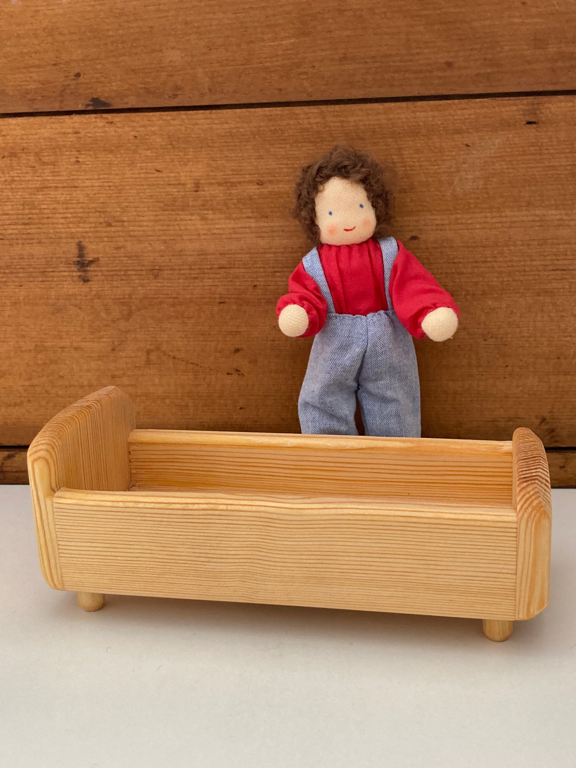 Un magnifique LIT DE POUPÉE EN BOIS massif, fabriqué par Debresk Toys en Suède.