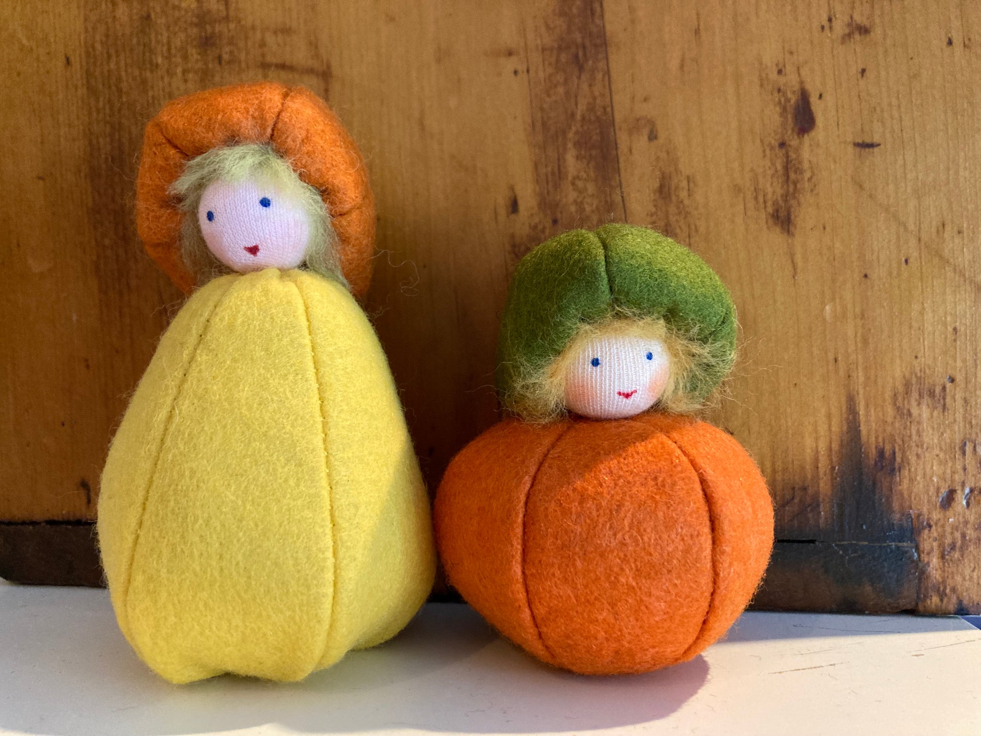 POUPÉES SQUASH CHILDREN superbement détaillées, parfaites pour les tables nature, les spectacles de marionnettes ou les jeux doux dans une maison de poupée. Bien que leurs fesses soient légèrement arrondies, ils restent debout tout seuls. Tous les bonnets et corps sont faits à 100 % de feutre de laine et cousus solidement. Rien n'est amovible.
