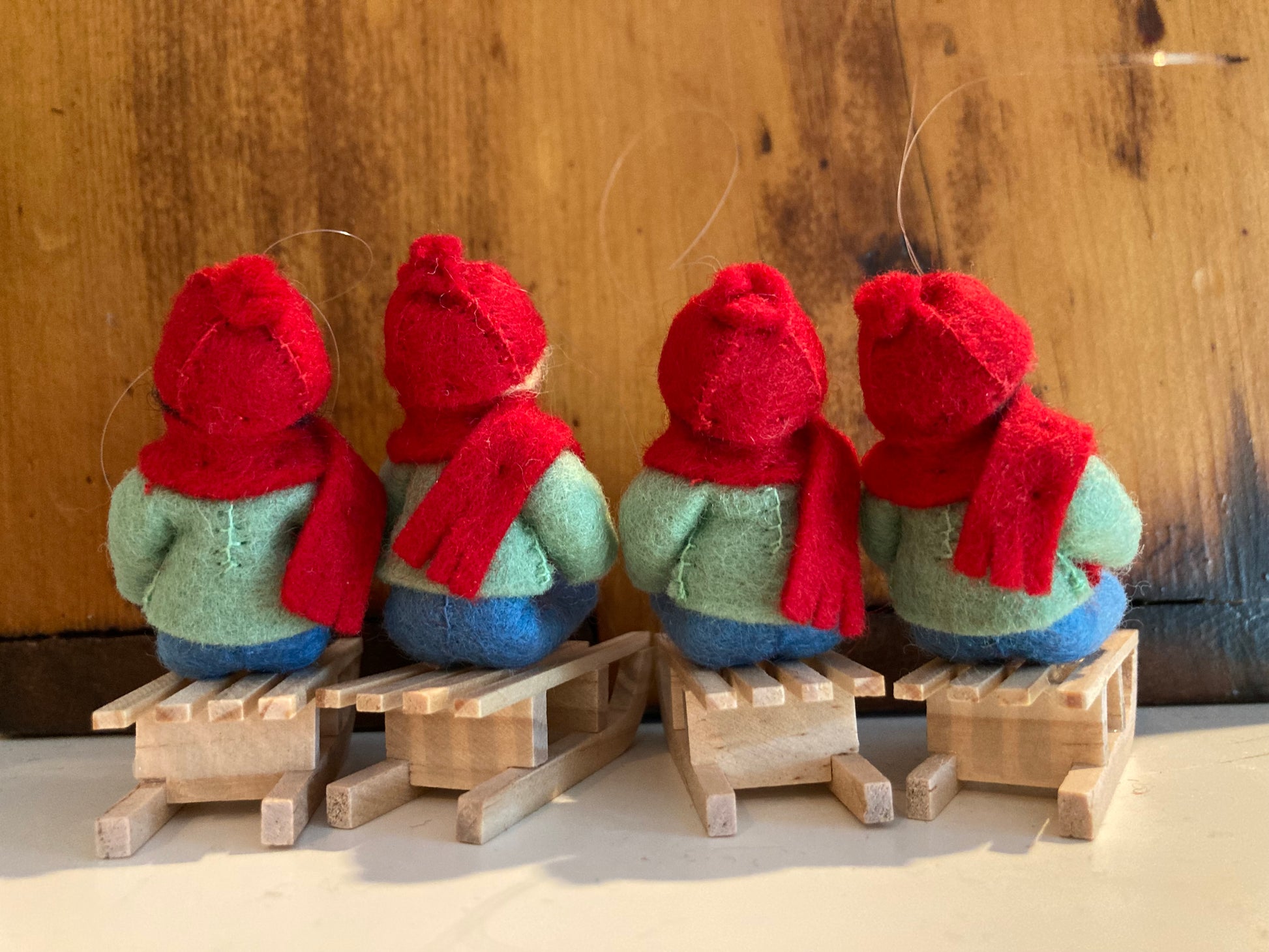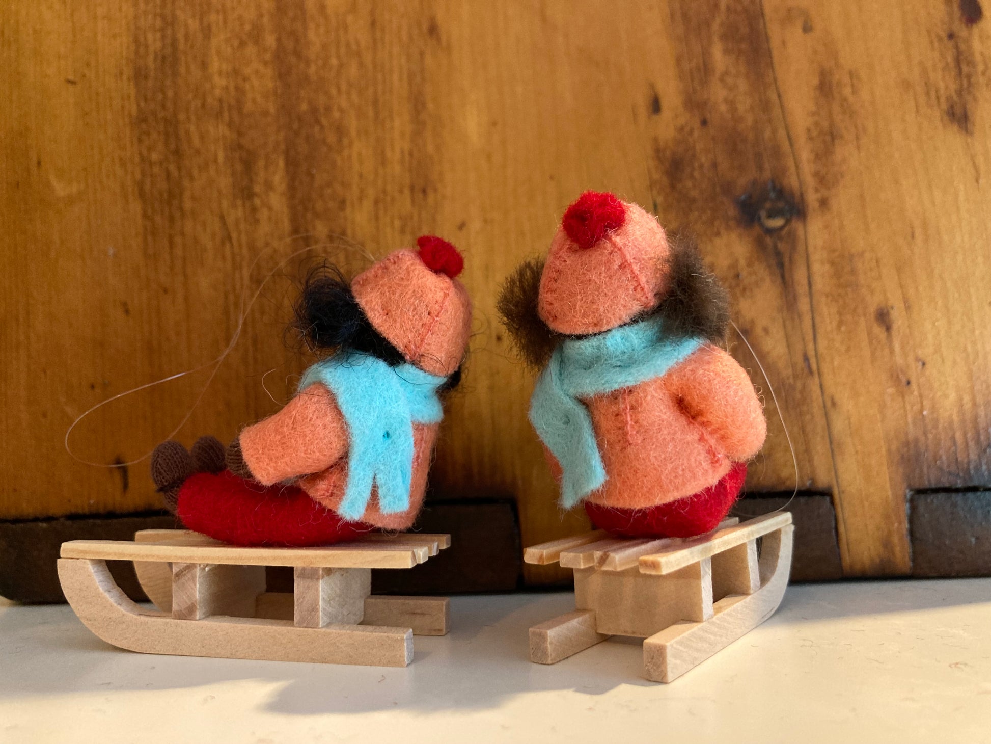 Un fin fil de suspension doré est attaché à chaque poupée afin qu'elles puissent être utilisées comme décorations suspendues, si vous le souhaitez. Les luges sont de véritables toboggans en bois !