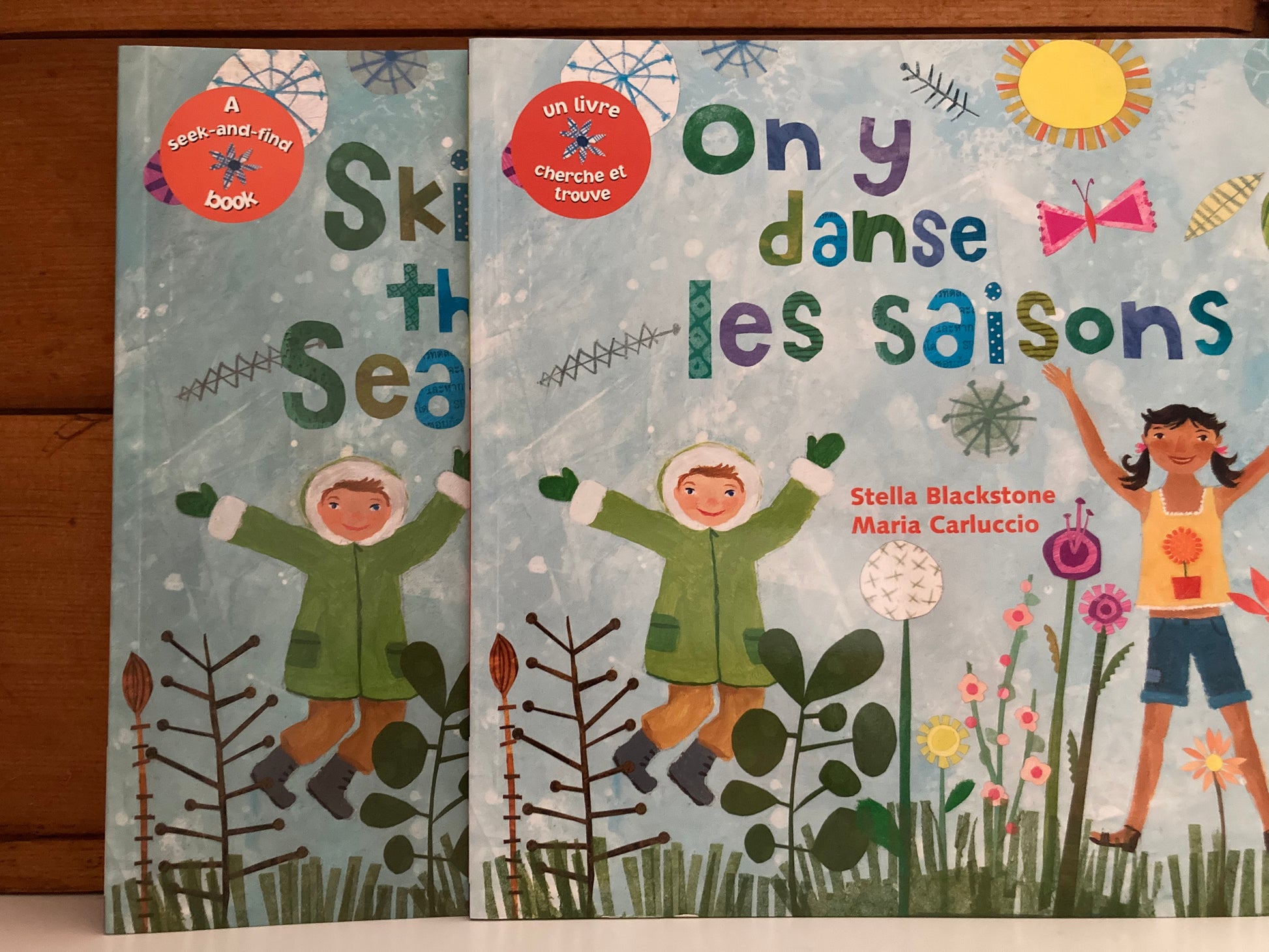 Écrit par Stella Blackstone et illustré de peintures amusantes et colorées ressemblant à des collages de Maria Carluccio. L'édition française, ON Y DANSE LES SAISONS , est vendue séparément.