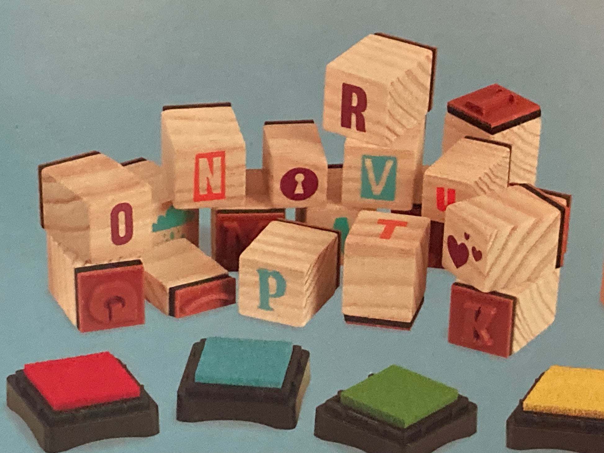 Un ensemble de tampons à lettres et chiffres en bois avec 4 tampons encreurs, comprend :