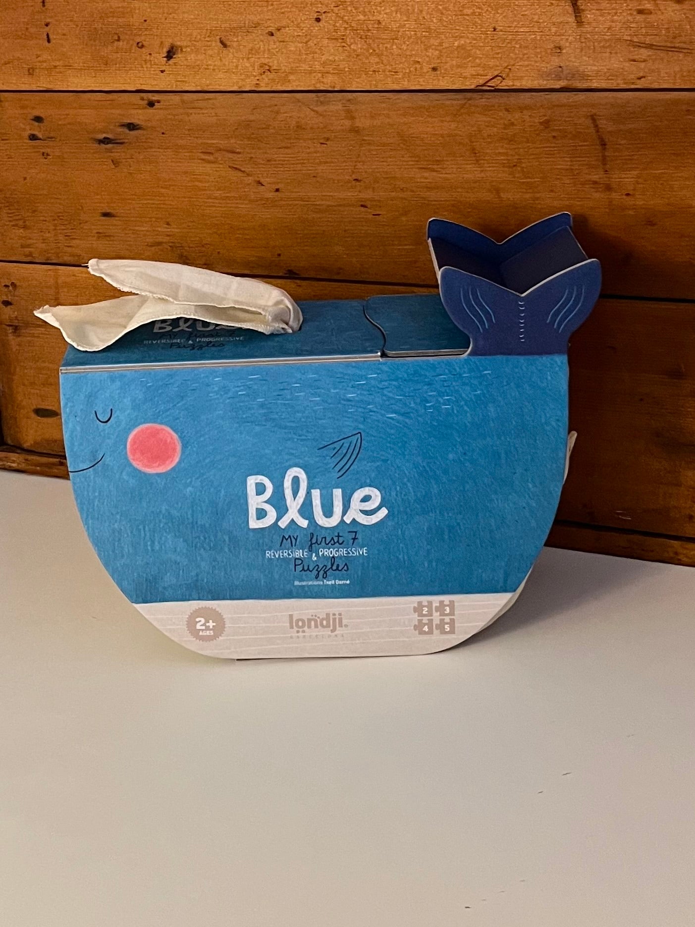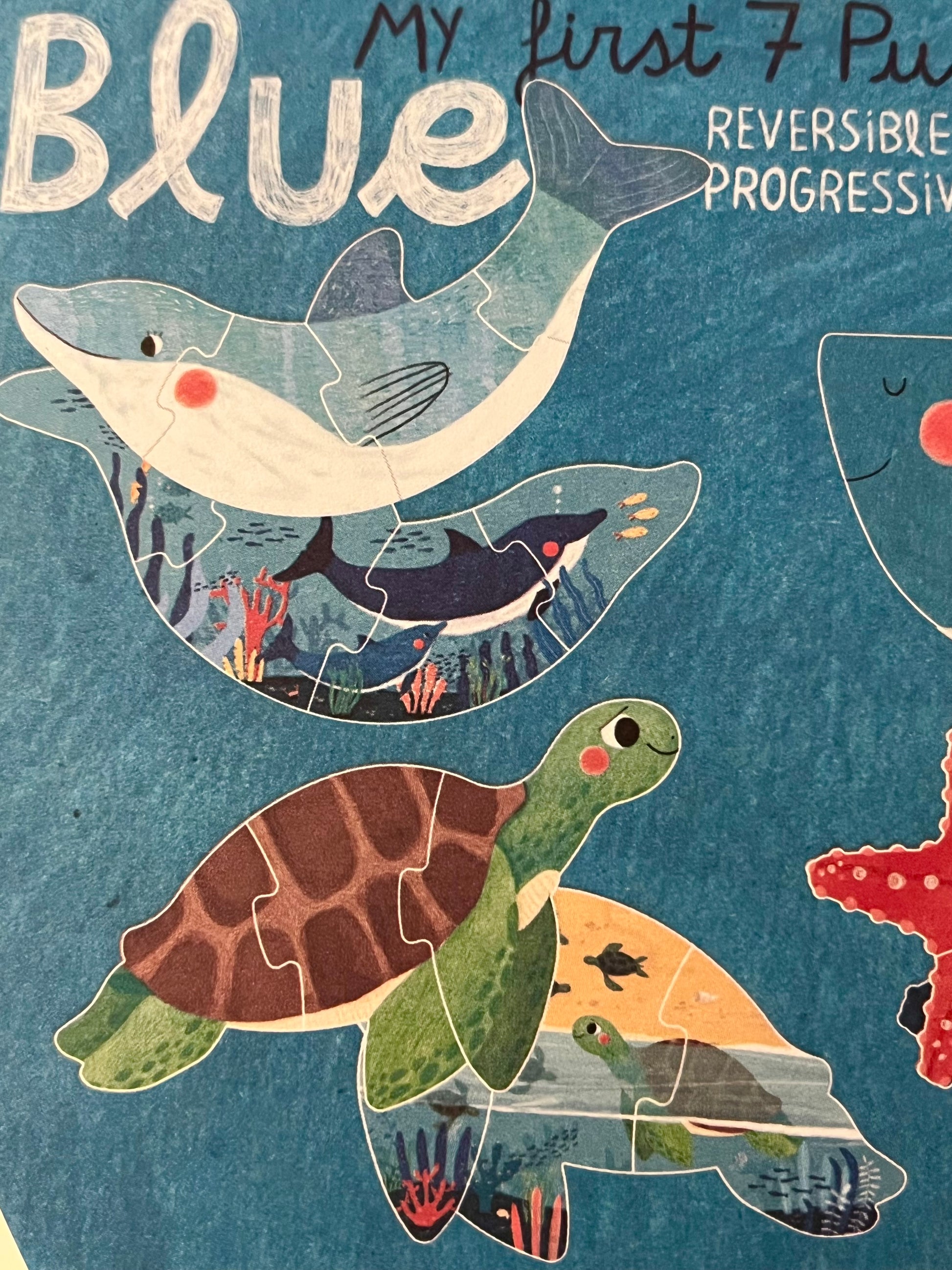 BLUE WHALE PUZZLE is a clever, simple, fun 7 reversible and progressive puzzles with 2, 3, 4, and 5-piece figures for little ones to discover sea animals! Ideal as a first puzzle.