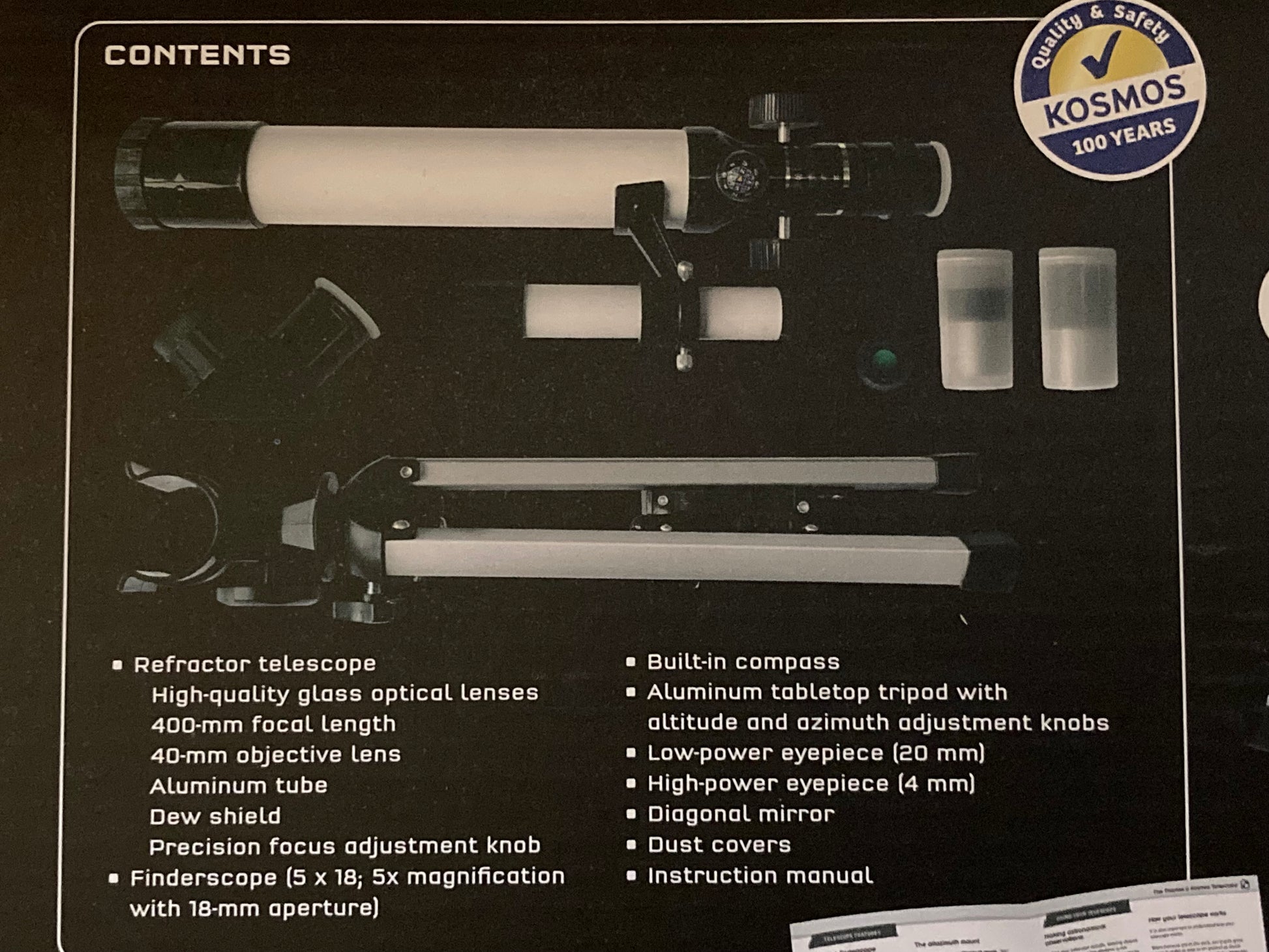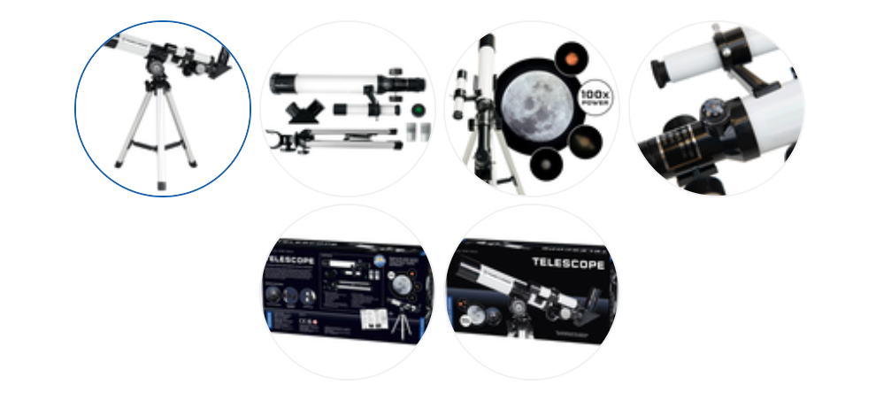 Jetez votre dévolu sur la Lune et le système solaire avec cet excellent TÉLESCOPE RÉFRACTAIRE RÉEL DE TRAVAIL d'entrée de gamme avec 100xpuissance.Il s'agit d'un télescope réfracteur avec des lentilles optiques en verre de haute qualité, une distance focale de 400 mm, un objectif de 40 mm, dans un tube en aluminium, avec un pare-buée, un bouton de réglage de mise au point de précision, un chercheur (5 x 18 ; grossissement 5x avec 18 -mm d'ouverture), boussole intégrée, oculaire de faible puissance (20 mm), oculaire de haute puissance (4 mm), miroir diagonal et cache-poussière.