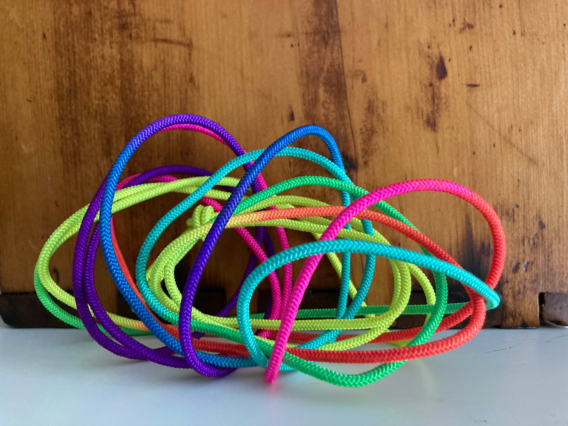 Un morceau solide de corde élastique aux couleurs vives. Noué à une extrémité. Deux cordes peuvent être attachées ensemble pour doubler le plaisir ! Chaque corde élastique mesure près de 3 mètres (10 pieds) de long (sans étirer l'élastique).