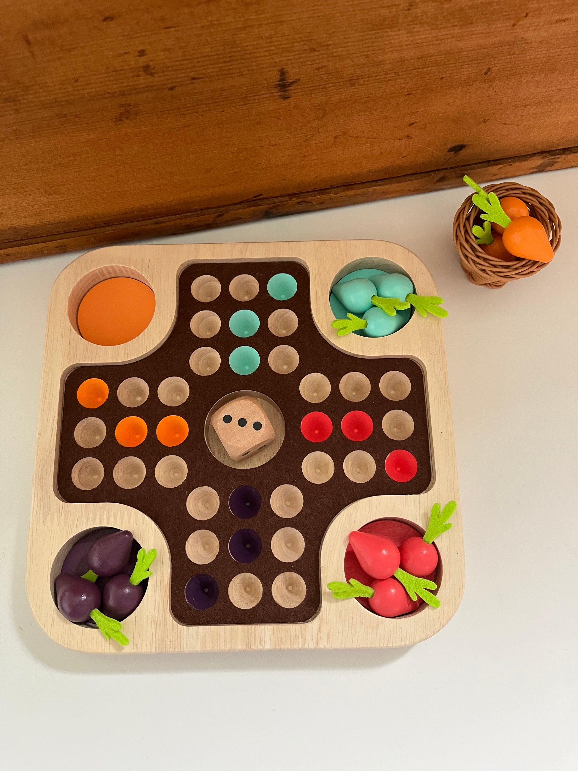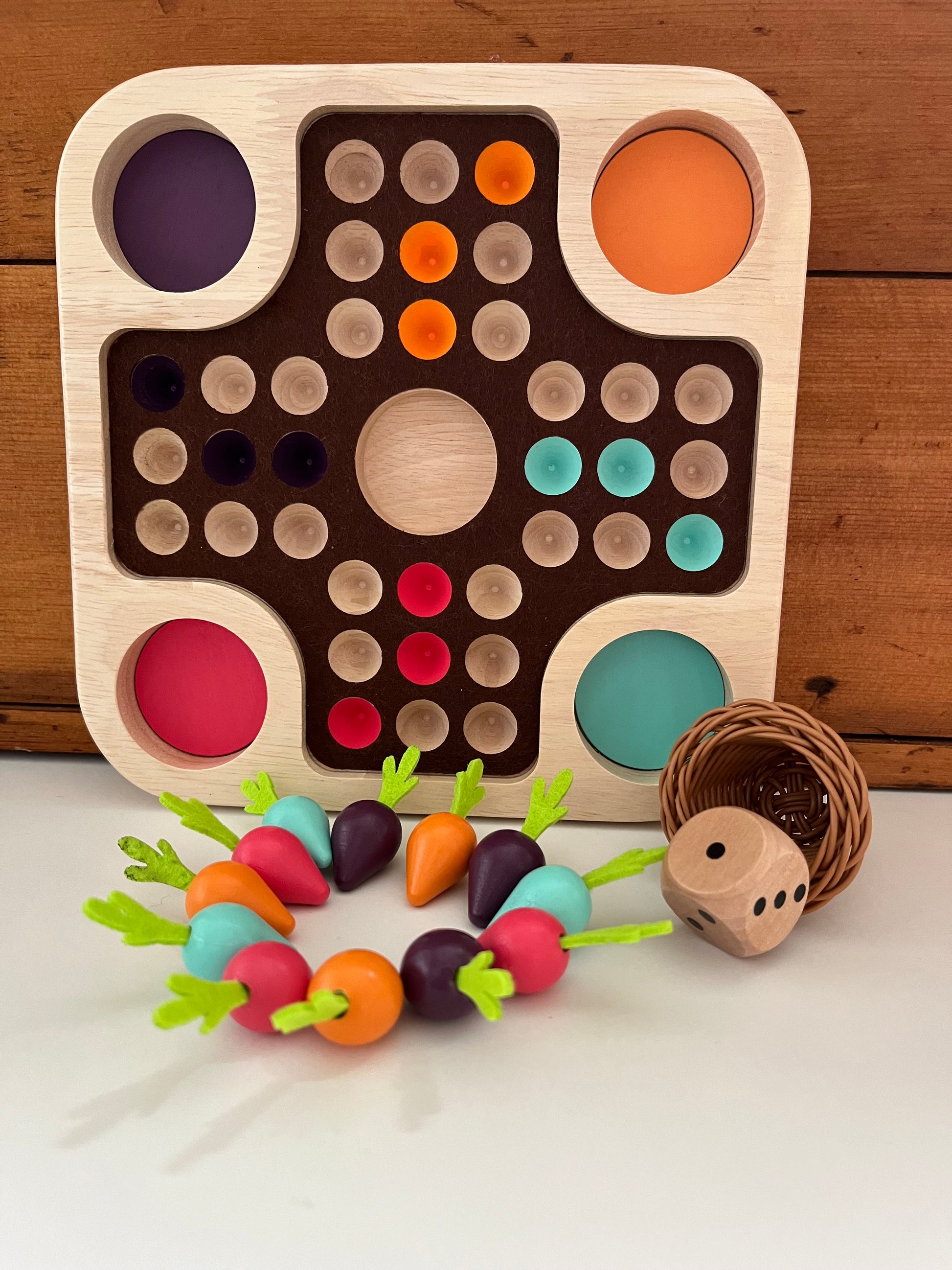 LA RÉCOLTE DE LÉGUMES est le jeu familial amusant de Sorry !, ou Ludo en France, parfois appelé Chevaux. Utiliser de jolis marqueurs en bois végétal, au lieu de chevaux. Déplacez vos carottes, betteraves, radis et carottes bleues sur le plateau de jeu en bois, tout en lançant le grand dé en bois pour compter vos places !