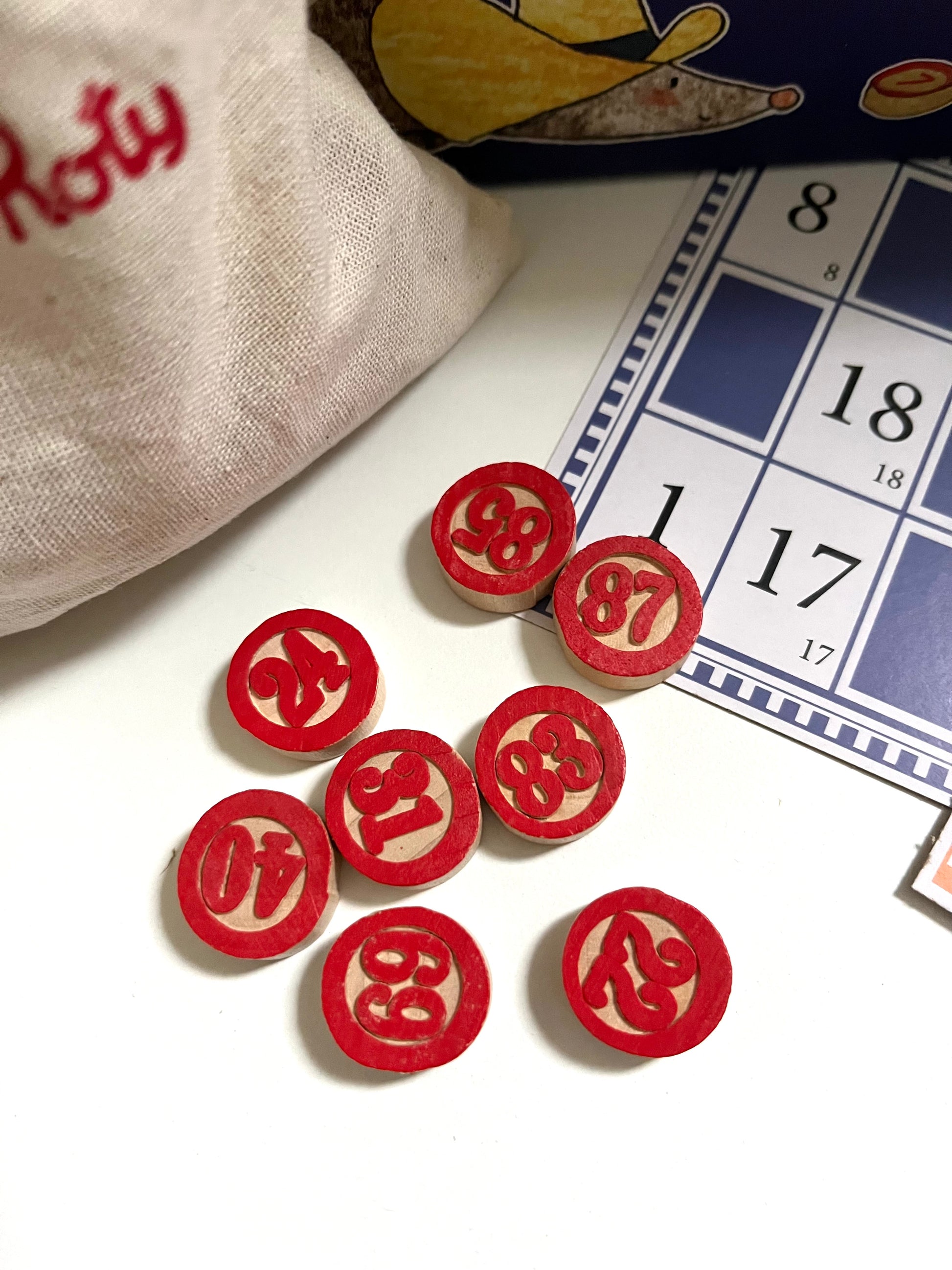 Les comptoirs en bois sont petits, alors faites attention si de très jeunes enfants jouent dans l'équipe ! Les cartes de jeu BINGO mesurent 20 x 10 cm (8 x 4 pouces).
