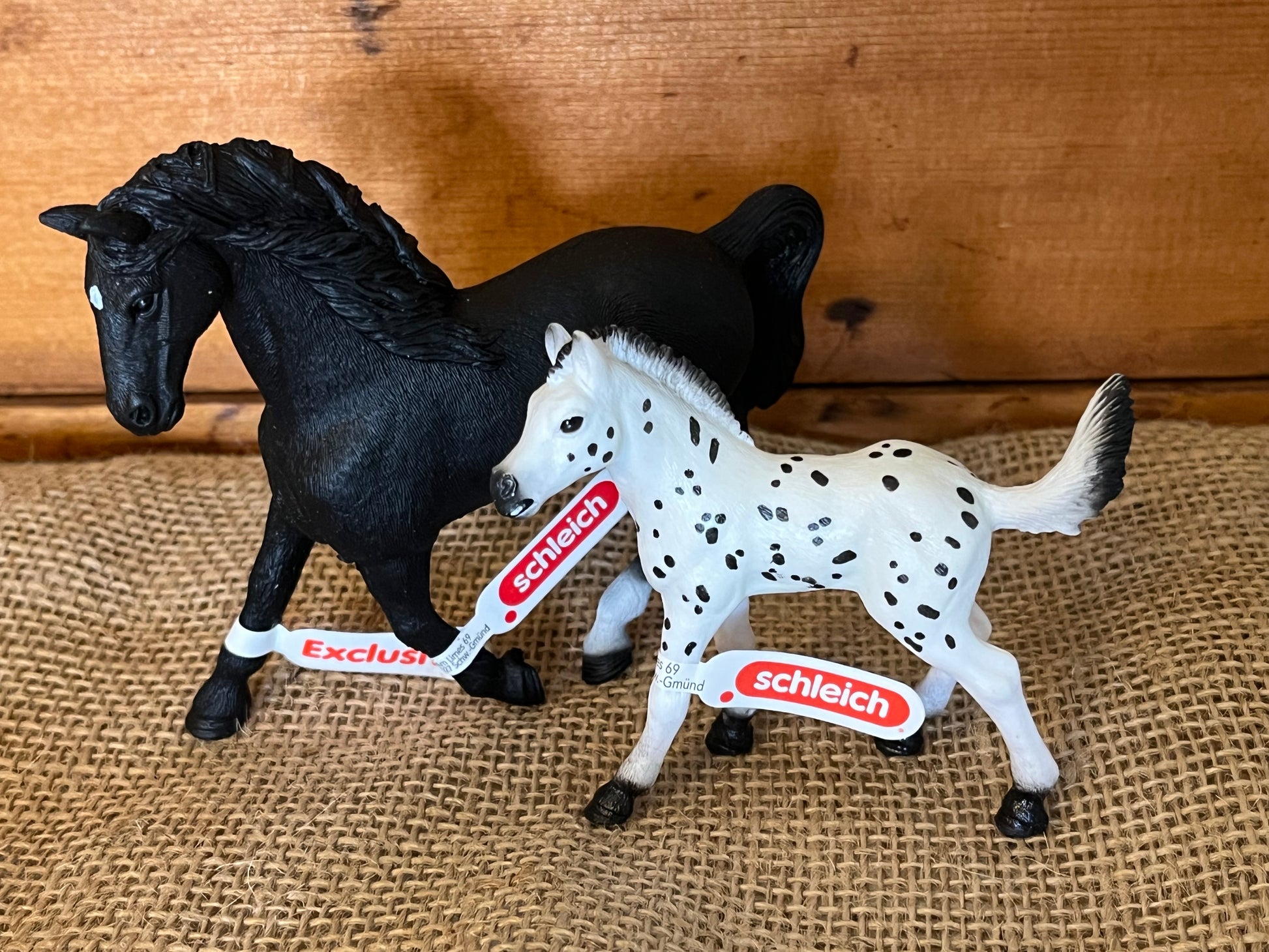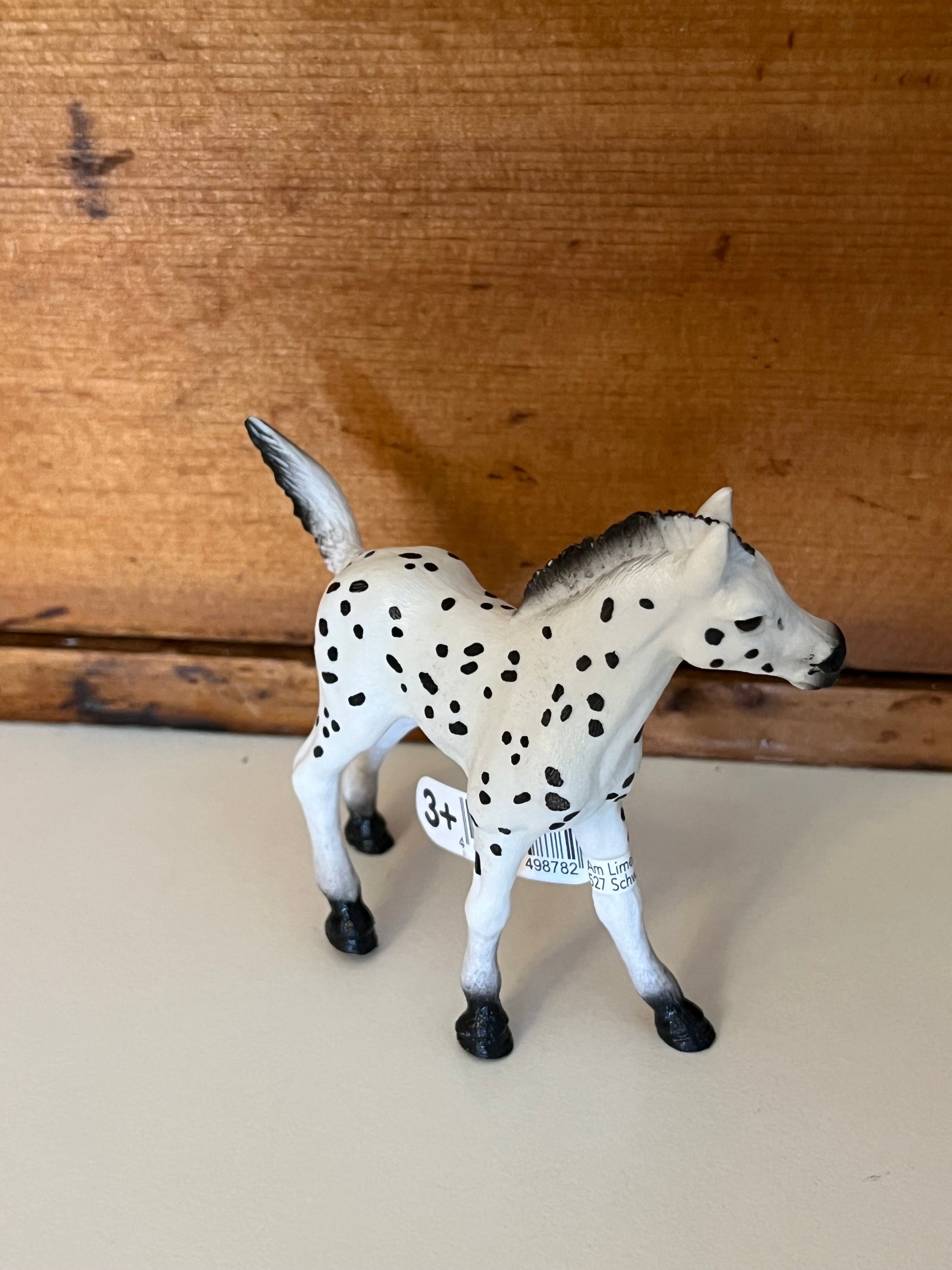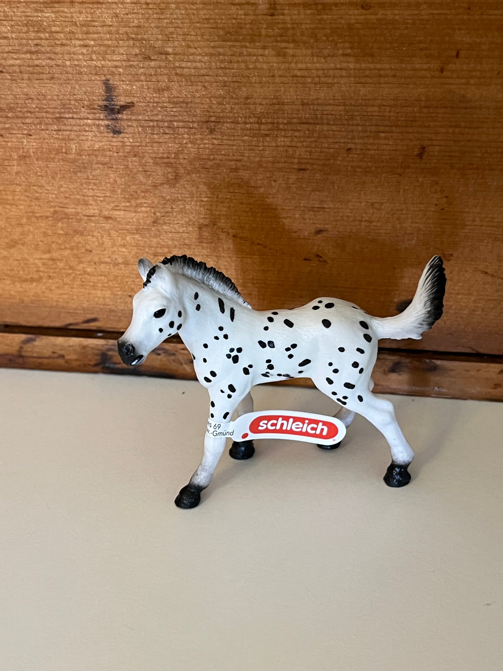 This is the Schleich KNABSTRUPPER FOAL. These are very beautiful spotted horses originally bred in Denmark for use as pleasure riding horses. All foals love to run and play together!