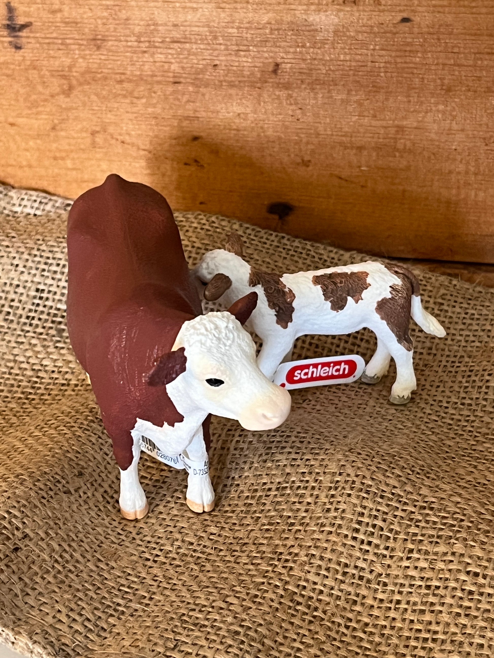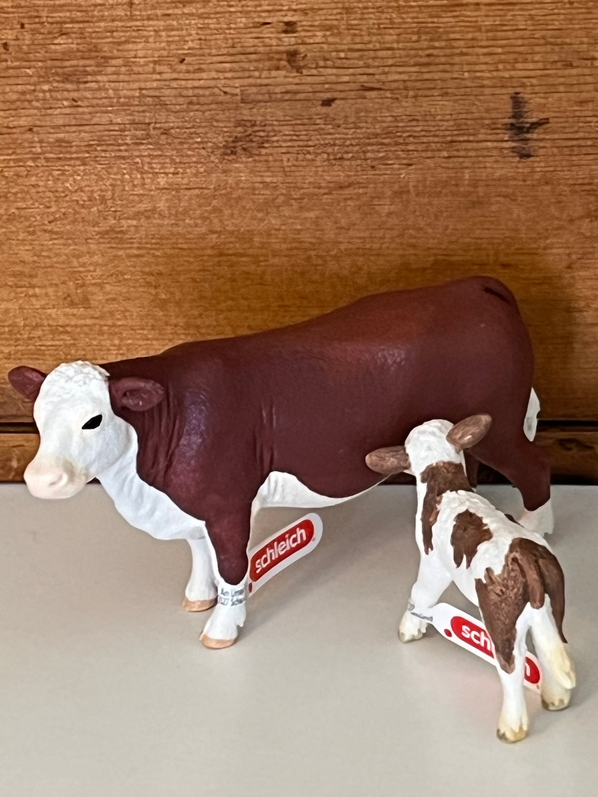 This is the Schleich SIMMENTAL CALF. A beautiful, little calf from the Simmental Valley in Switzerland. Always, red and white in colour, Simmentals are raised for both meat and dairy milk... they are very gentle...but big!
