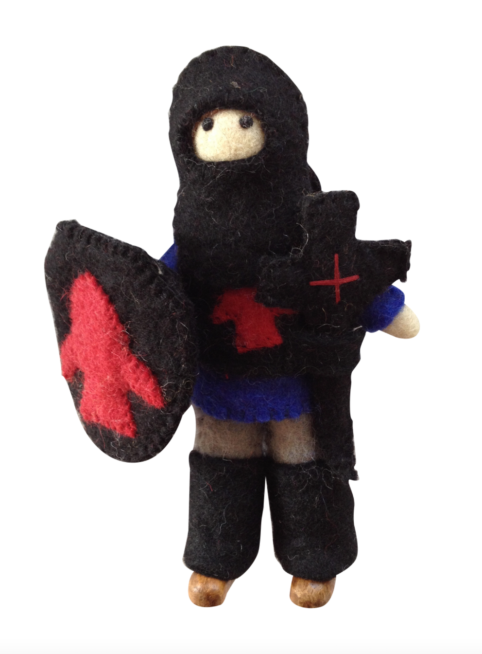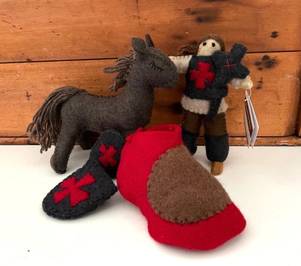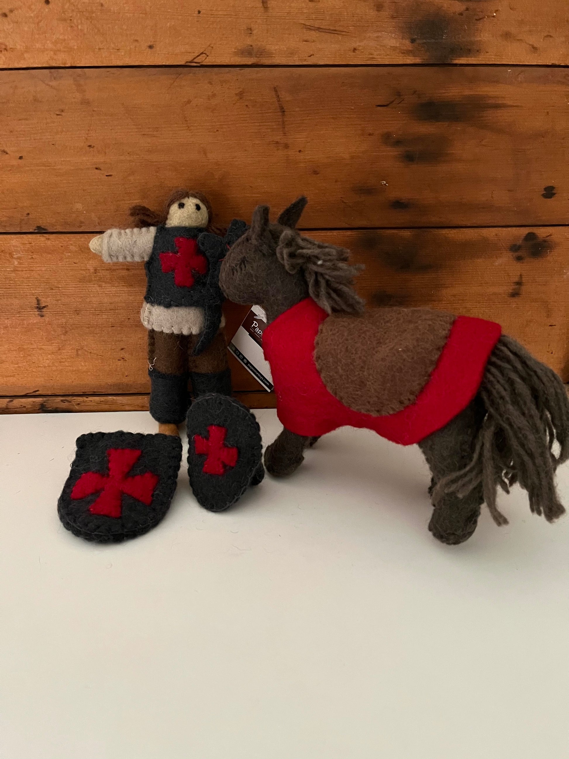 Le chevalier médiéval et son fidèle cheval. Un autre jouet feutré de qualité de Papoose, provenant d'une coopérative de femmes au Népal. Une attention incroyable aux détails. Toutes les armures sont amovibles. Le chevalier mesure environ 10 pouces de hauteur.