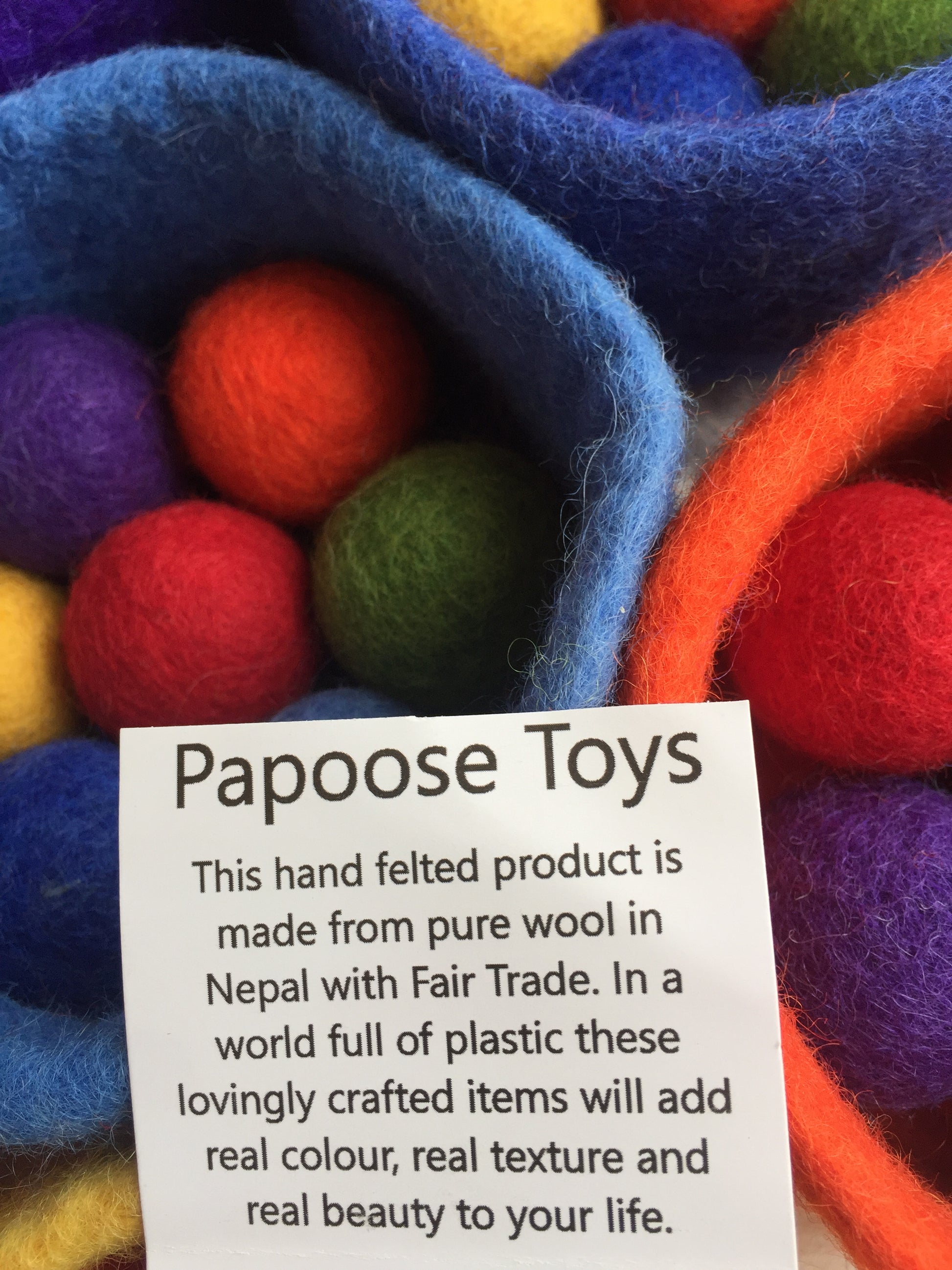 Fabriqué au Népal. Jouets Papoose : Laine. Coton. Bois. Fait main. Commerce équitable. Voir tous les jouets Papoose feutrés .
