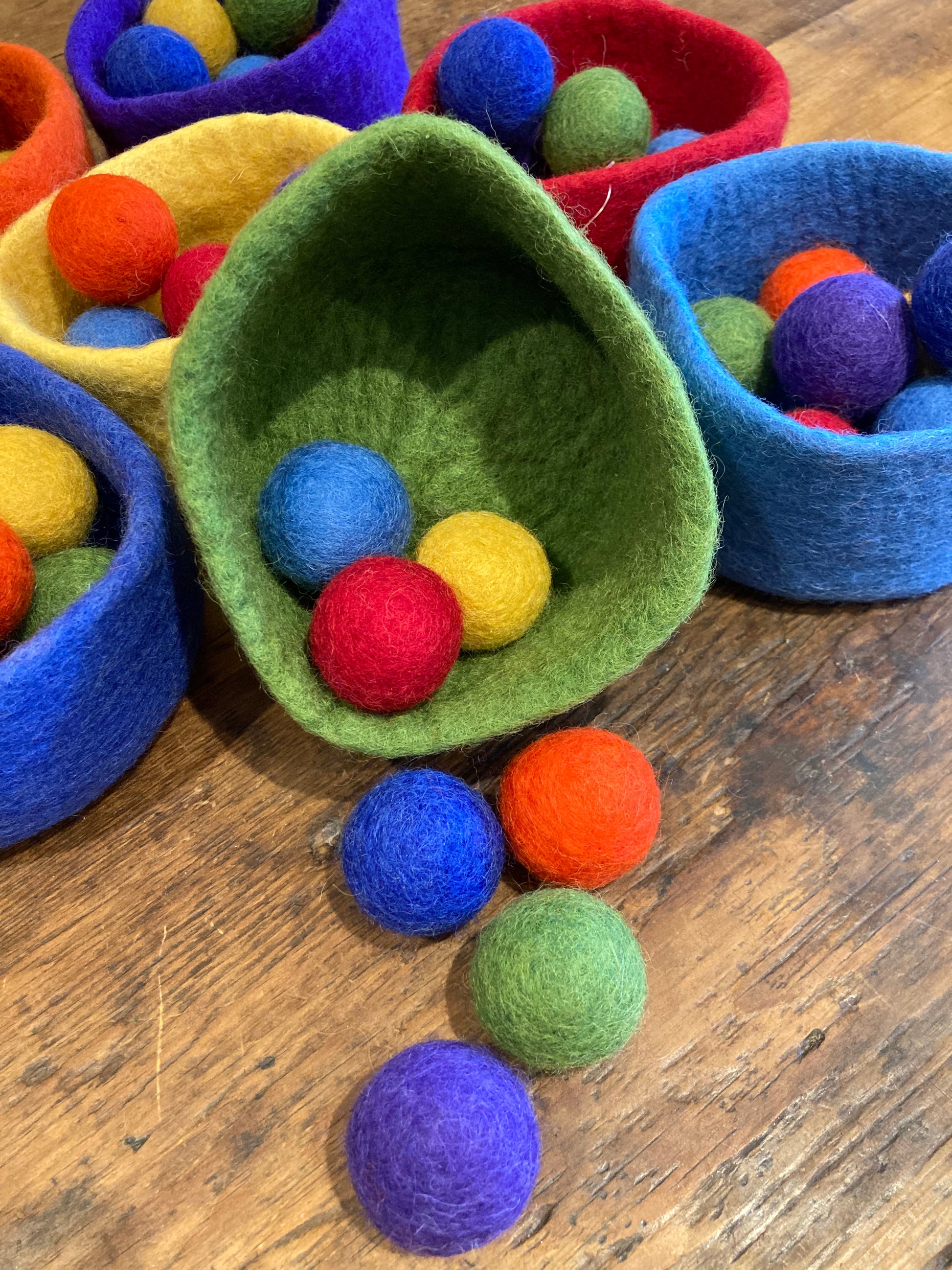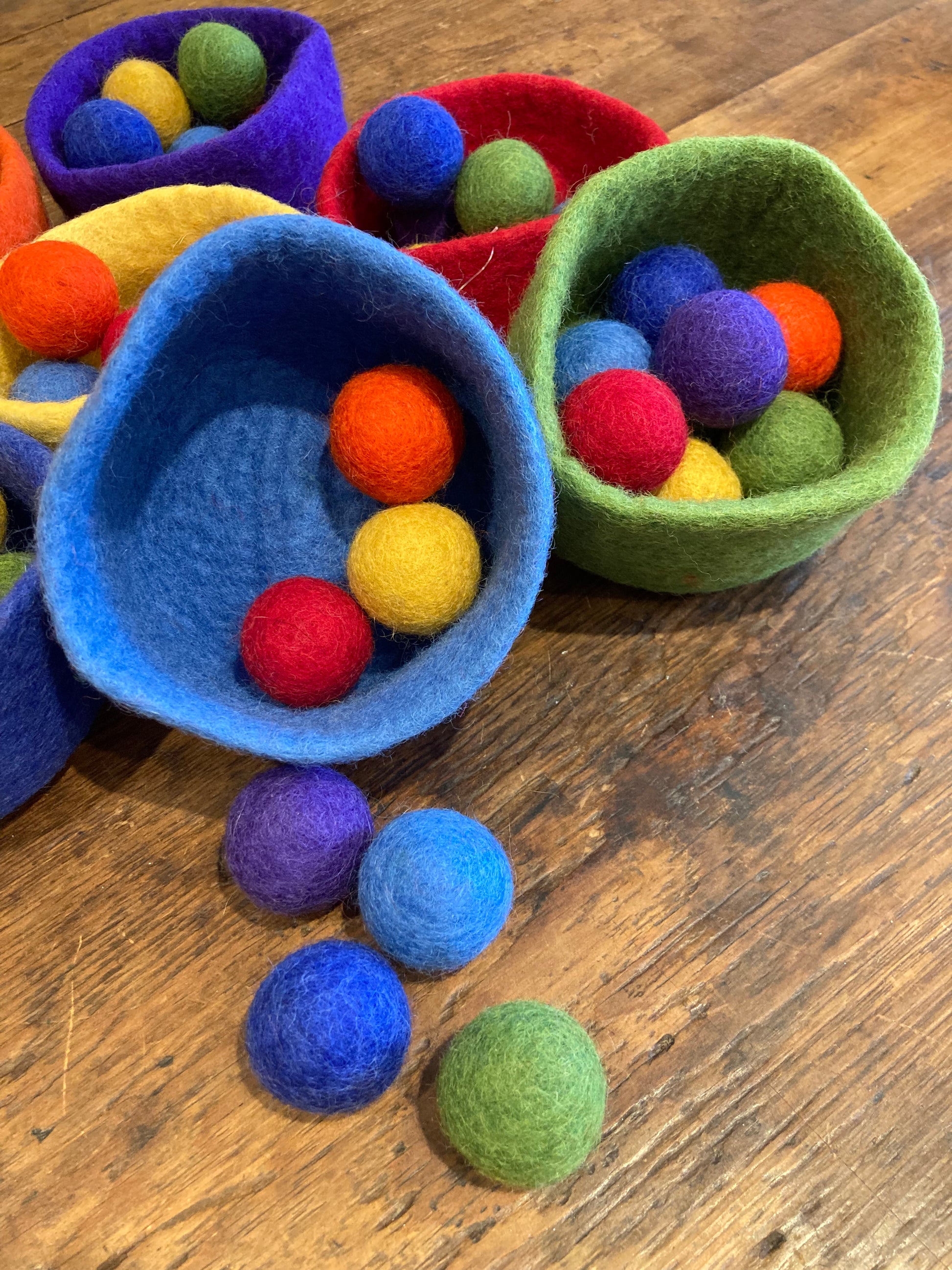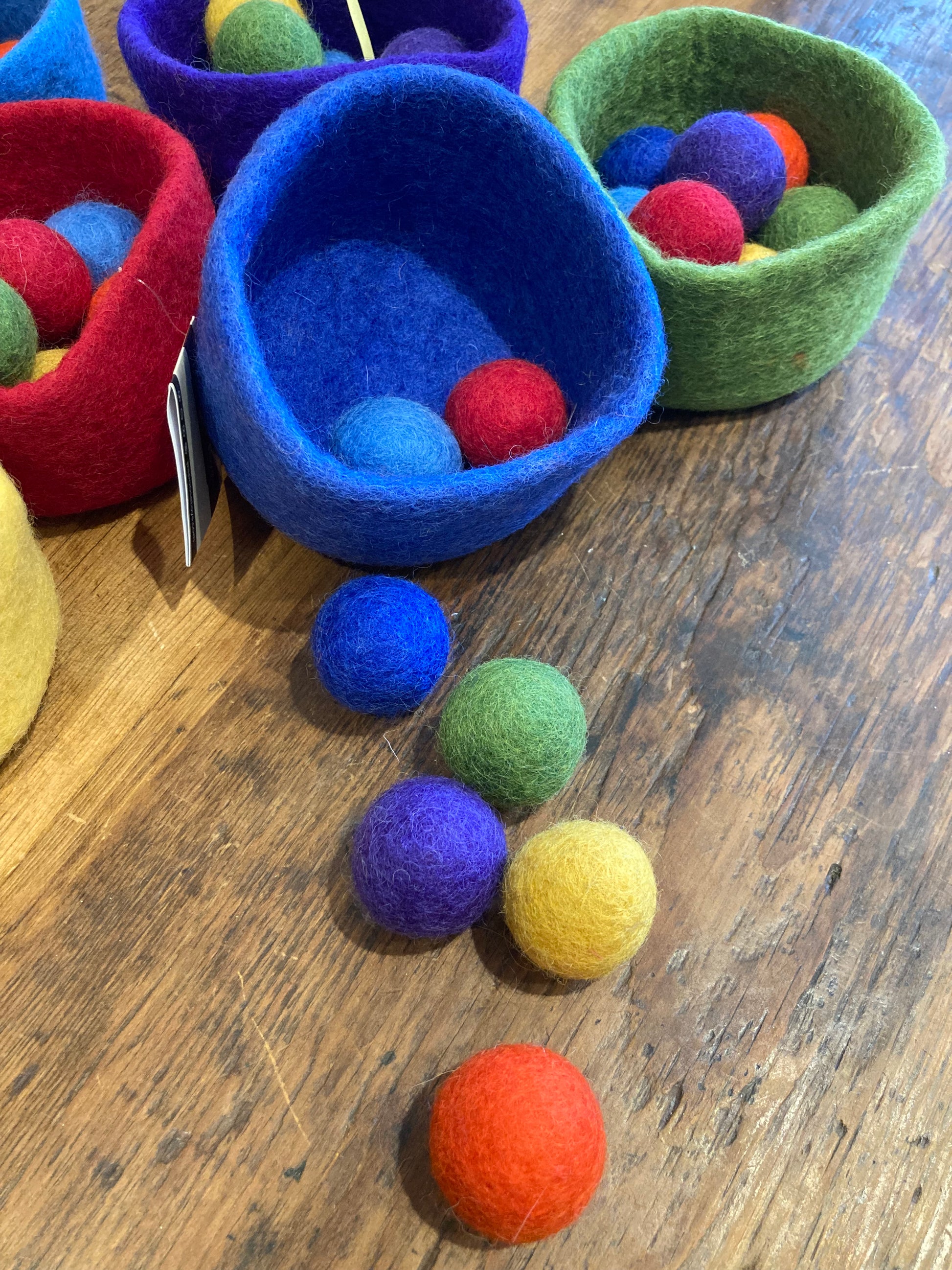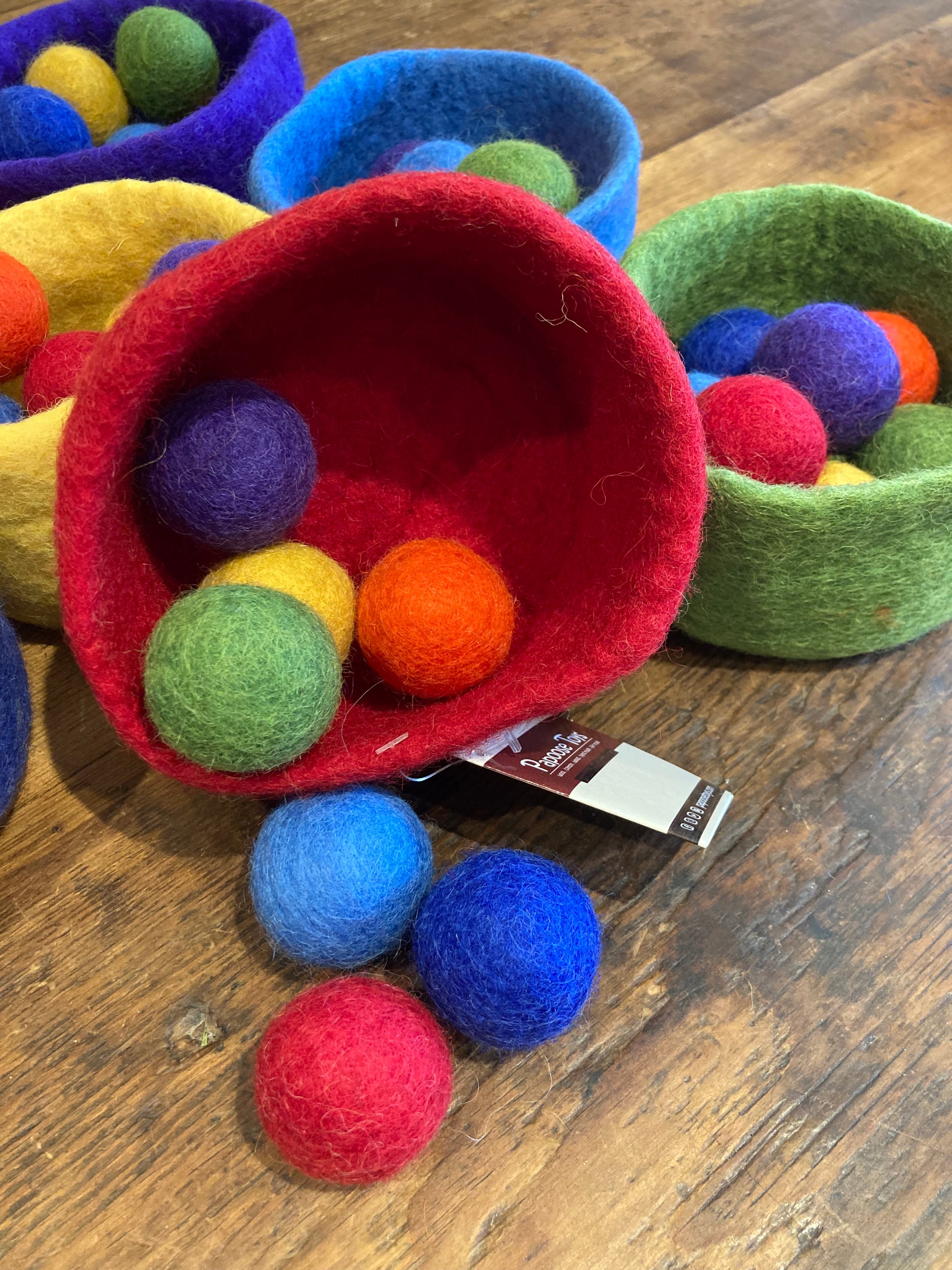 Sans danger pour bébé. Ensemble complet de sept bols et 49 boules de laine feutrée vendus séparément.