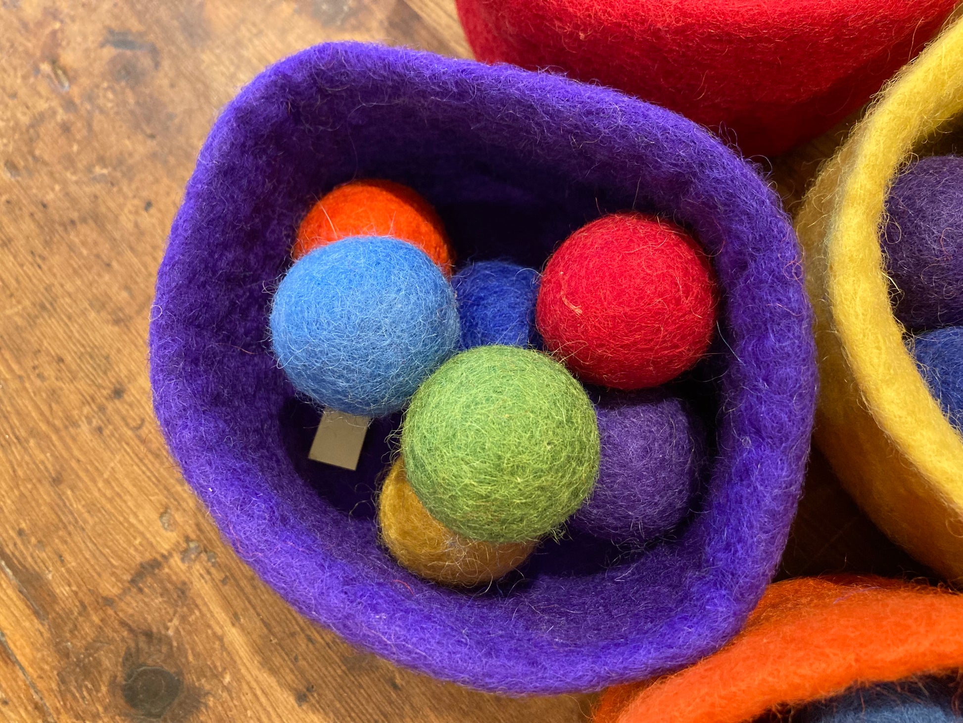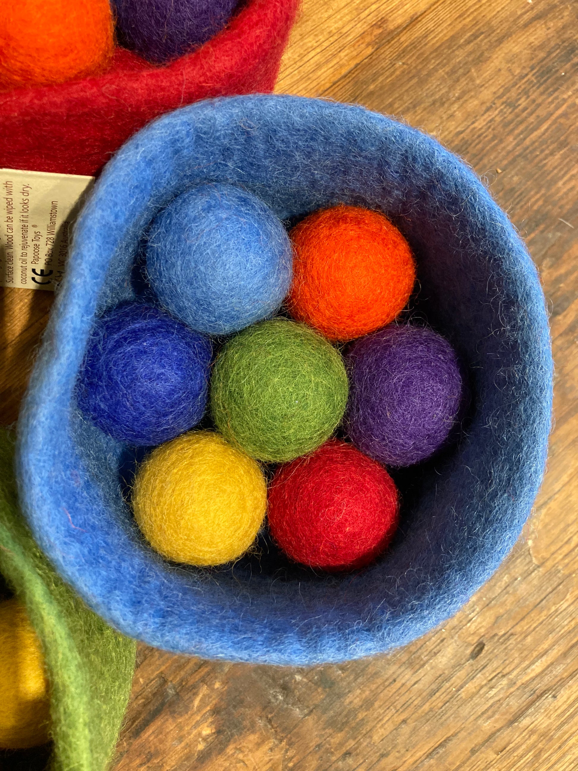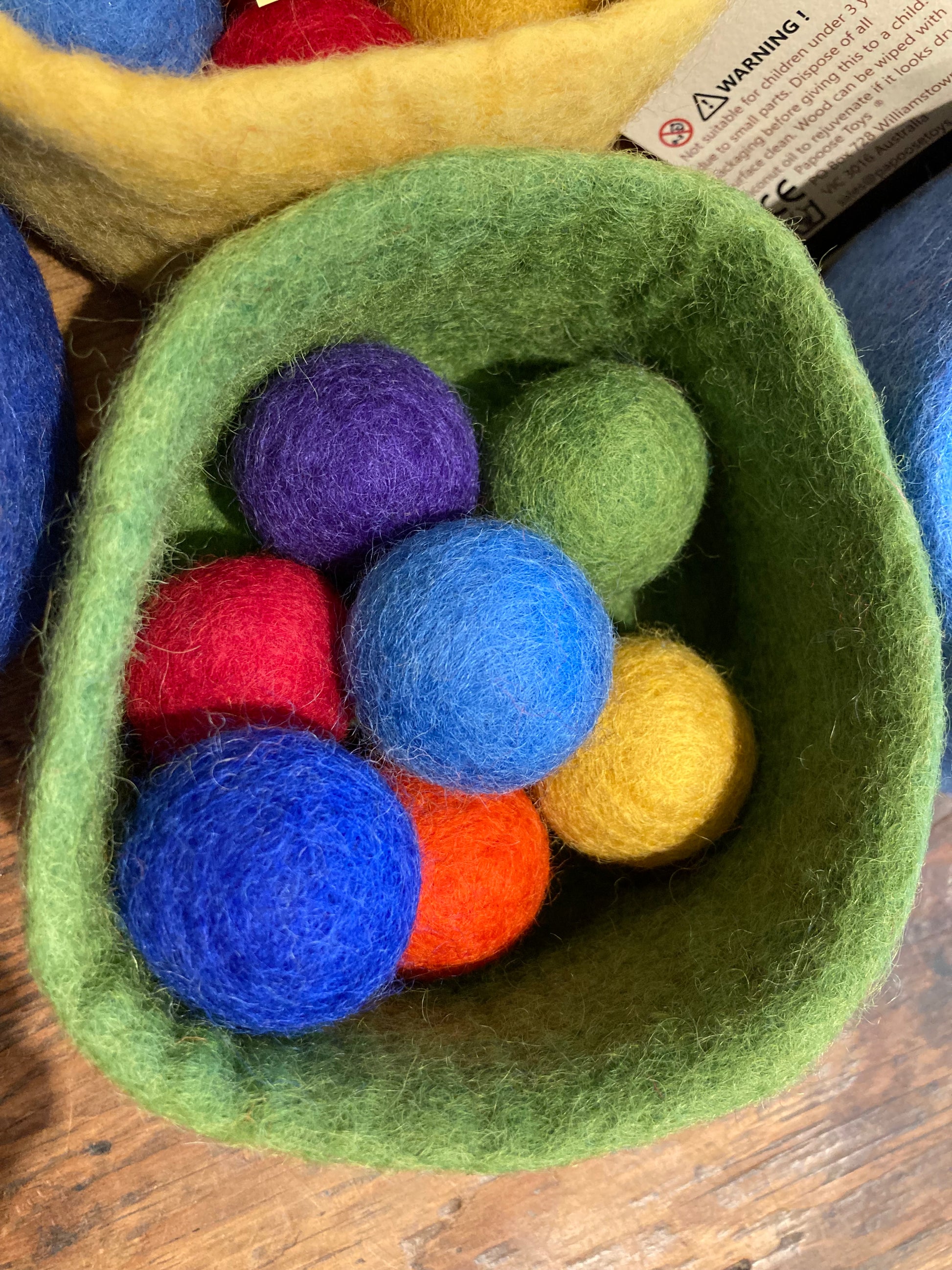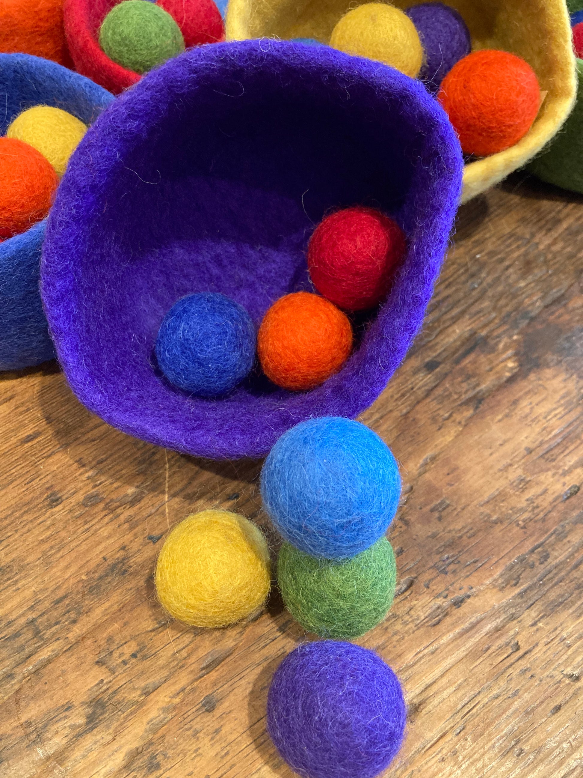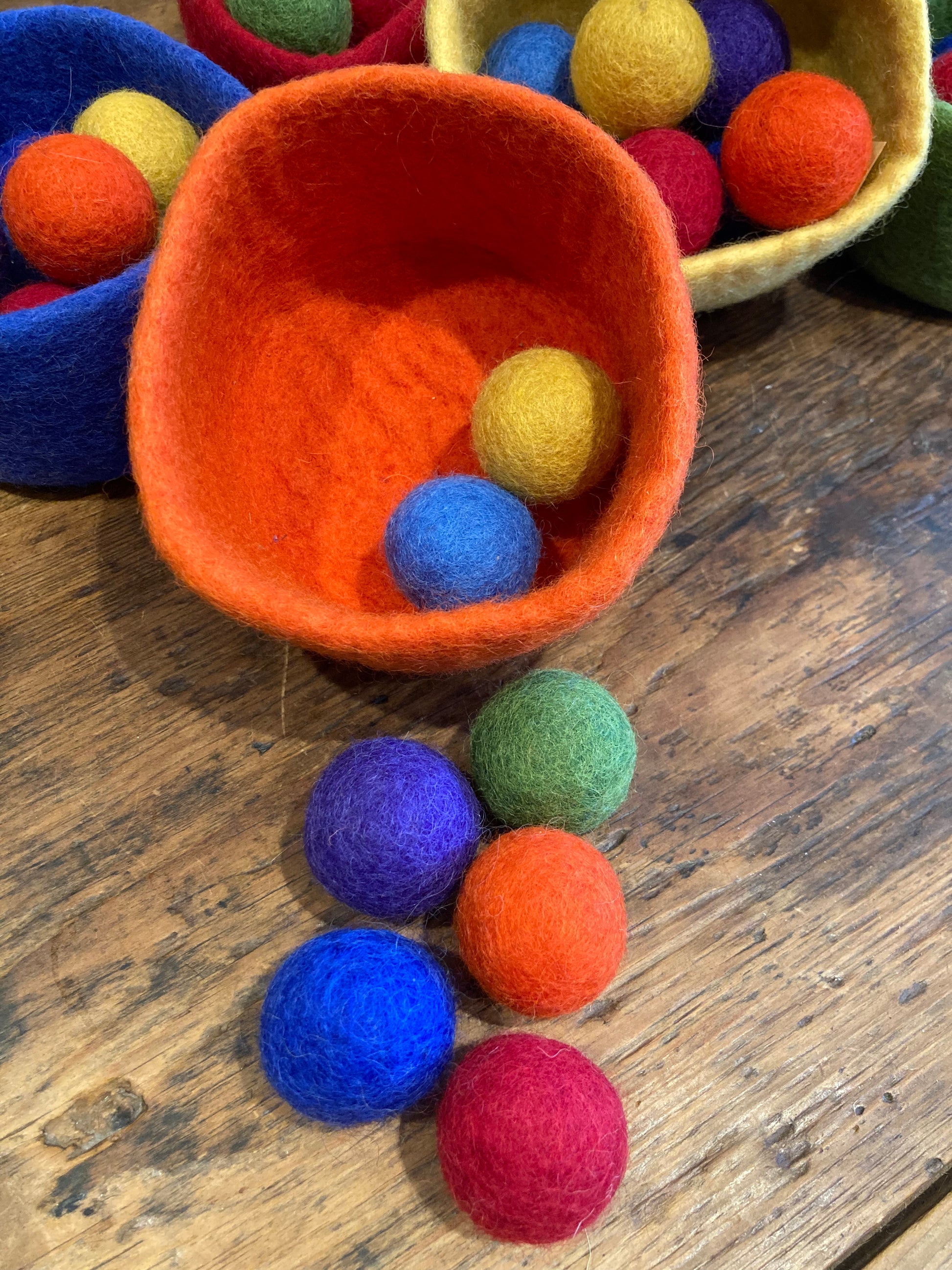 Sans danger pour bébé. Ensemble complet de sept bols et 49 boules de laine feutrée vendus séparément.