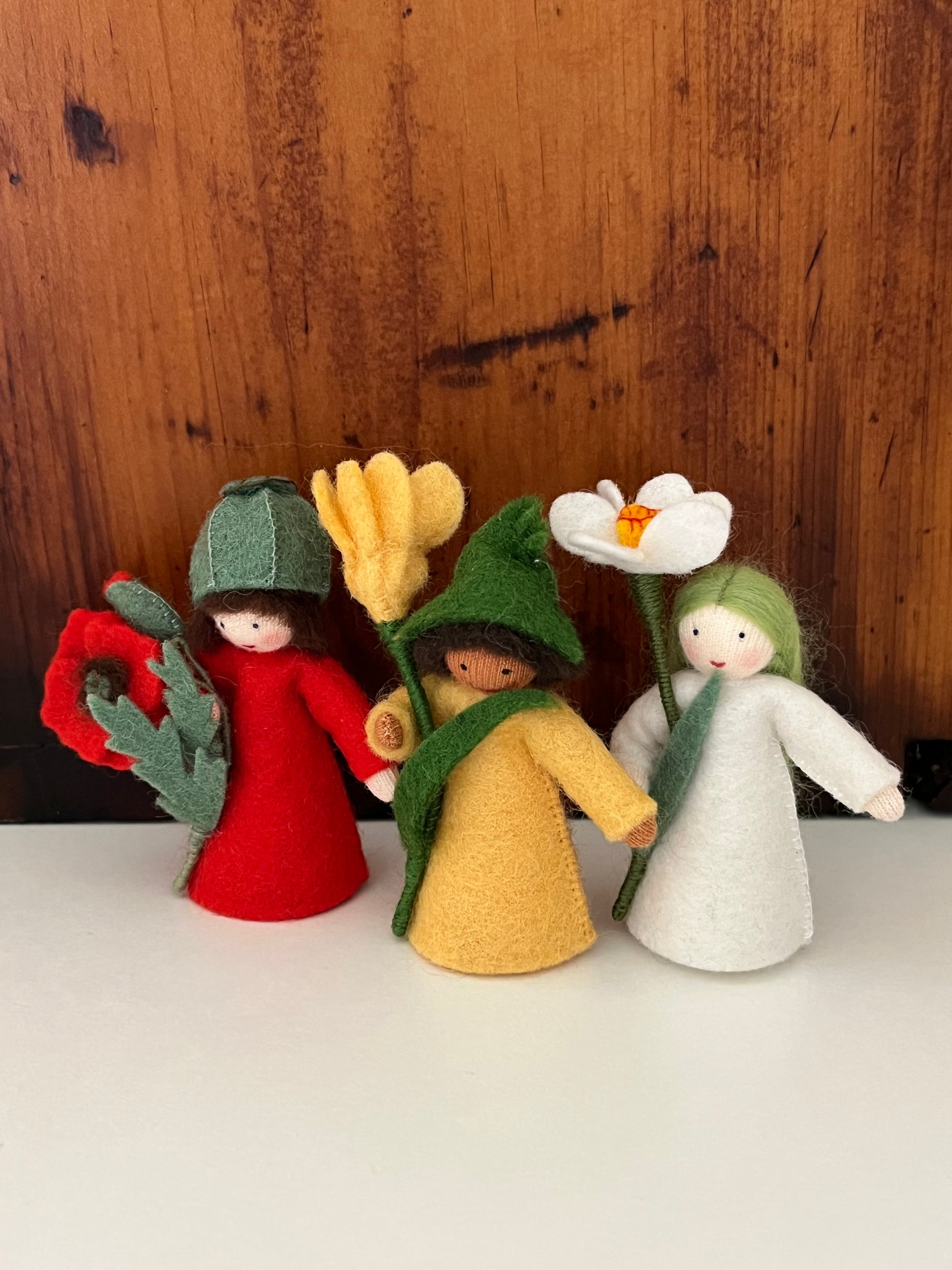 The FLOWER FAIRY WALDORF DOLLS of Romania. Handmade with love in their workshop of a Woman's Cooperative, Ambrosius Prodcom. All their creations can stand alone, with bendable, posable arms. A few of the BABY FLOWER FAIRY DOLLS also have posable legs. All are made with felt wool bodies, hats and flowers, with soft cotton tricot over pipe-cleaner wire. Hair and stuffing is clean sheep's wool fleece.