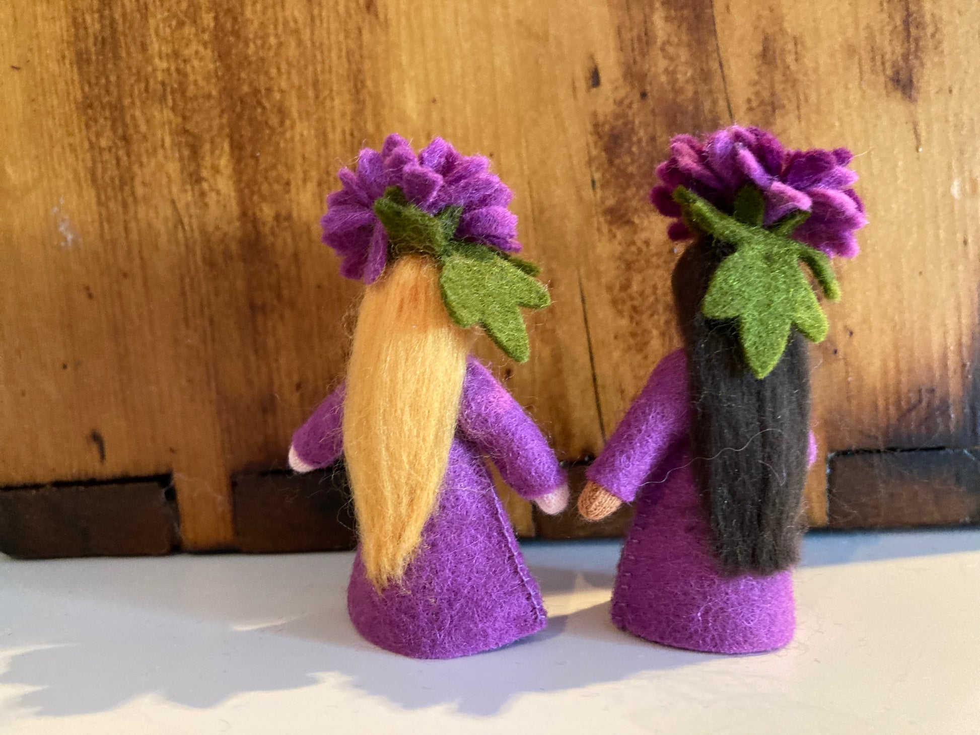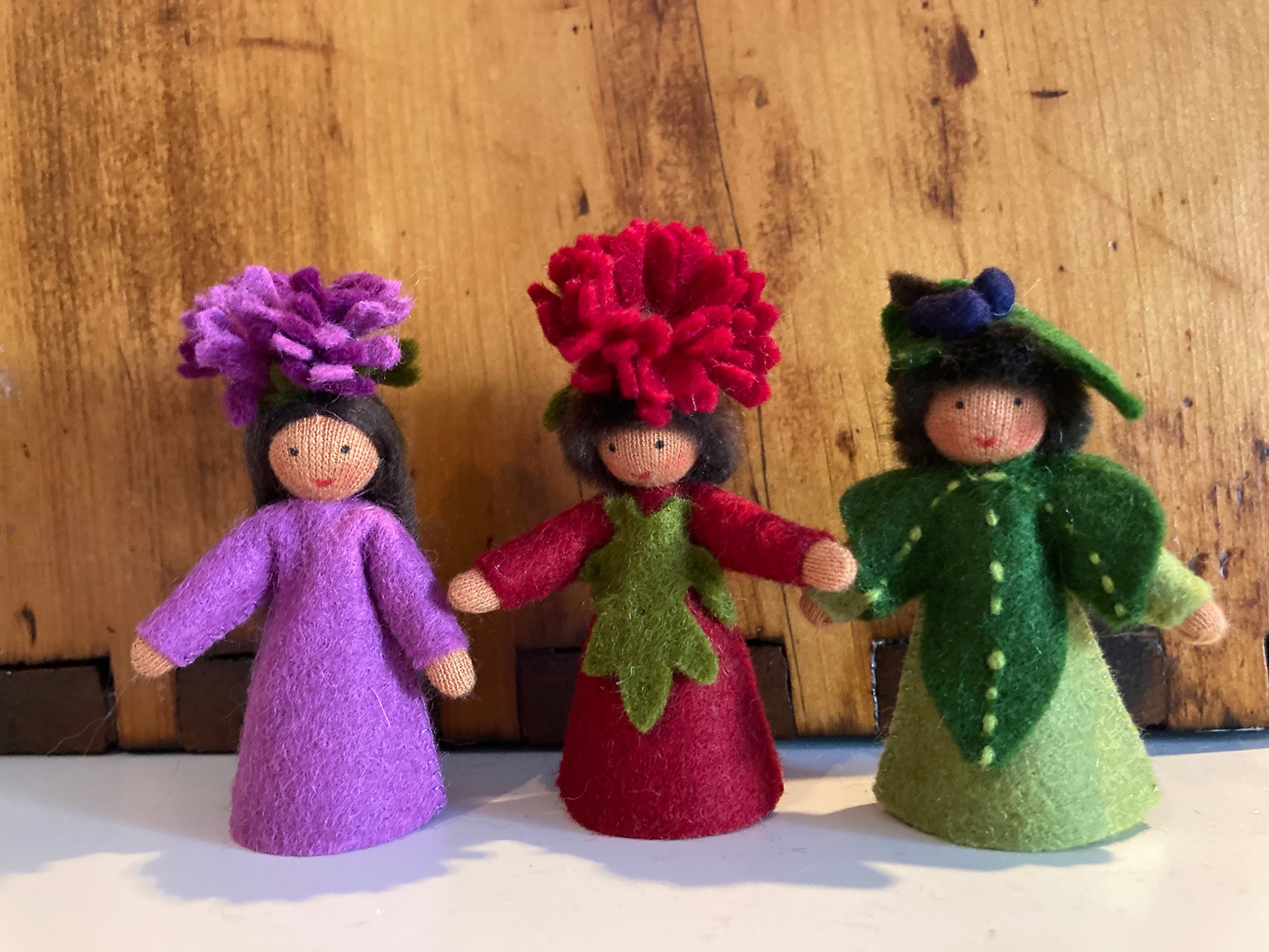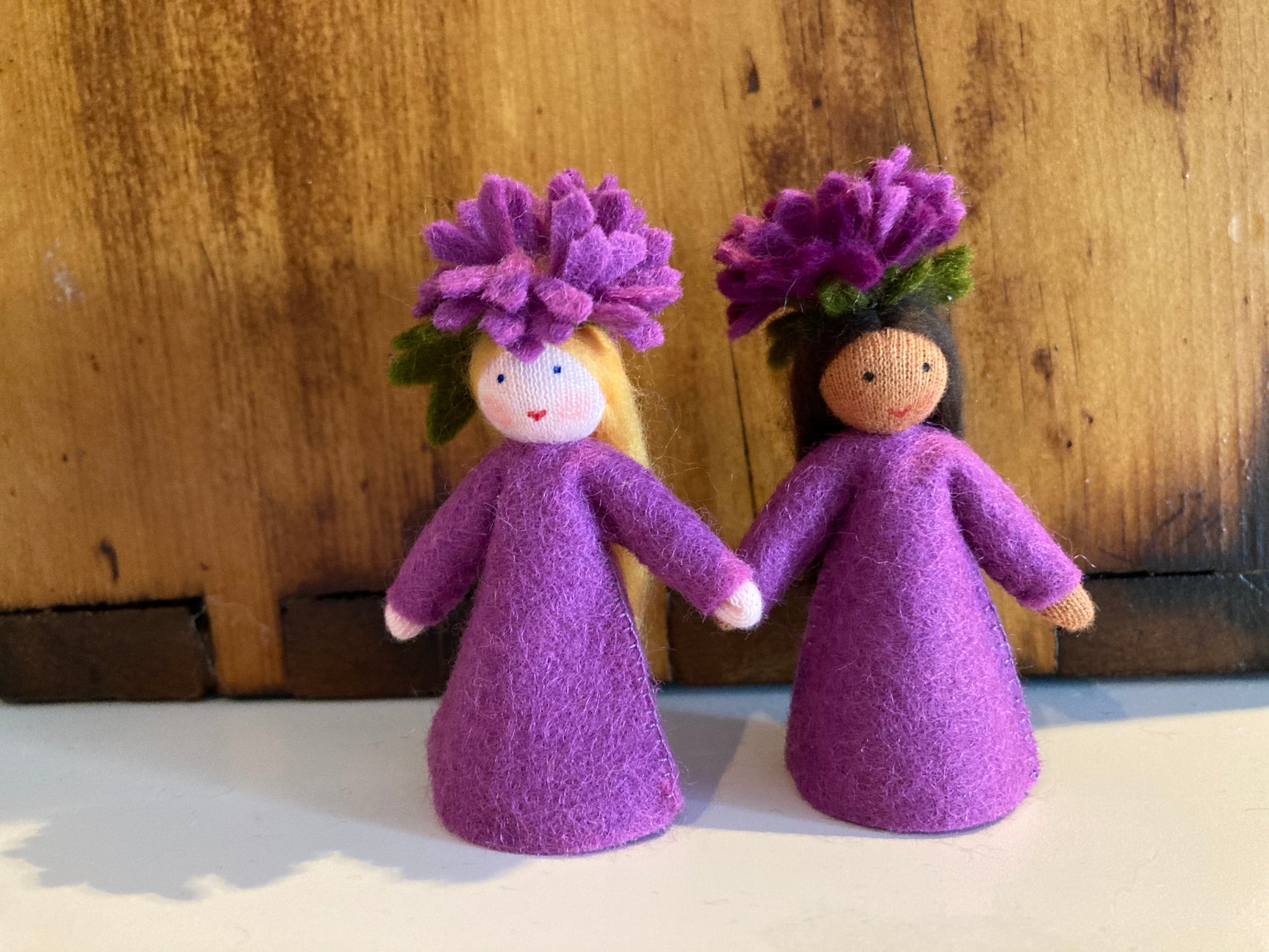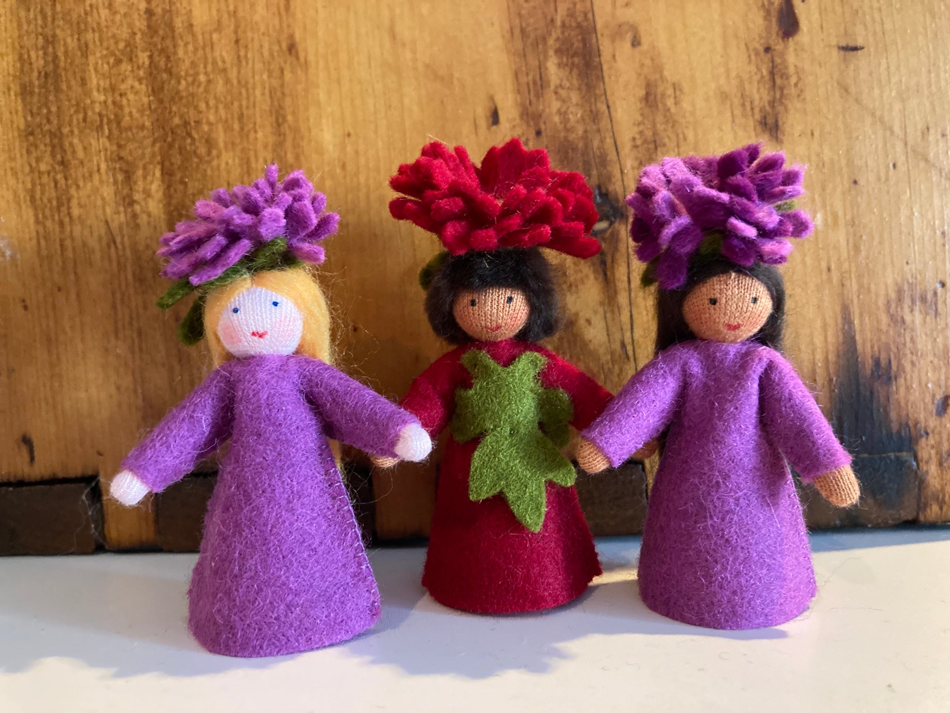 Les POUPÉES WALDORF DE LA FÉE DES FLEURS de Roumanie. Fabriqué à la main avec amour dans leur atelier d'une coopérative de femmes, Ambrosius Prodcom. Toutes leurs créations peuvent être autonomes, avec des bras pliables et mobiles. Quelques-unes des POUPÉES BABY FLOWER FAIRY ont également des jambes mobiles. Tous sont fabriqués avec des corps, des chapeaux et des fleurs en laine feutrée, avec du tricot de coton doux sur du fil cure-pipe. Les poils et le rembourrage sont en laine de mouton propre.