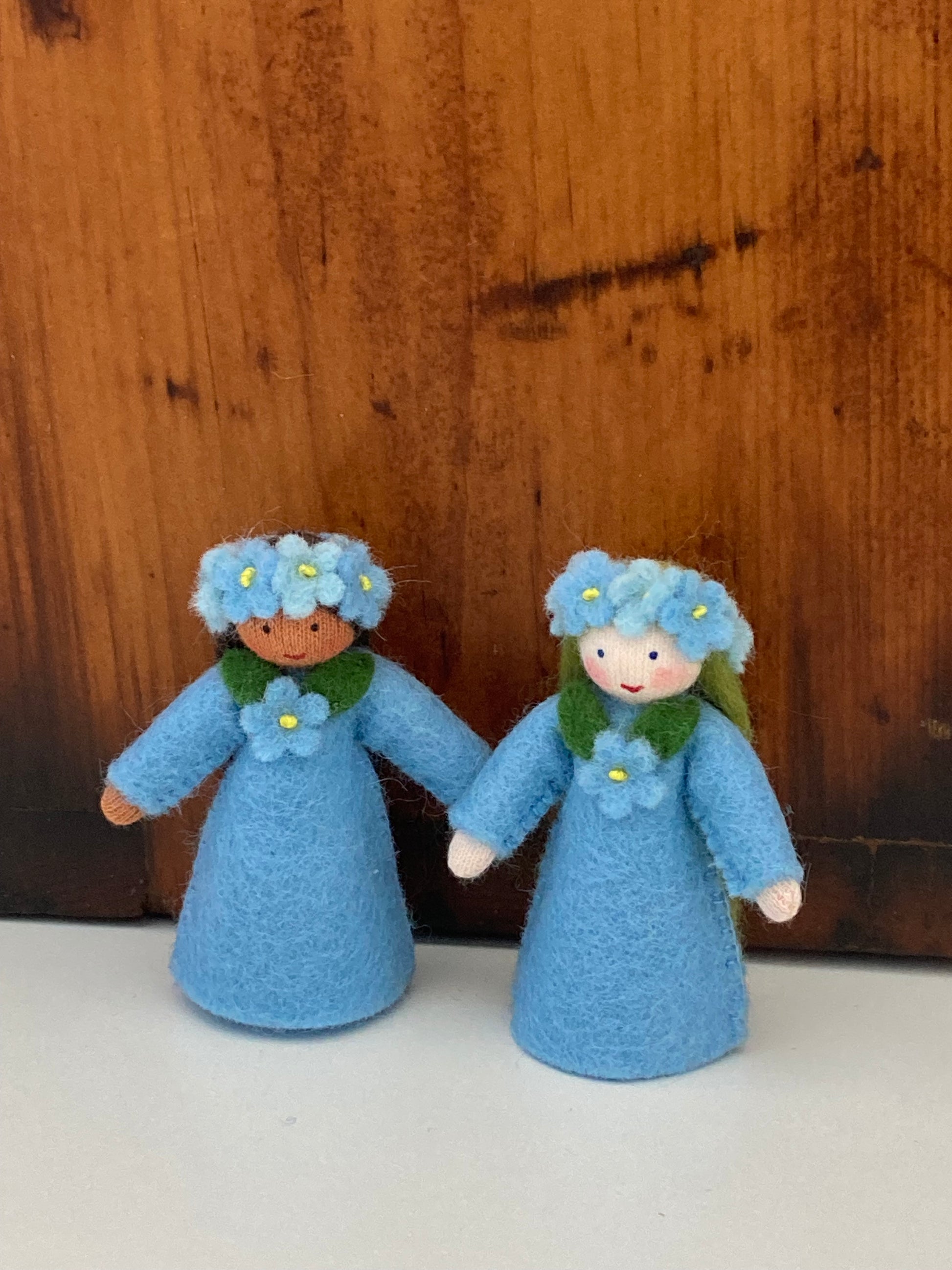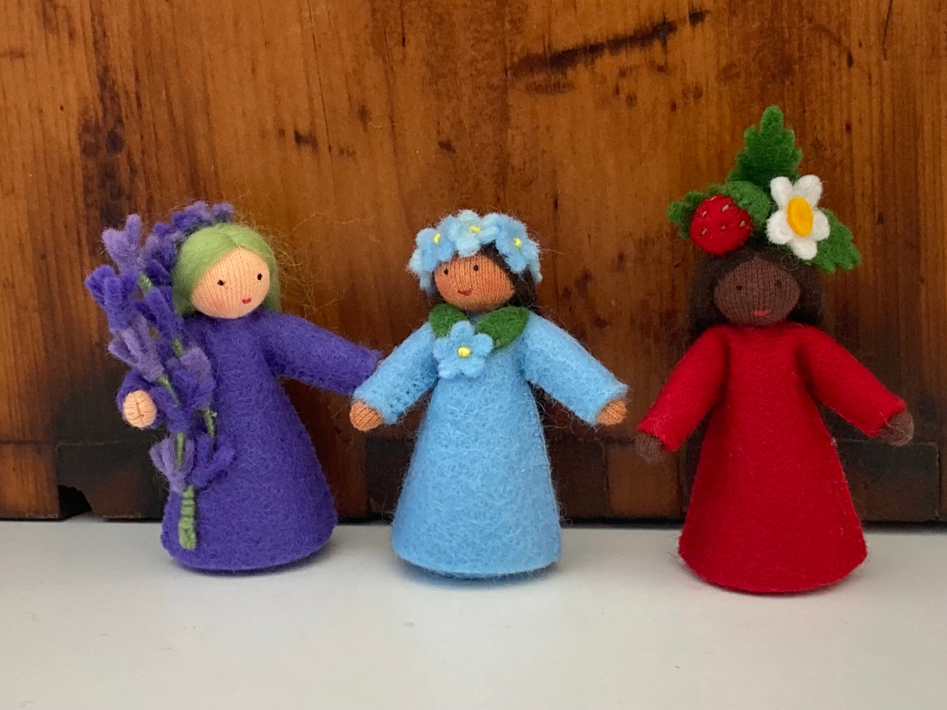 Les POUPÉES WALDORF DE LA FÉE DES FLEURS de Roumanie. Fabriqué à la main avec amour dans leur atelier d'une coopérative de femmes, Ambrosius Prodcom. Toutes leurs créations peuvent être autonomes, avec des bras pliables et mobiles. Quelques-unes des POUPÉES BABY FLOWER FAIRY ont également des jambes mobiles. Tous sont fabriqués avec des corps, des chapeaux et des fleurs en laine feutrée, avec un tricot de coton doux sur du fil cure-pipe. Les poils et le rembourrage sont en laine de mouton propre.