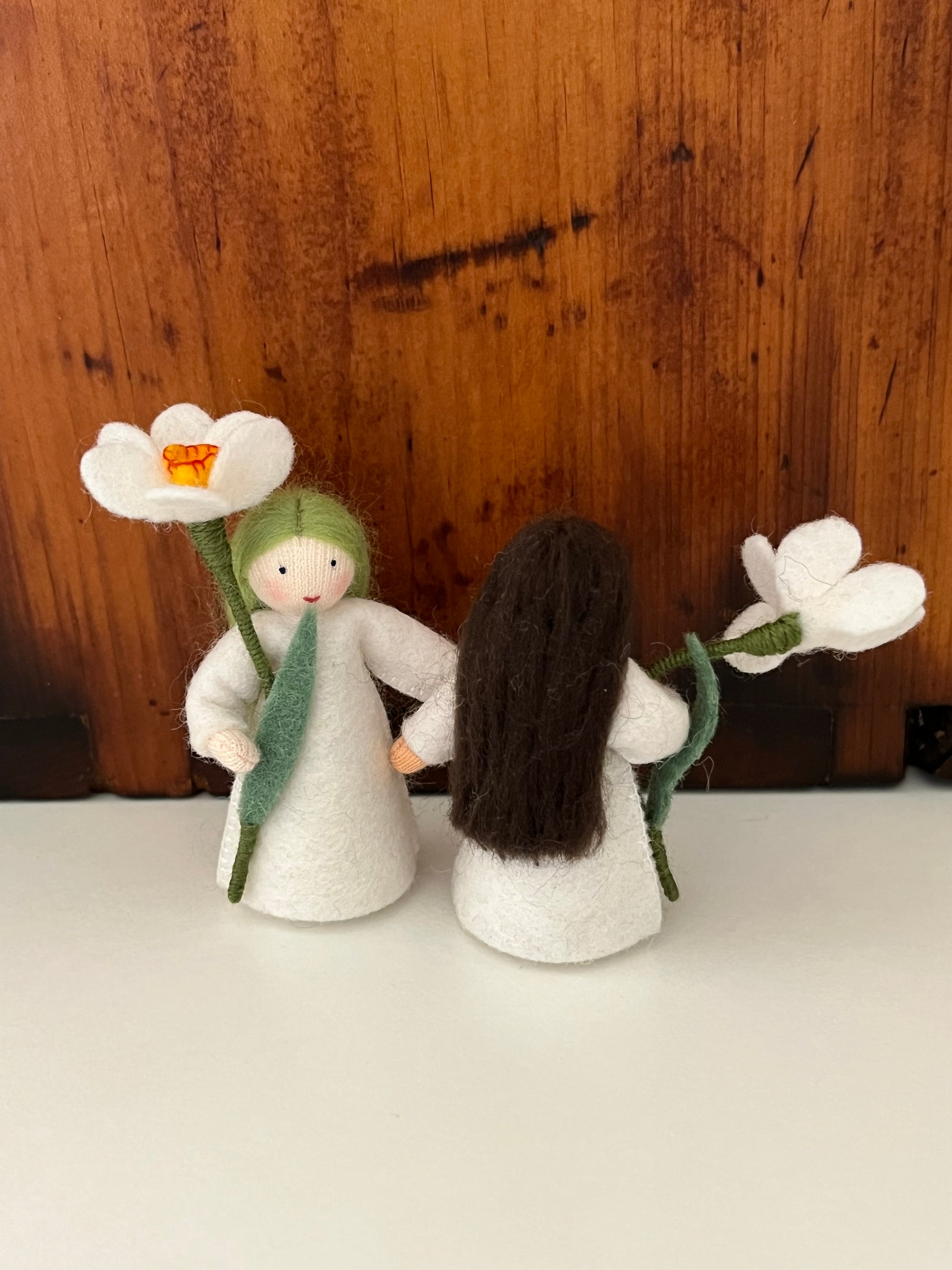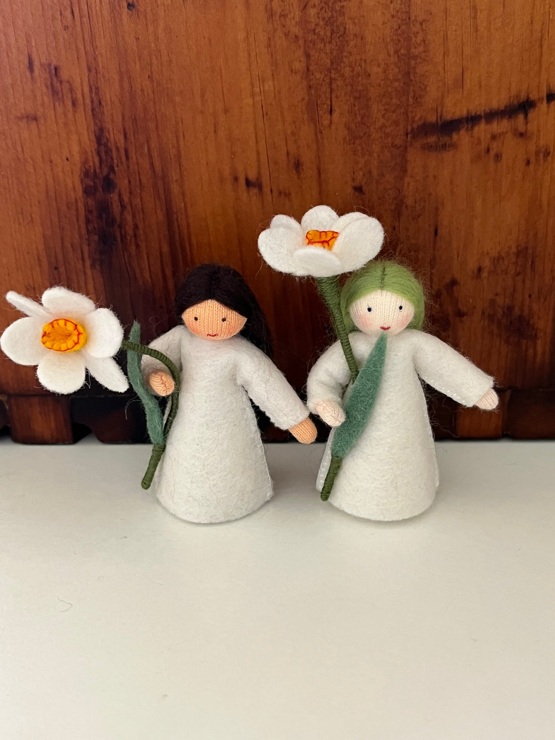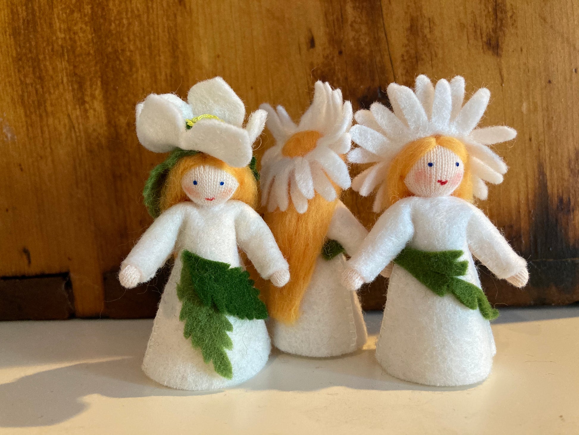 Les POUPÉES WALDORF DE LA FÉE DES FLEURS de Roumanie. Fabriqué à la main avec amour dans leur atelier d'une coopérative de femmes, Ambrosius Prodcom. Toutes leurs créations peuvent être autonomes, avec des bras pliables et mobiles. Quelques-unes des POUPÉES BABY FLOWER FAIRY ont également des jambes mobiles. Tous sont fabriqués avec des corps, des chapeaux et des fleurs en laine feutrée, avec du tricot de coton doux sur du fil cure-pipe. Les poils et le rembourrage sont en laine de mouton propre.