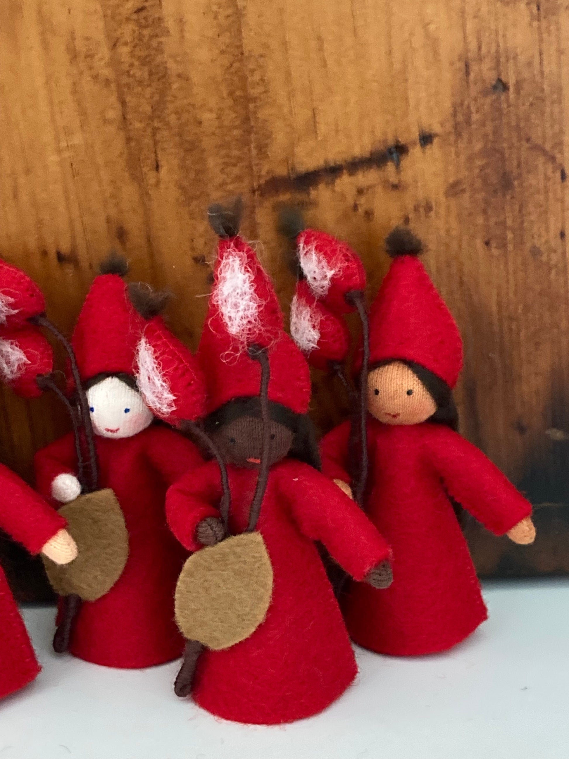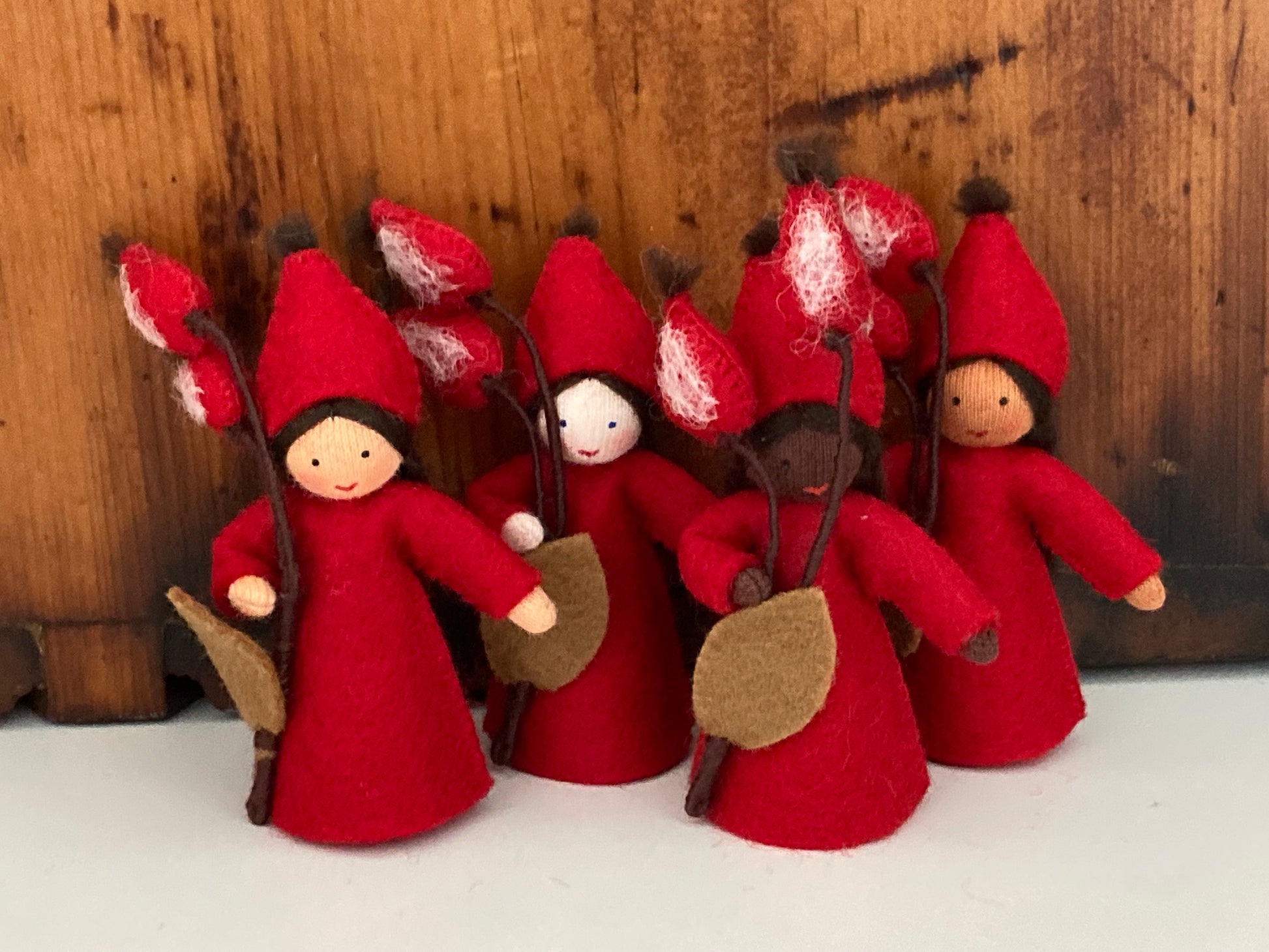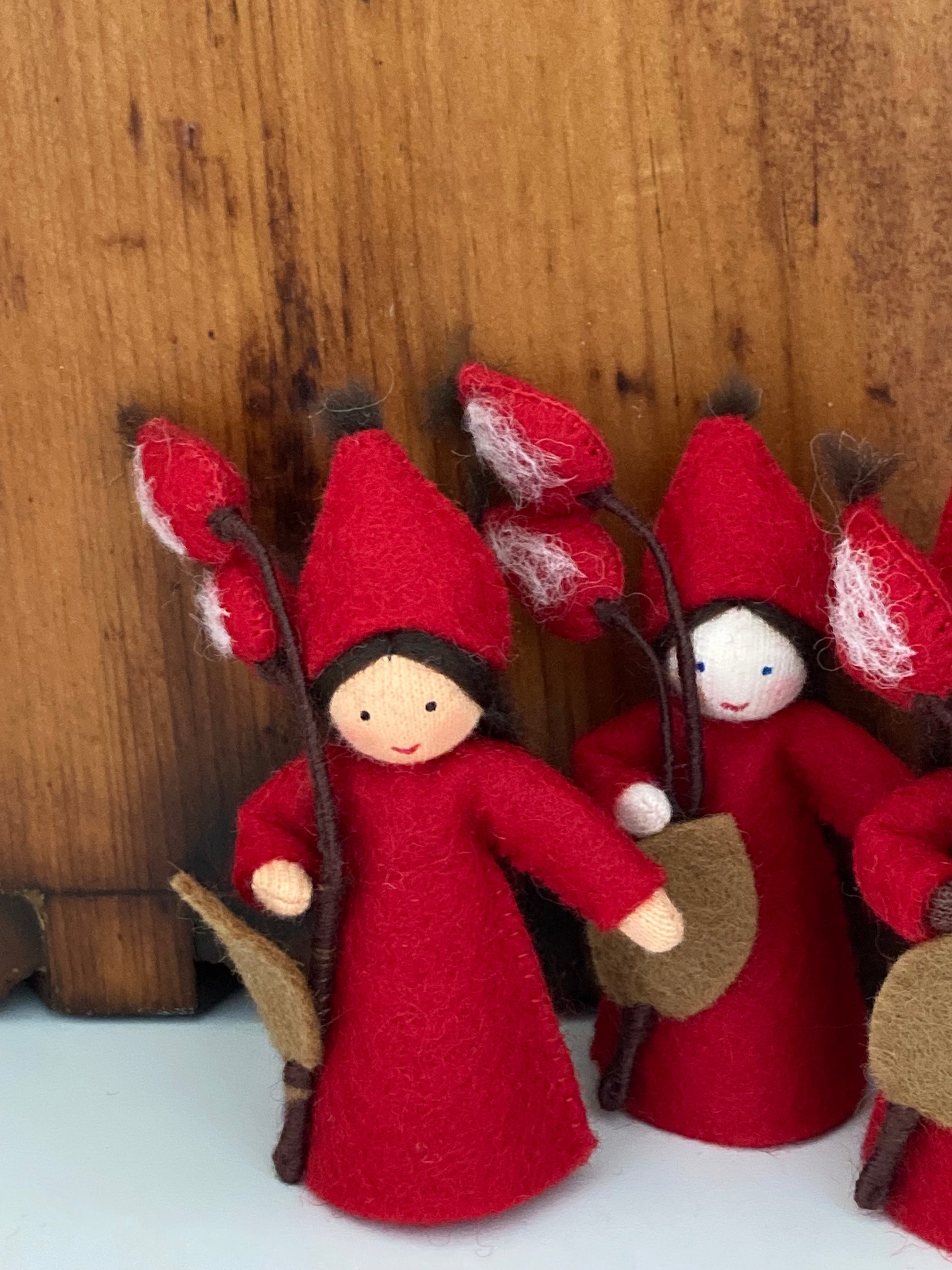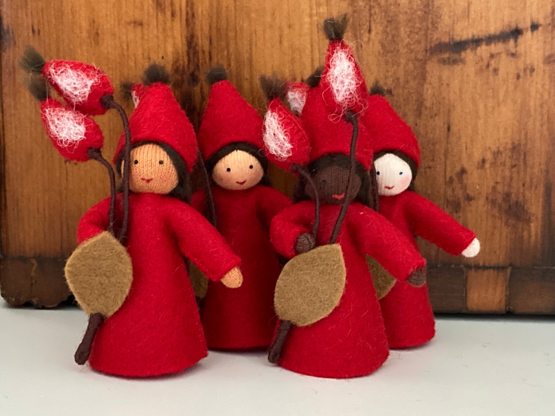 Les POUPÉES WALDORF DE LA FÉE DES FLEURS de Roumanie. Fabriqué à la main avec amour dans leur atelier d'une coopérative de femmes, Ambrosius Prodcom. Toutes leurs créations peuvent être autonomes, avec des bras pliables et mobiles. Quelques-unes des POUPÉES BABY FLOWER FAIRY ont également des jambes mobiles. Tous sont fabriqués avec des corps, des chapeaux et des fleurs en laine feutrée, avec un tricot de coton doux sur du fil cure-pipe. Les poils et le rembourrage sont en laine de mouton propre.