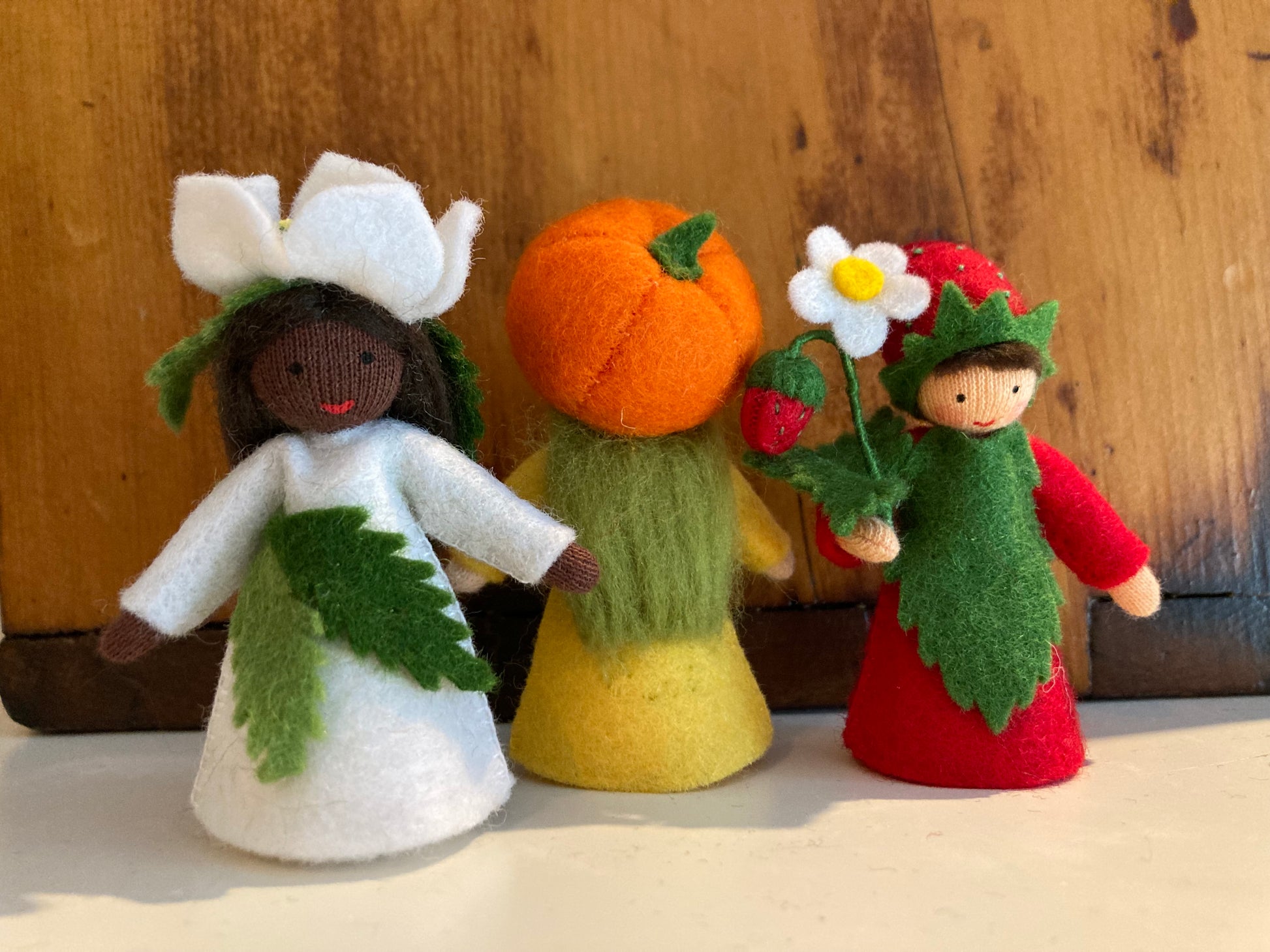 Les POUPÉES WALDORF DE LA FÉE DES FLEURS de Roumanie. Fabriqué à la main avec amour dans leur atelier d'une coopérative de femmes, Ambrosius Prodcom. Toutes leurs créations peuvent être autonomes, avec des bras pliables et mobiles. Quelques-unes des POUPÉES BABY FLOWER FAIRY ont également des jambes mobiles. Tous sont fabriqués avec des corps, des chapeaux et des fleurs en laine feutrée, avec un tricot de coton doux sur du fil cure-pipe. Les poils et le rembourrage sont en laine de mouton propre.