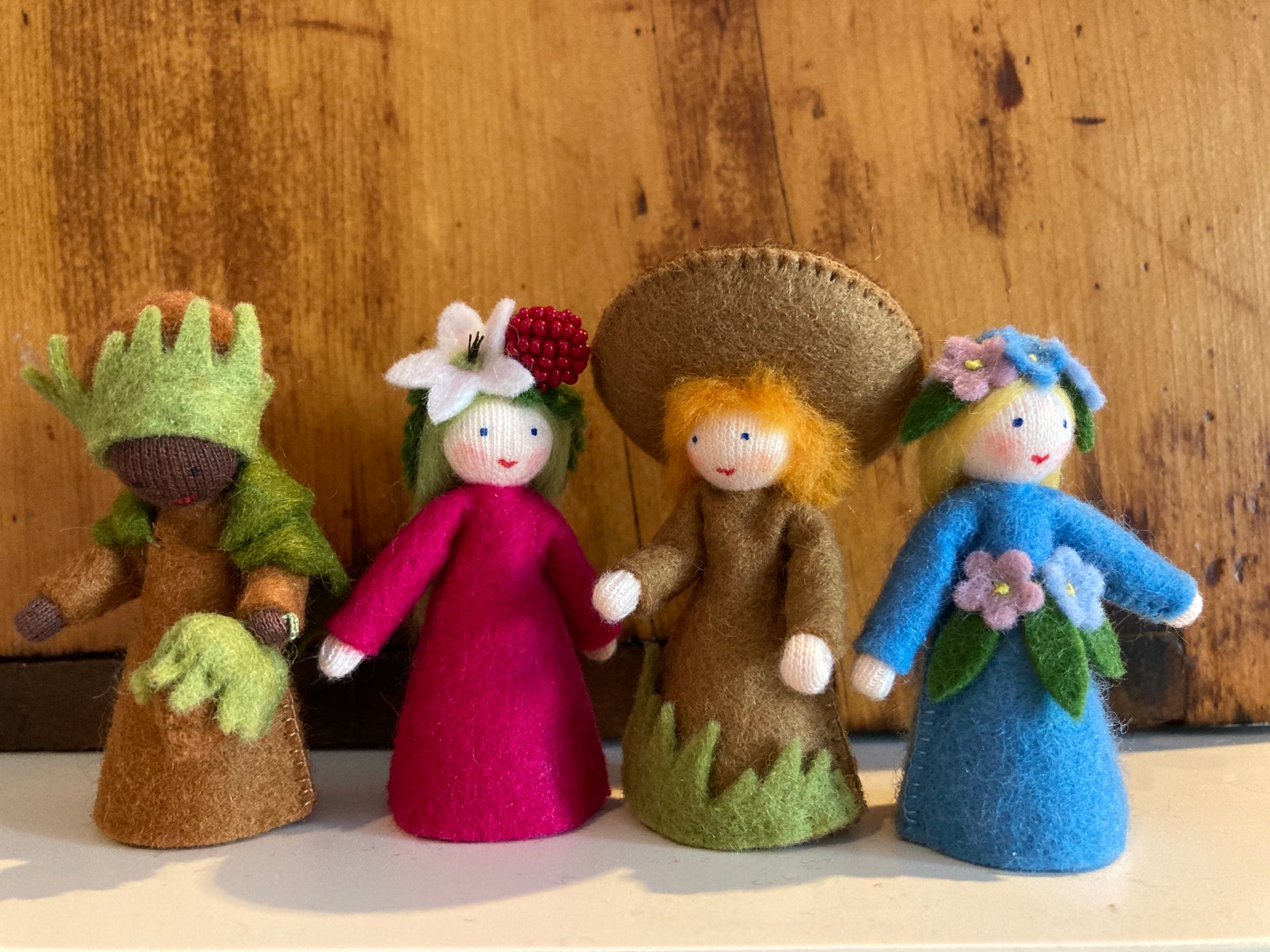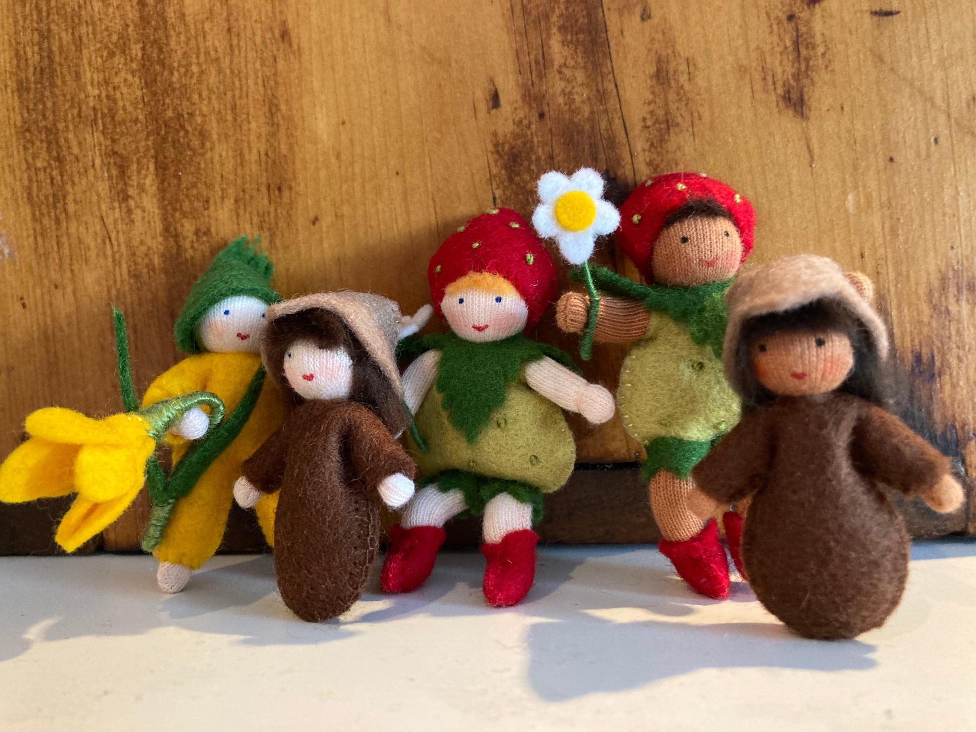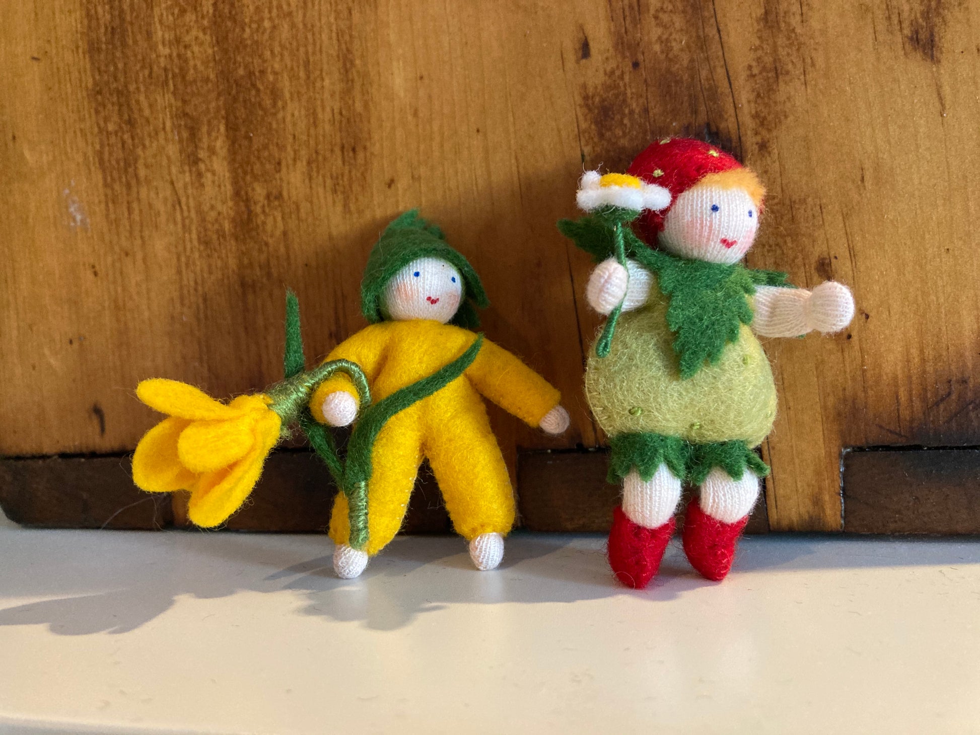 Les POUPÉES WALDORF DE LA FÉE DES FLEURS de Roumanie. Fabriqué à la main avec amour dans leur atelier d'une coopérative de femmes, Ambrosius Prodcom. Toutes leurs créations peuvent être autonomes, avec des bras pliables et mobiles. Quelques-unes des POUPÉES BABY FLOWER FAIRY ont également des jambes mobiles. Tous sont fabriqués avec des corps, des chapeaux et des fleurs en laine feutrée, avec un tricot de coton doux sur du fil cure-pipe. Les poils et le rembourrage sont en laine de mouton propre.