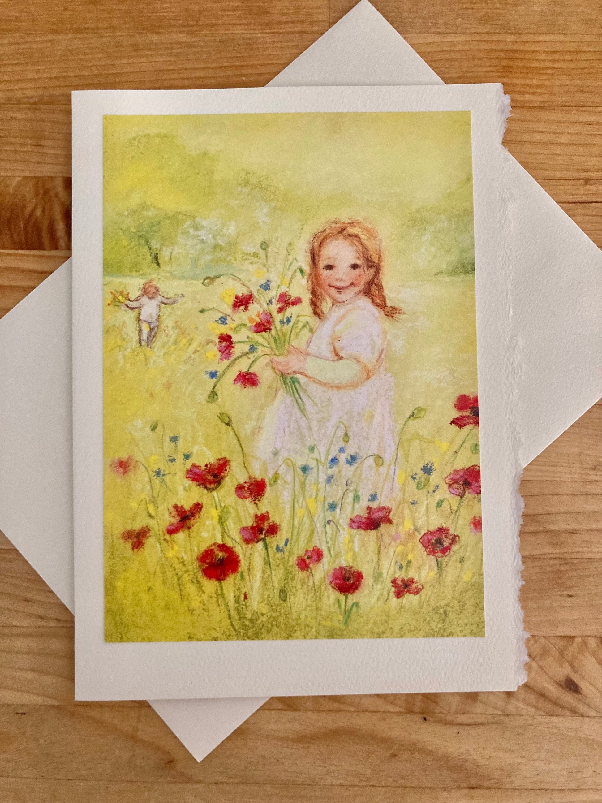 Belle œuvre d’art originale sur du papier cartonné de haute qualité. Ivoire avec bordure frangée, avec enveloppe assortie. Taille standard de la carte de vœux 5x7 pouces. Vide à l’intérieur.