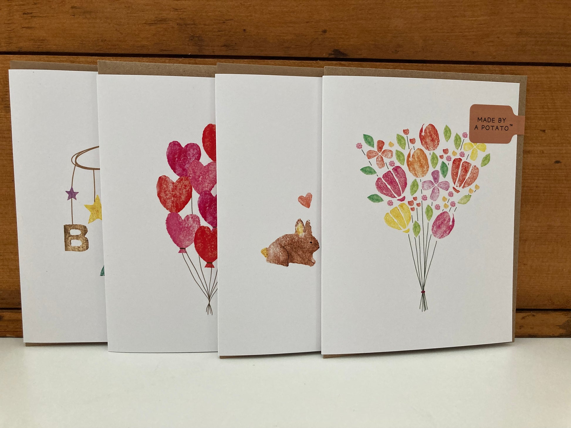 Chacun de leurs modèles de cartes est réalisé à partir d’une pomme de terre. Les pommes de terre réelles sont soigneusement gravées dans les tampons utilisés pour chaque motif, puis des impressions sont réalisées à partir de l'œuvre d'art originale. Toutes les enveloppes sont fabriquées avec des matériaux 100 % recyclés.