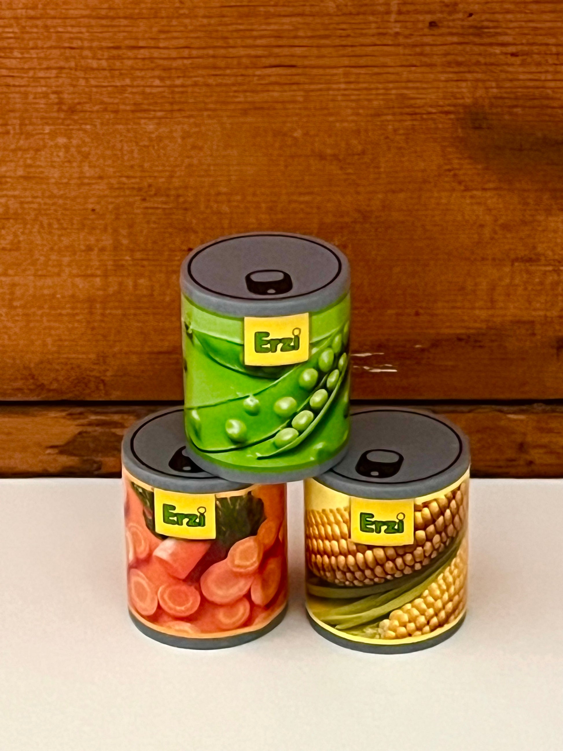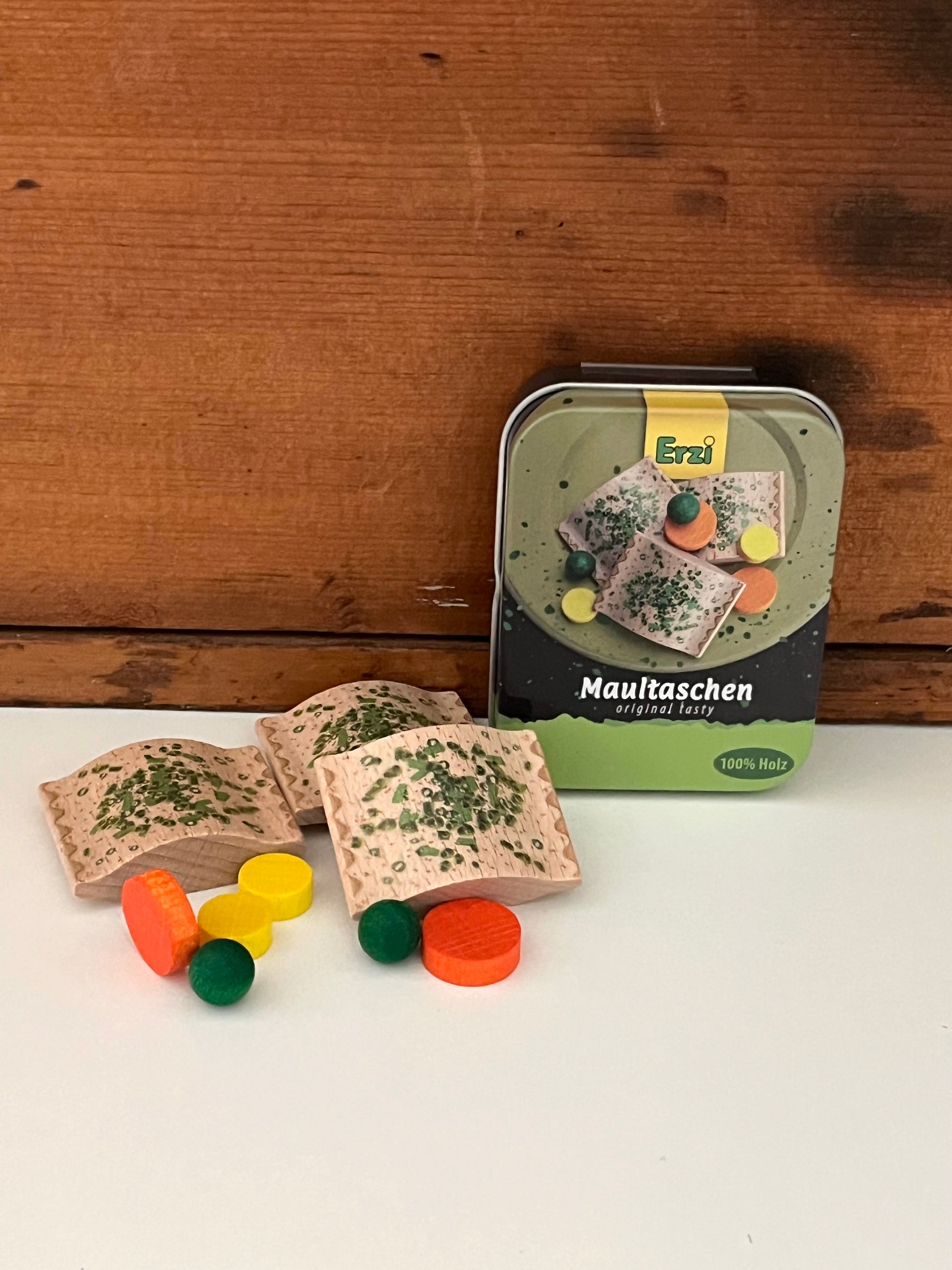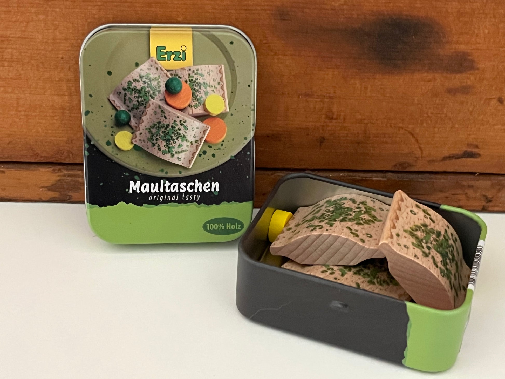 A filling main course of RAVIOLI AND VEGGIES, by Erzi Toys, featuring 3 wooden pasta squares (filled with meat or cheese), and a side of veggies, peas, sweetcorn and carrots, in a keepsake tin. This play food ravioli tin is perfect for imaginative play, stocking up the play shop or kitchen.