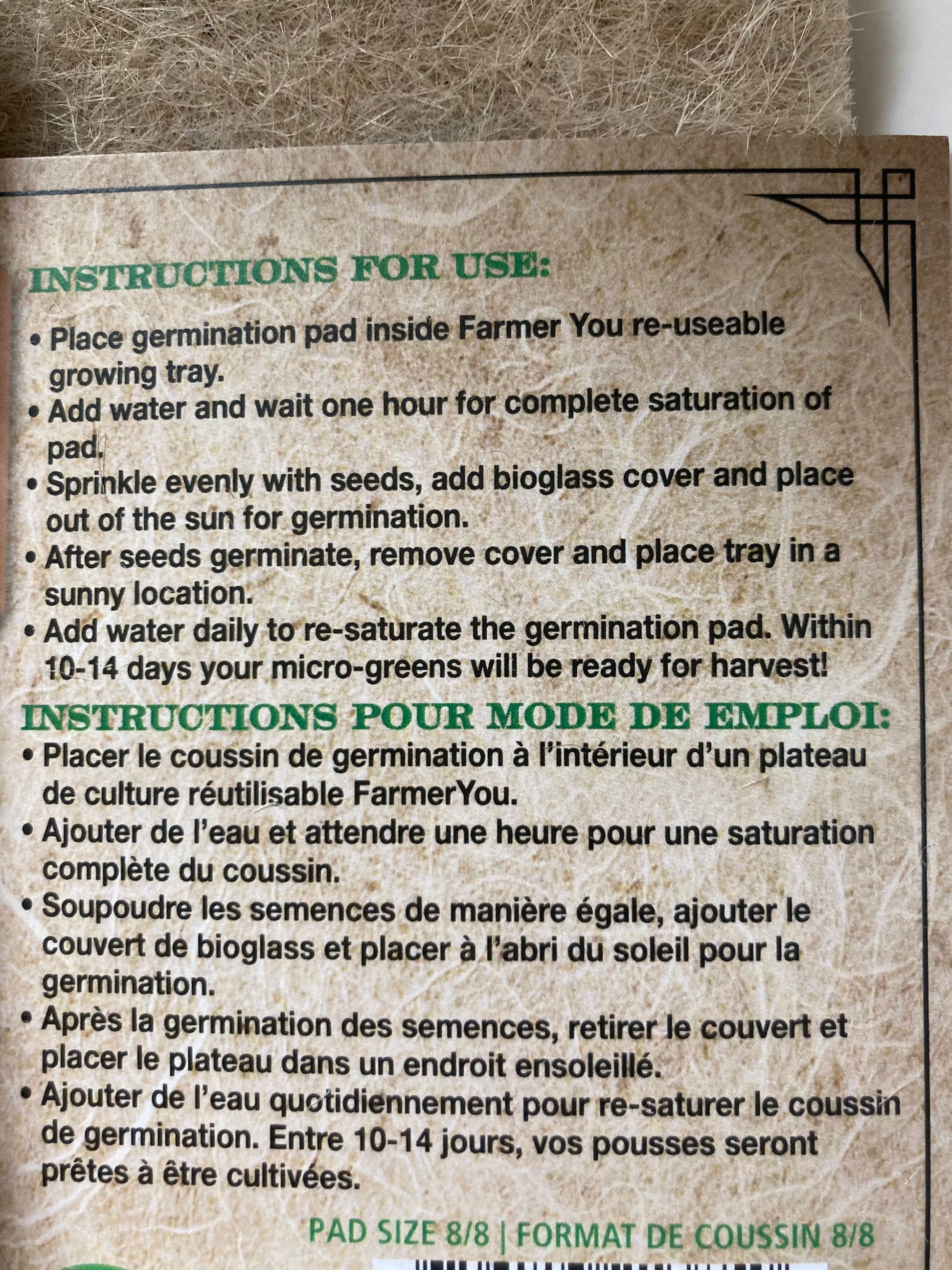 Instructions faciles : mouillez le tampon de germination et attendez 1 heure pour une saturation complète. Étalez vos graines germées sur un tampon humide. Couvrez avec le couvercle transparent inclus... Arrosez quotidiennement et attendez ! Il est conseillé de le placer à l'abri de la lumière directe du soleil jusqu'à la germination.
