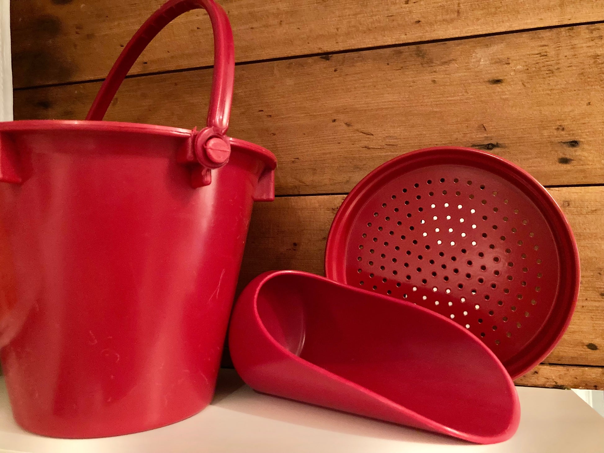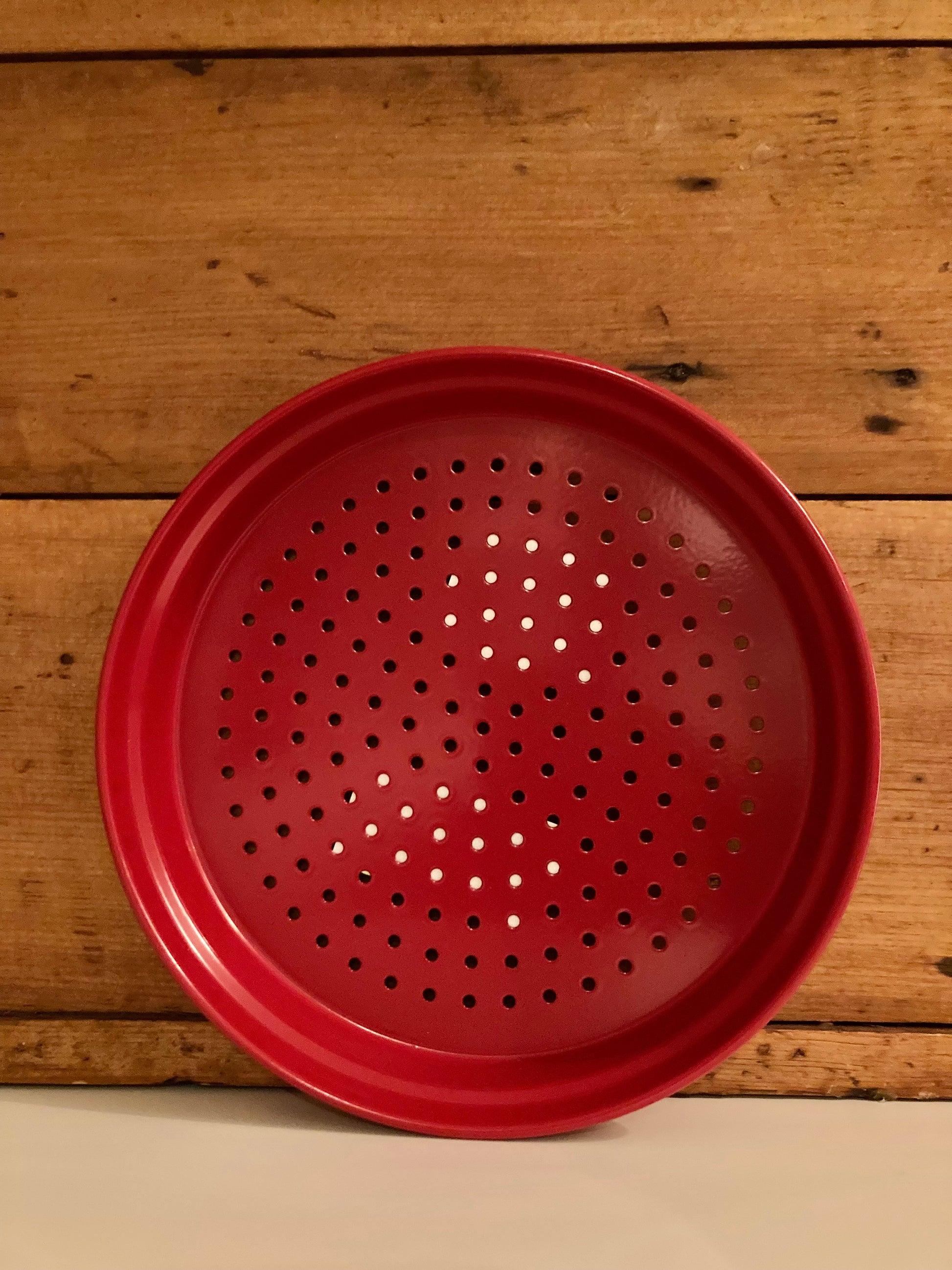 Tamis à sable rouge JARDIN en métal pour enfant par Gluckskafer Toys.