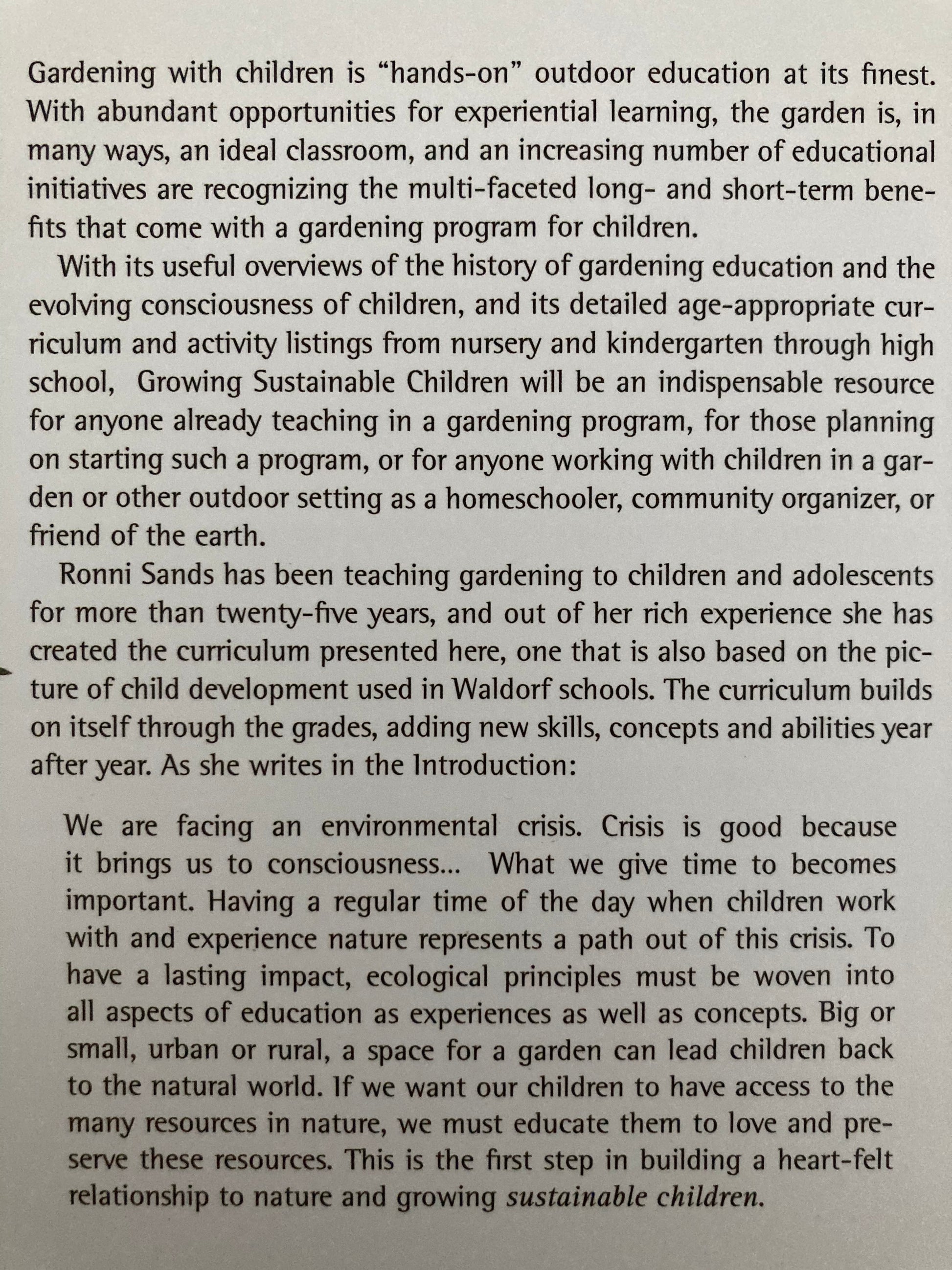 L'auteur Ronni Sands enseigne le jardinage aux enfants depuis vingt-cinq ans. Ayant travaillé en étroite collaboration avec le programme de l'école Waldorf, elle souligne la nécessité et la grande valeur d'apprendre aux enfants à jardiner. "Nous sommes confrontés à une crise environnementale... et l'expérience de la nature et ses impacts écologiques doivent être intégrés dans les programmes scolaires." Son co-auteur est Willow Sands, militante des fermes et jardins urbains et auteur de The Essential Urban Farmer.