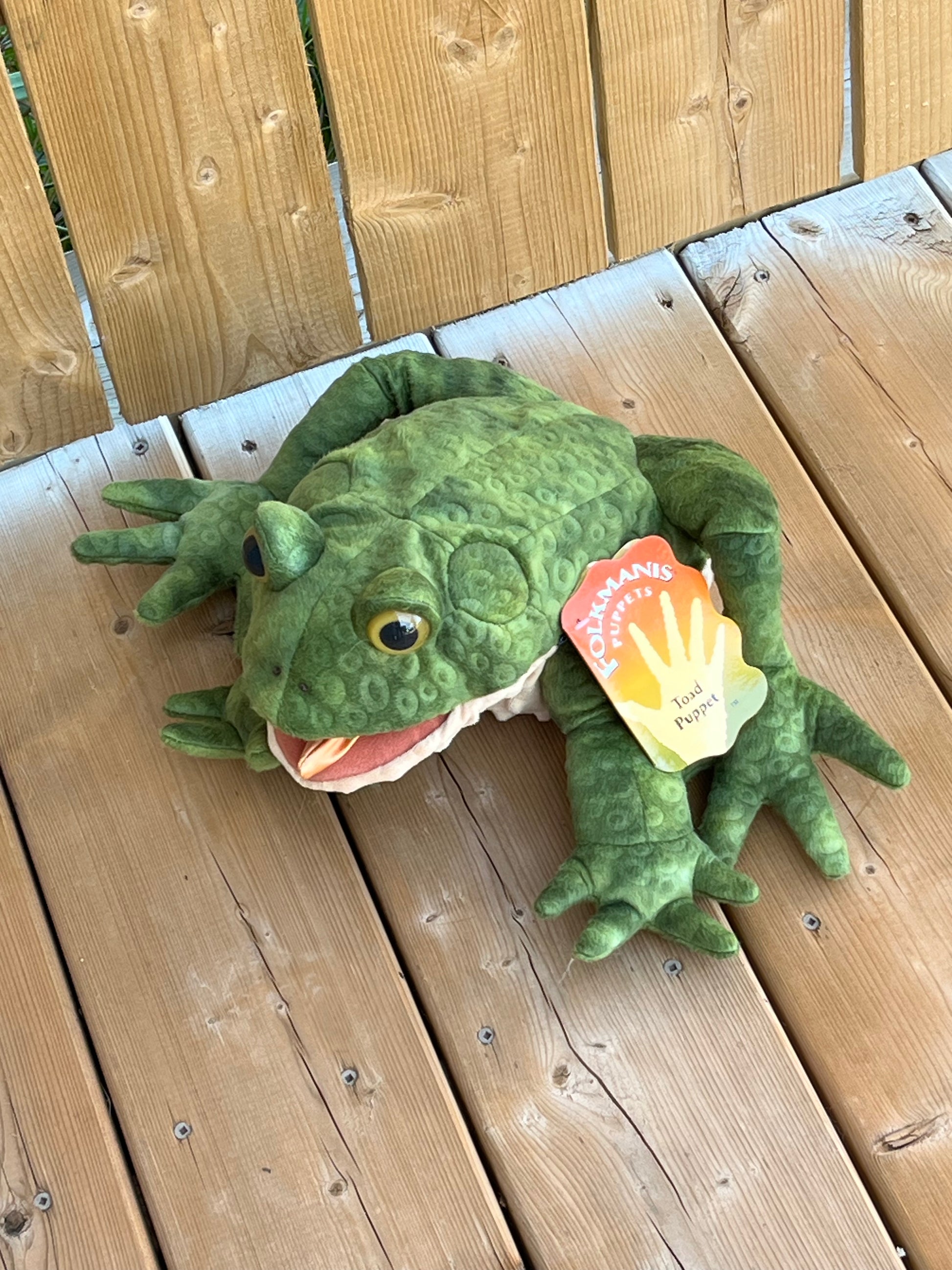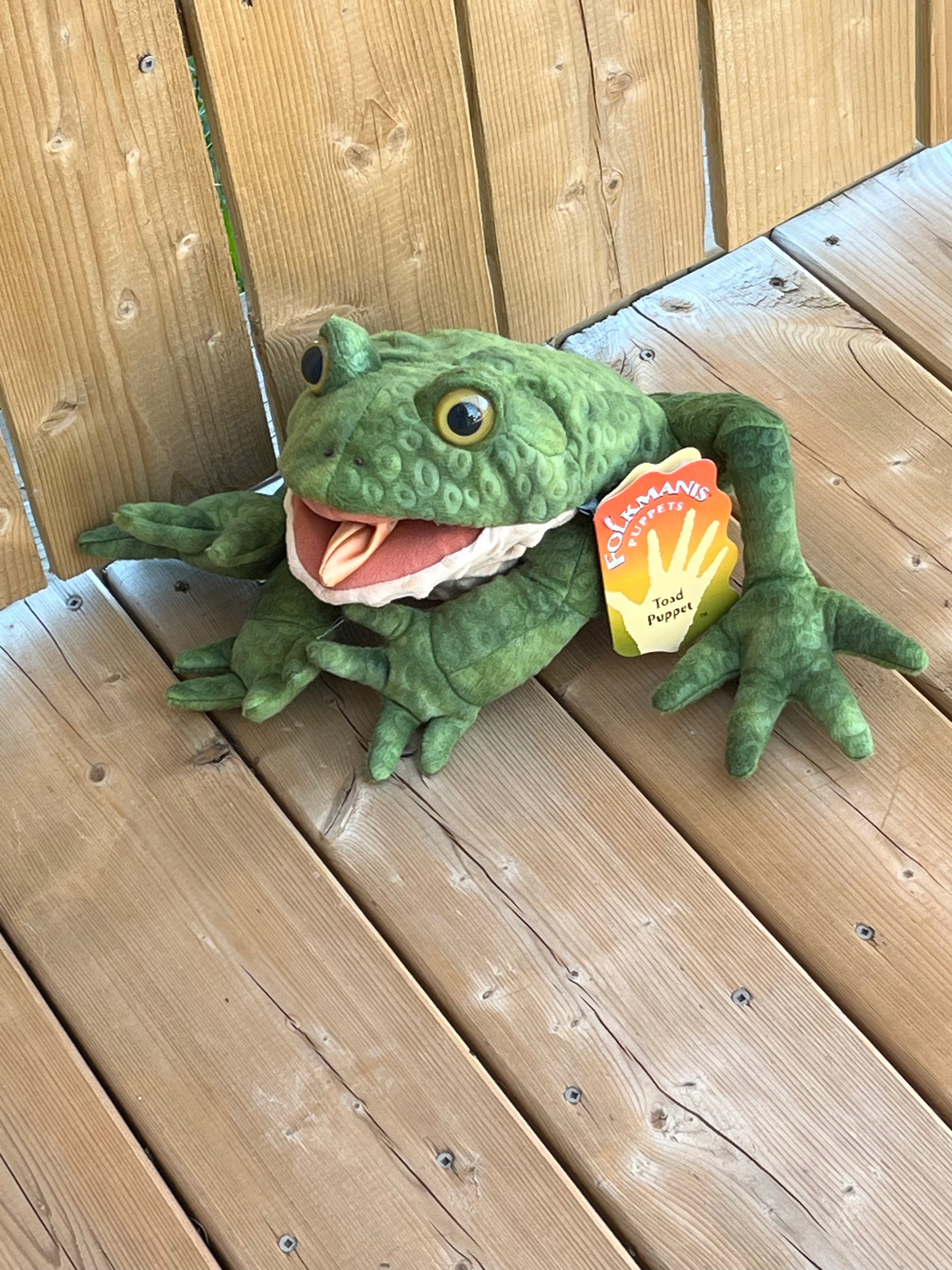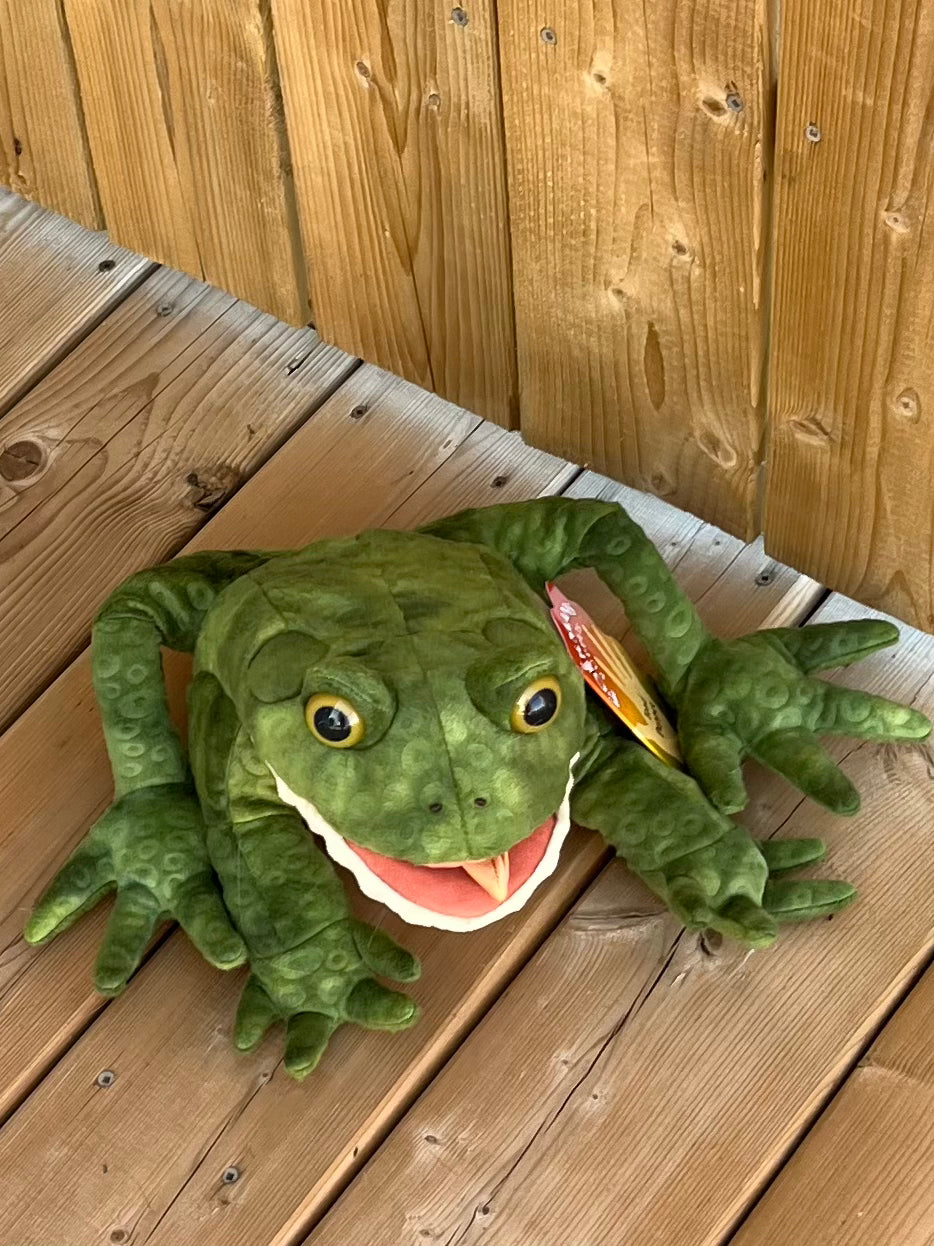 Here is the fantastic large GREEN TOAD Hand PUPPET. Fun Fact: TOADS are land amphibians, very rarely going into water, although they like to live in moist environments and catch small bugs with their large tongues! Your hand puppet Toad can do the same!