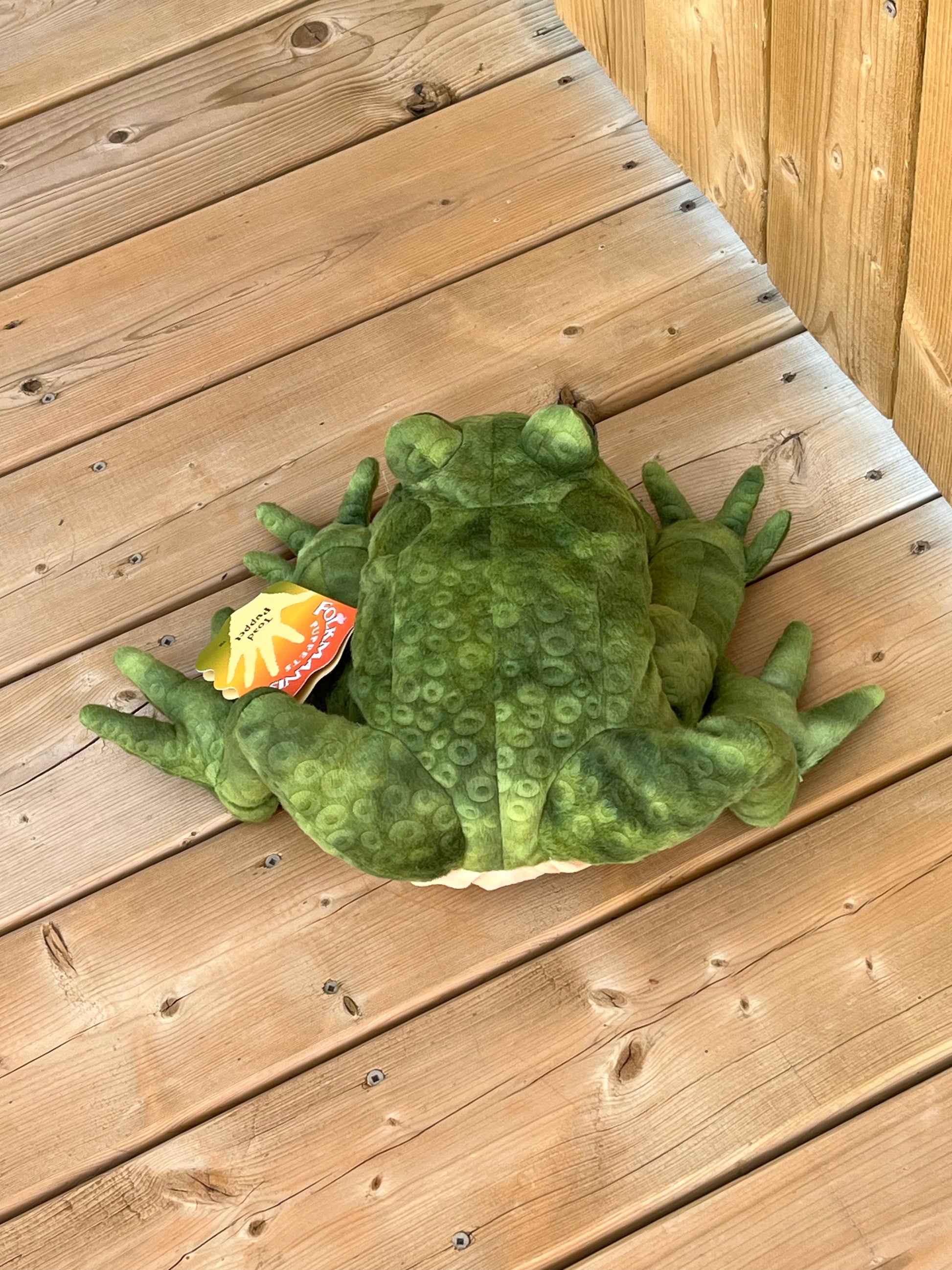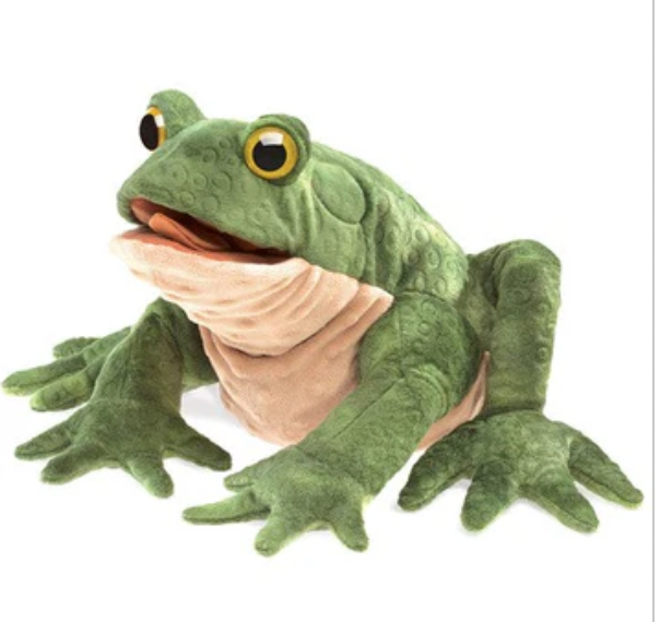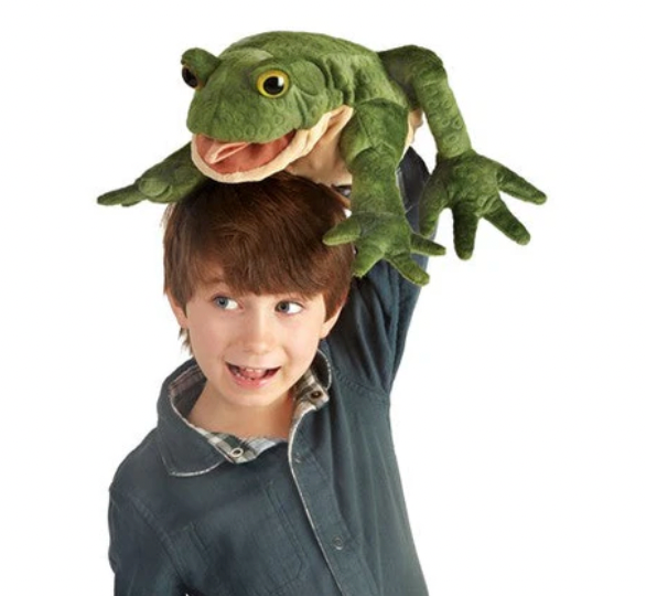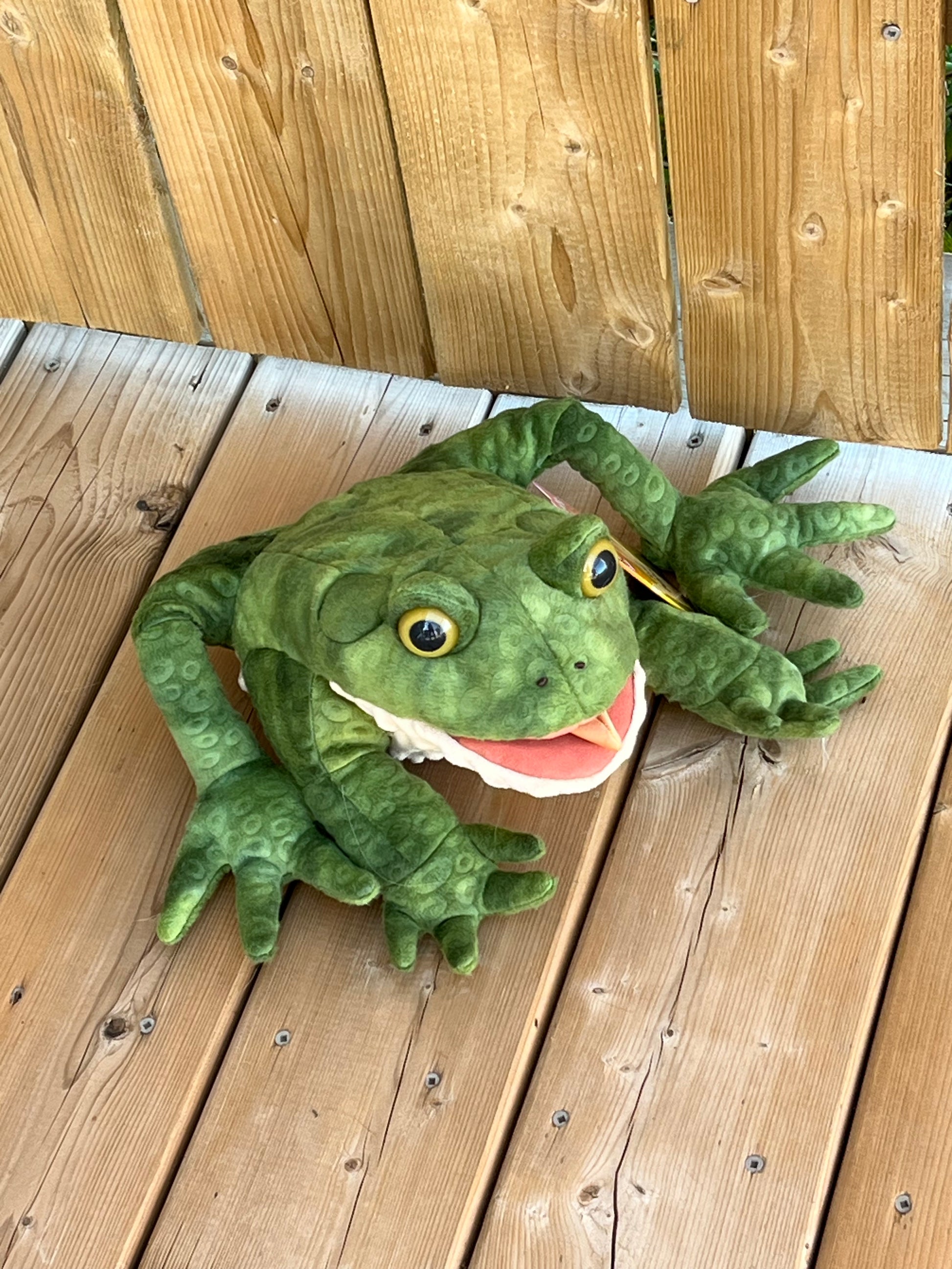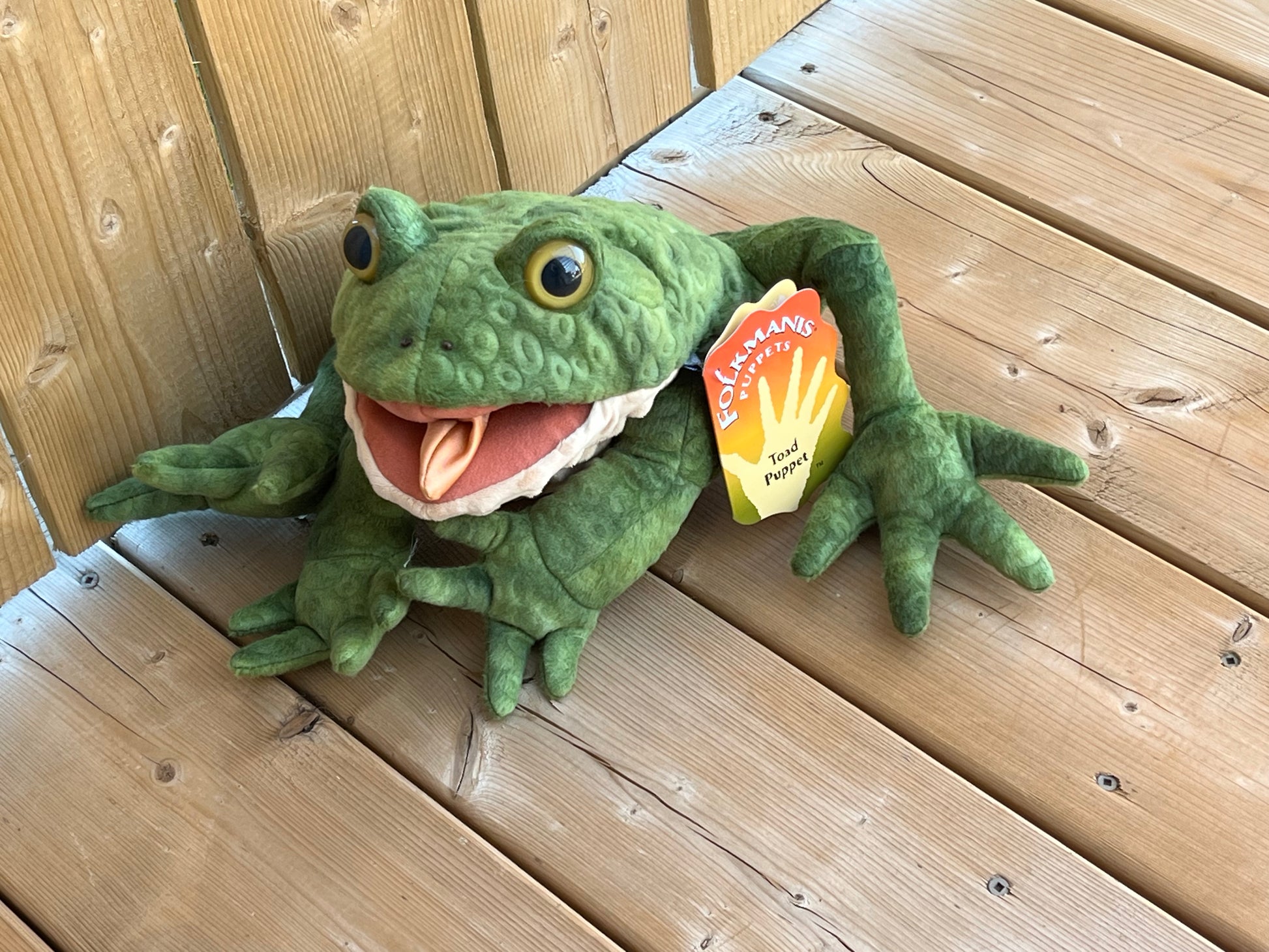 Here is the fantastic large GREEN TOAD Hand PUPPET. Fun Fact: TOADS are land amphibians, very rarely going into water, although they like to live in moist environments and catch small bugs with their large tongues! Your hand puppet Toad can do the same!