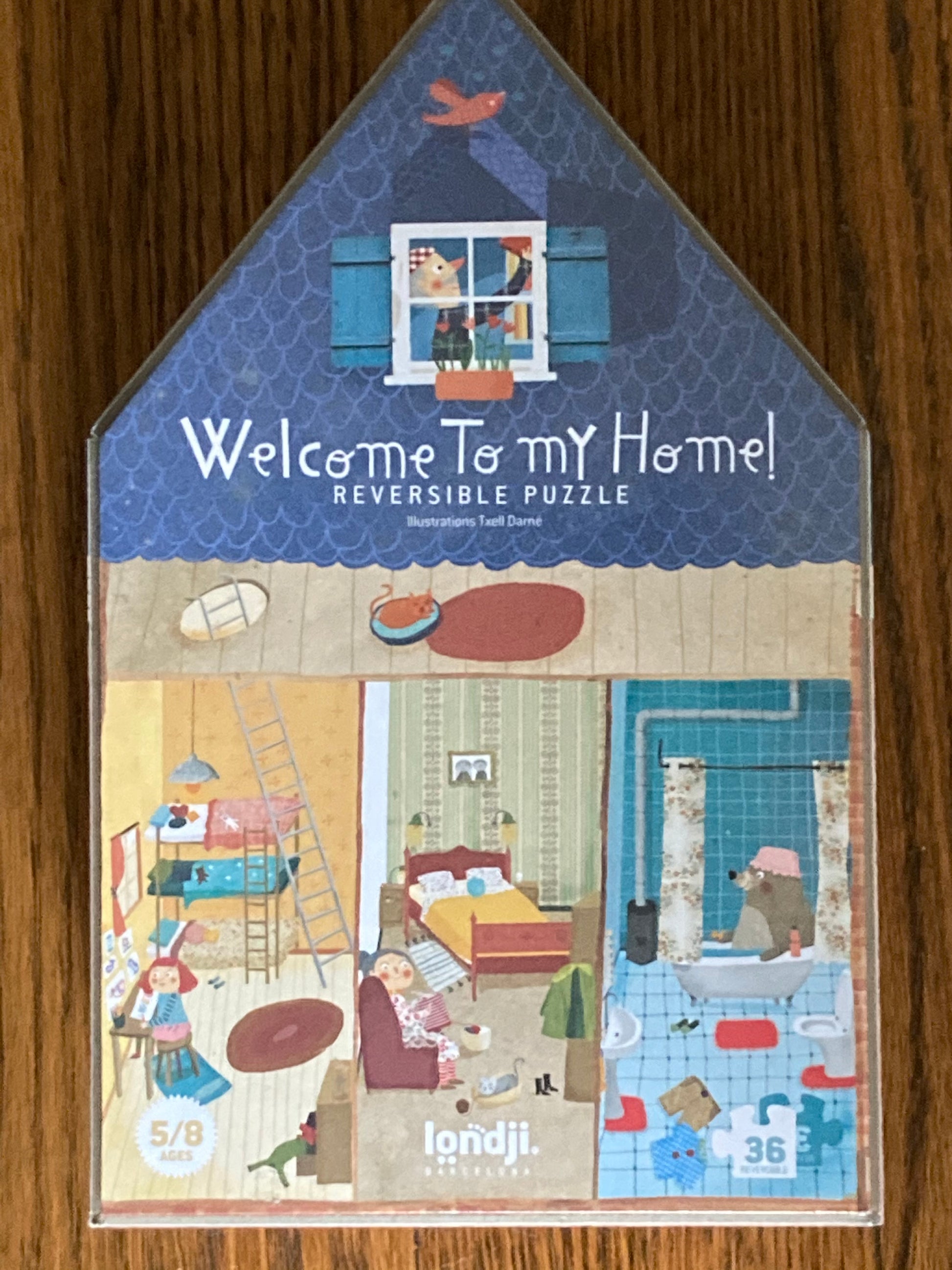 BIENVENUE CHEZ MA MAISON - PUZZLE RÉVERSIBLE. Un puzzle grand format, composé de 36 grosses pièces. Le puzzle fini mesure 26x47 cm (10x18,5 pouces). Facile et captivant à assembler par les enfants eux-mêmes... ou avec un peu d'aide !