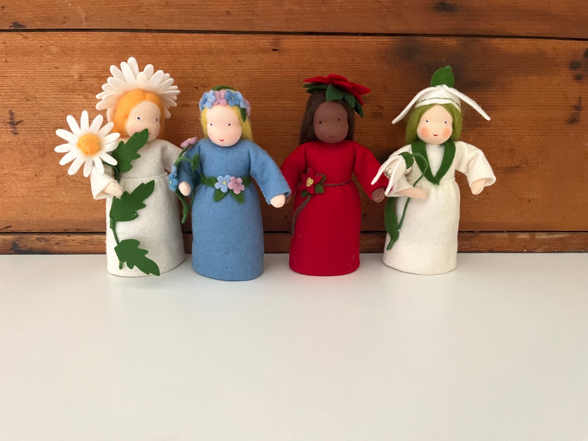 Leurs bras sont mobiles, mais leurs robes, casquettes et coiffes fleuries ne sont pas amovibles. Ils sont fabriqués à la main à partir de feutre 100 % laine, de molleton de laine et de tricot de coton.