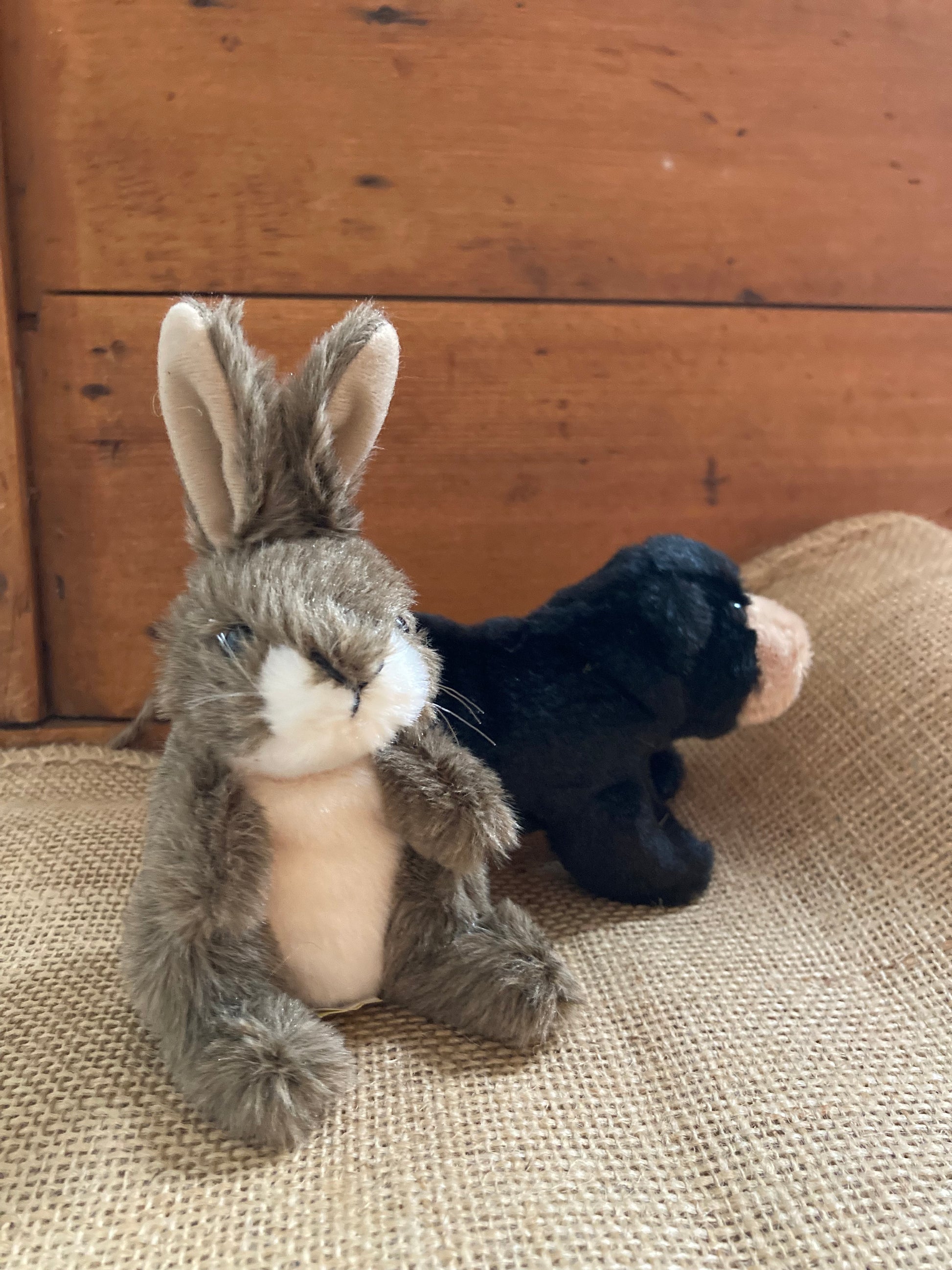 Voici la MARIONNETTE À DOIGTS MINI OURS NOIR. Fait amusant : Les OURS NOIRS se trouvent dans toutes les provinces et territoires du Canada... à l'exception de l'Île-du-Prince-Édouard. Et les baies sont leur aliment préféré !