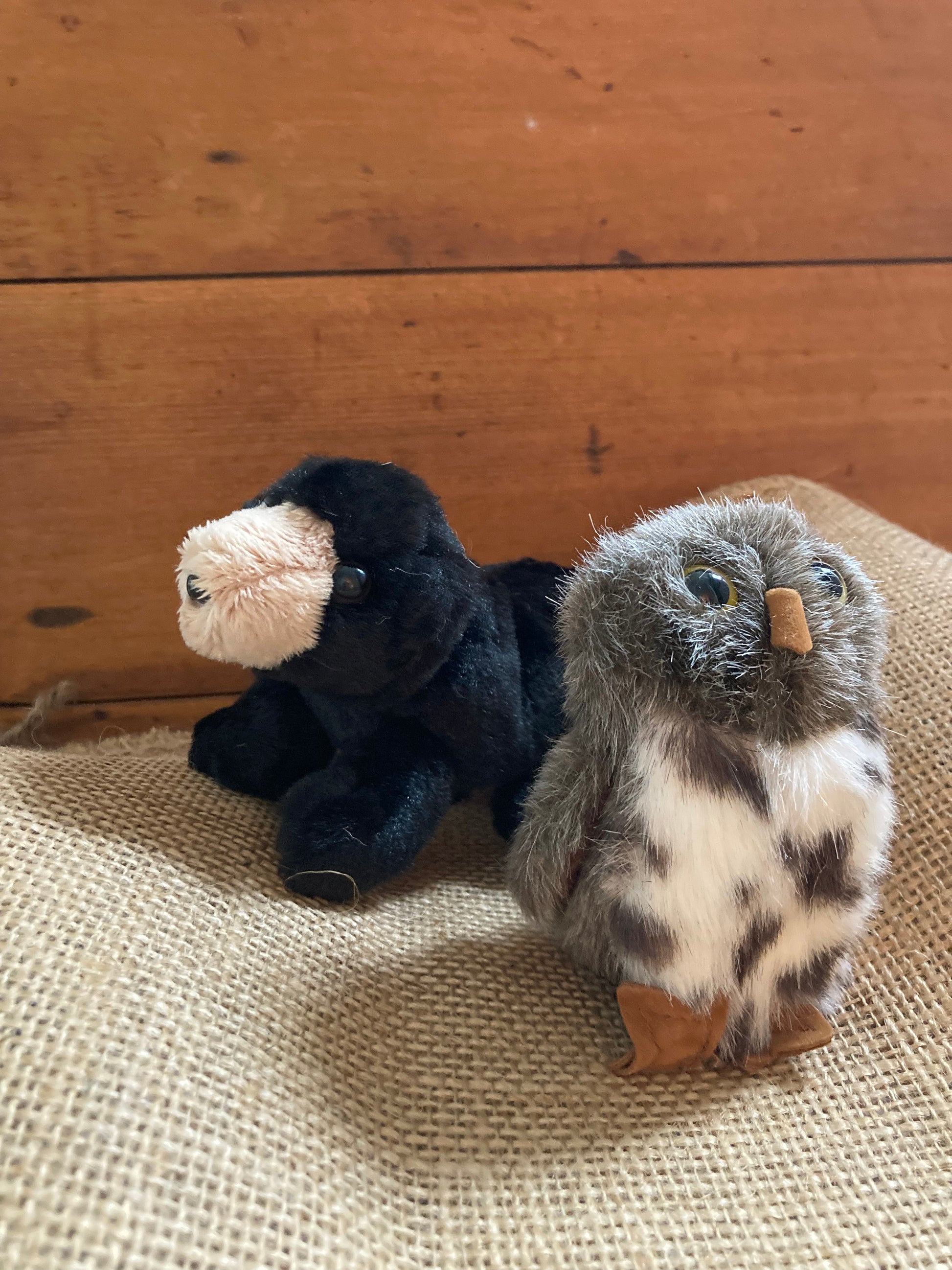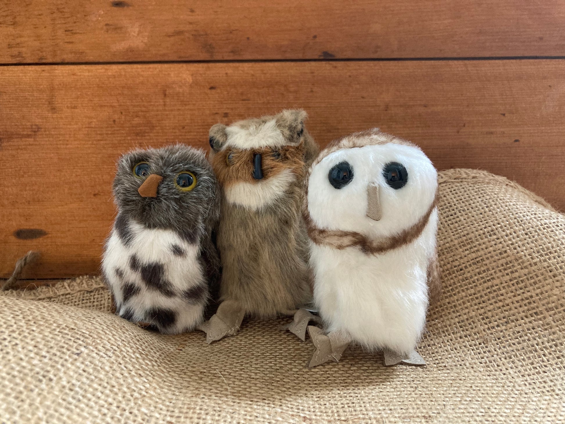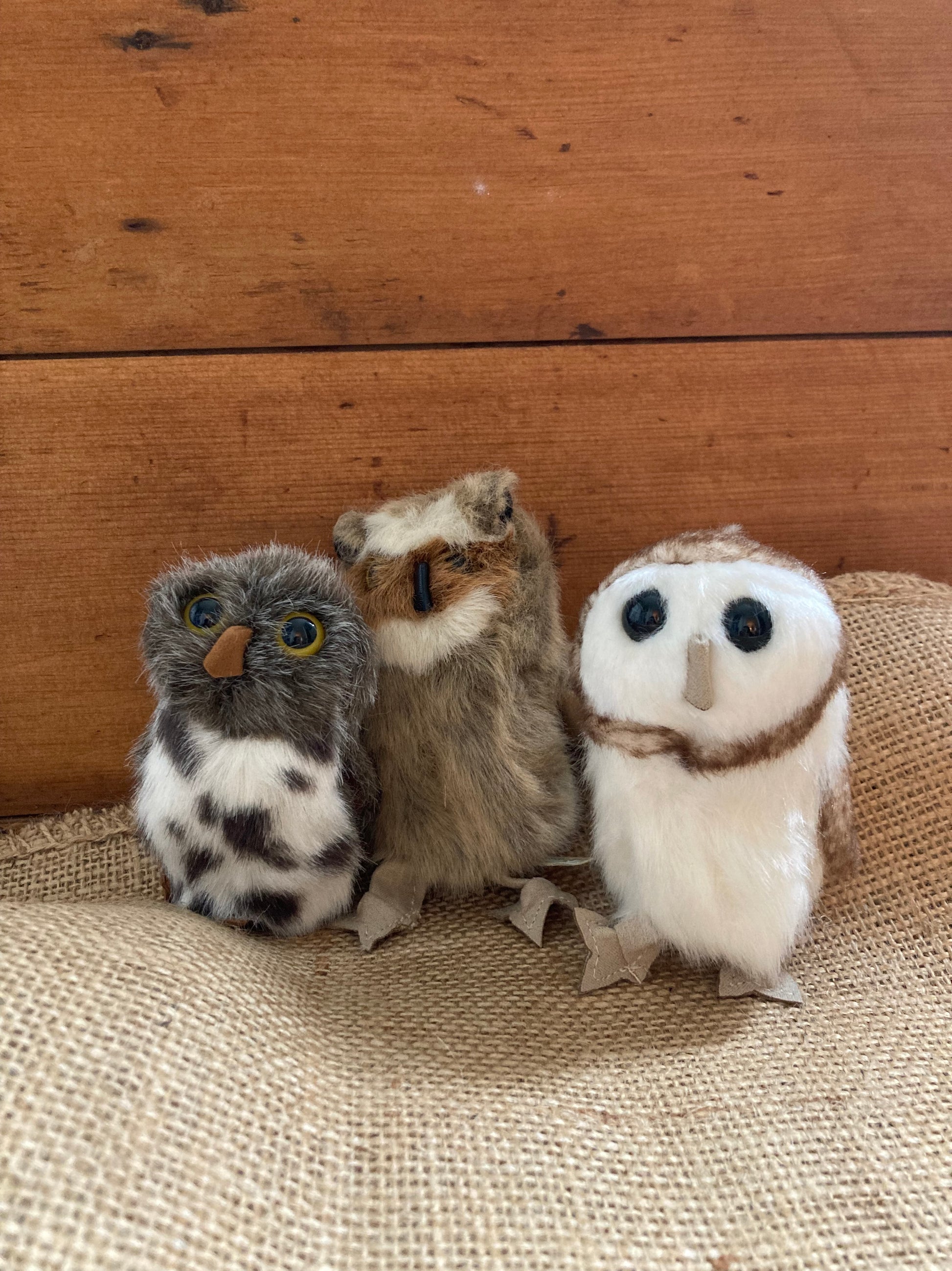 Voici la MINI CHOUETTE TACHÉE MARIONNETTE À DOIGTS. Fait amusant : Au Canada, les CHOUETTES POINTÉES ne peuvent être trouvées que dans les bois du sud de la Colombie-Britannique. Ils sont beaucoup, beaucoup plus petits que la chouette d'Amérique (montrée ici à côté de la chouette effraie également !)