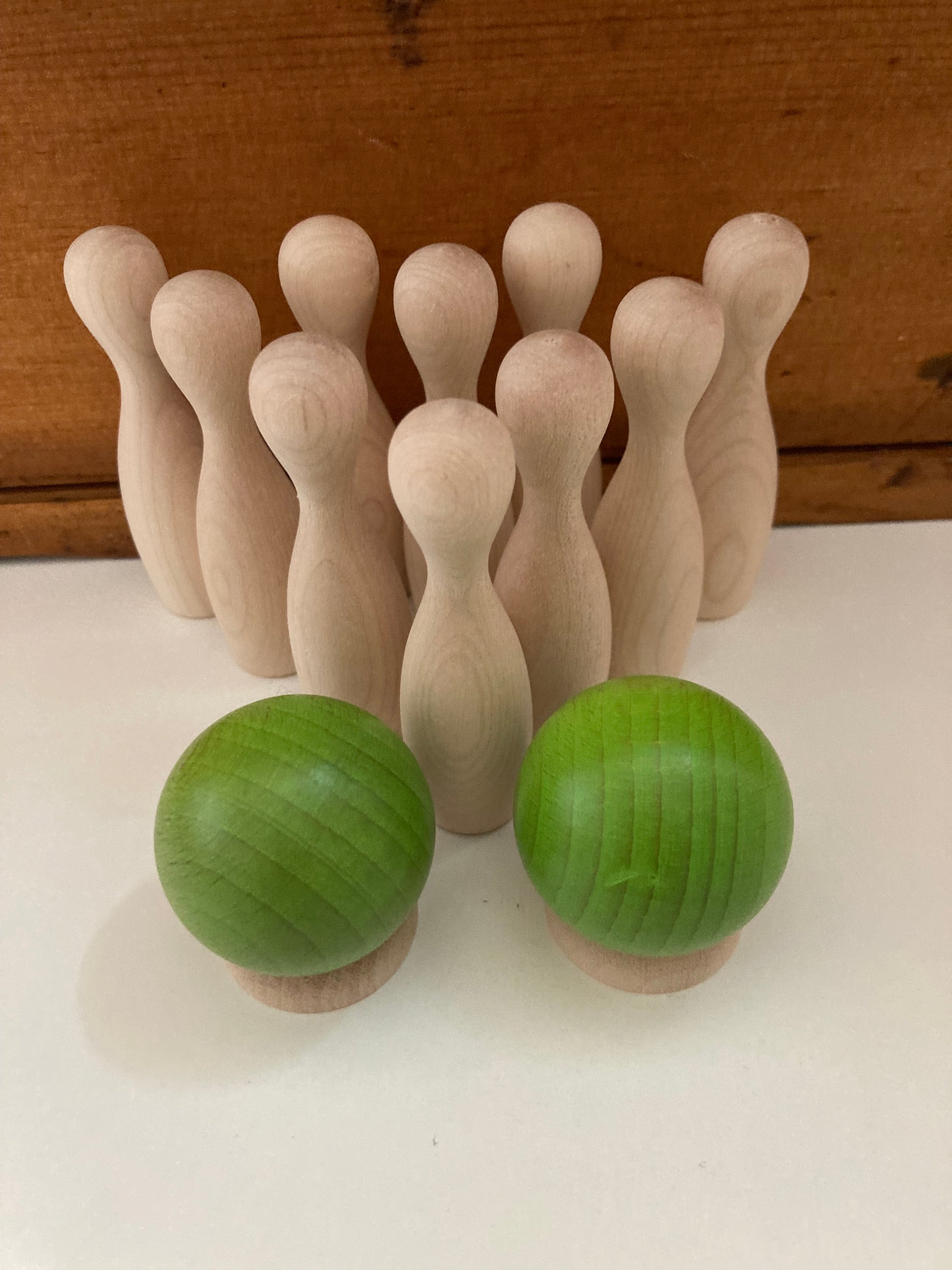 INSIDE WOODEN MINI BOWLING comprend 10 quilles en bois d'érable mesurant 7 cm (3 pouces) de hauteur et 2 boules de bowling en bois vert avec 2 supports de maintien et des instructions.