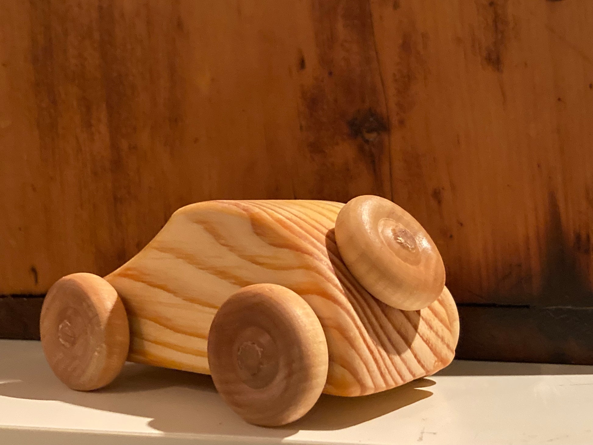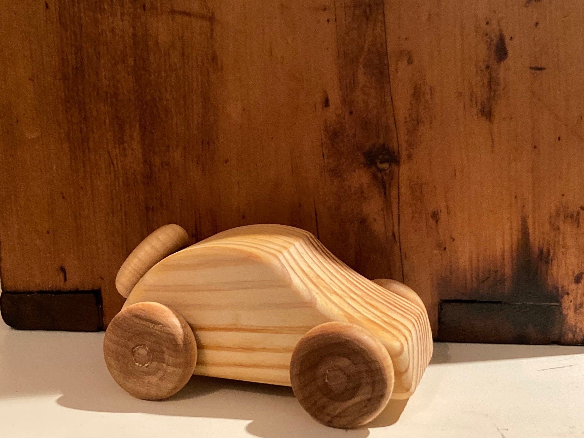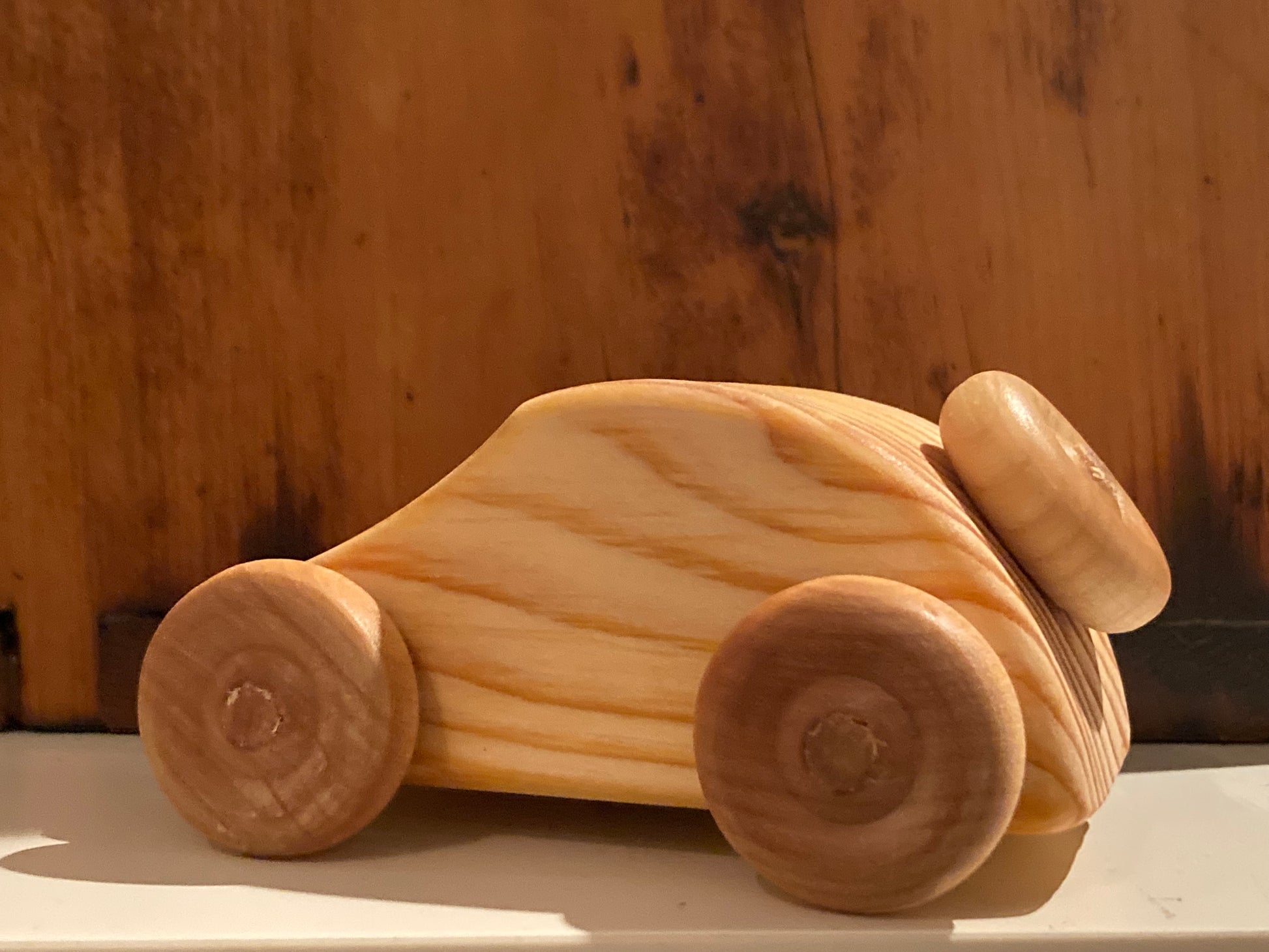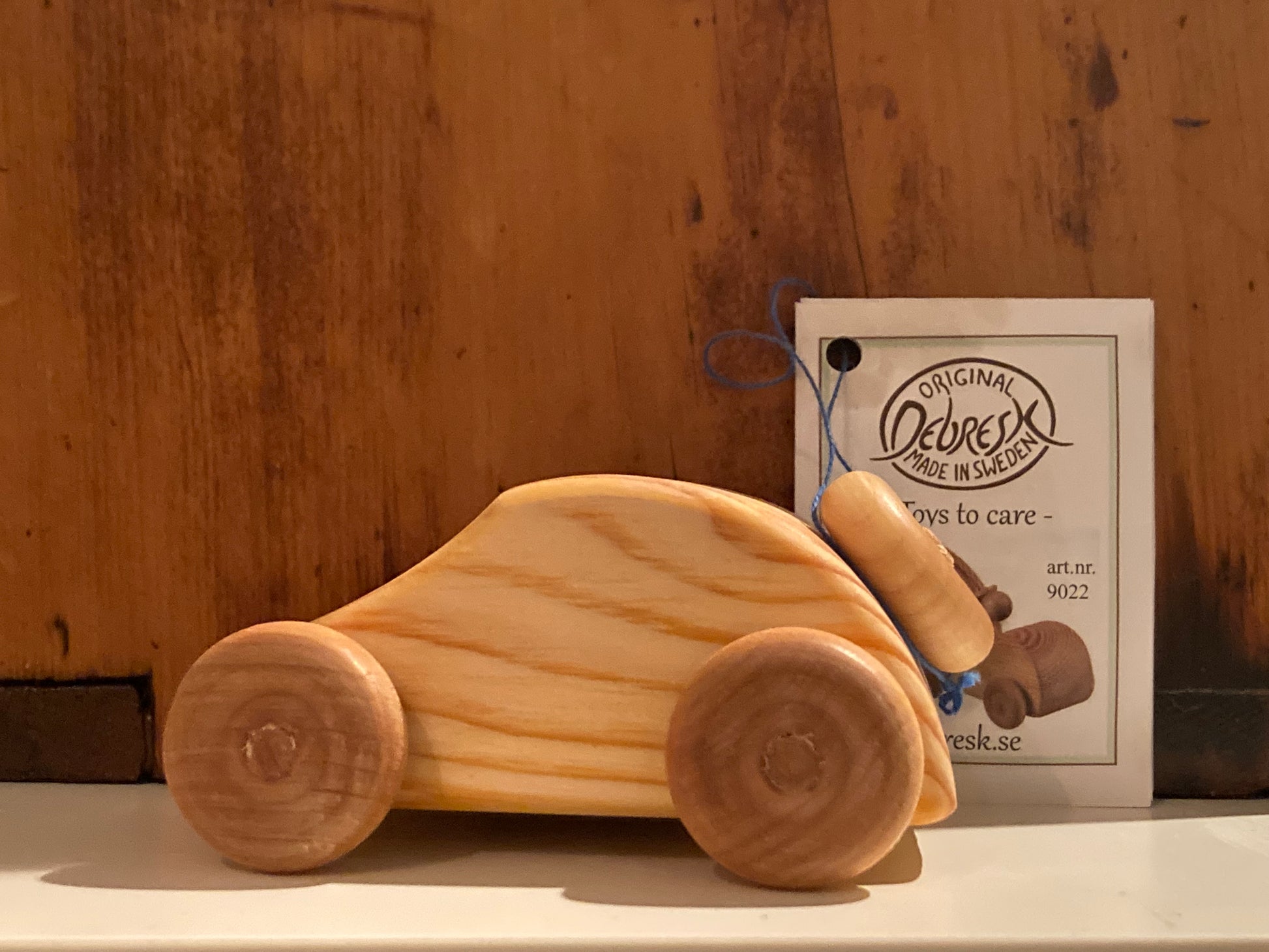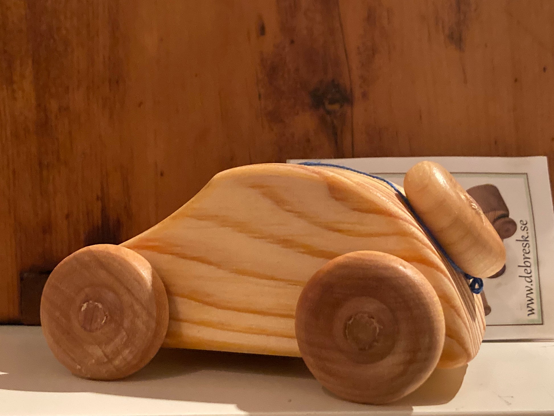 Jouets en bois de qualité de l'atelier Debresk en Suède. Des jouets en bois massif qui dureront toute une enfance de jeu. C'est leur PETITE VOITURE Ragtop, avec des roues qui tournent vraiment !