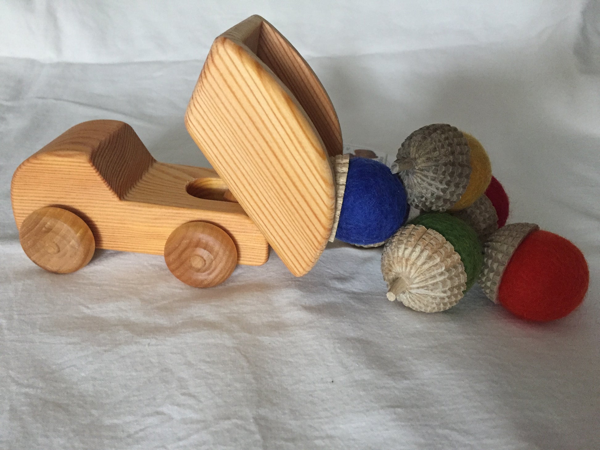 Recherchez le tracteur Debresk en bois avec wagon , grand camion-benne et niveleuse, disponibles, vendus séparément. Glands feutrés également disponibles et également vendus séparément.